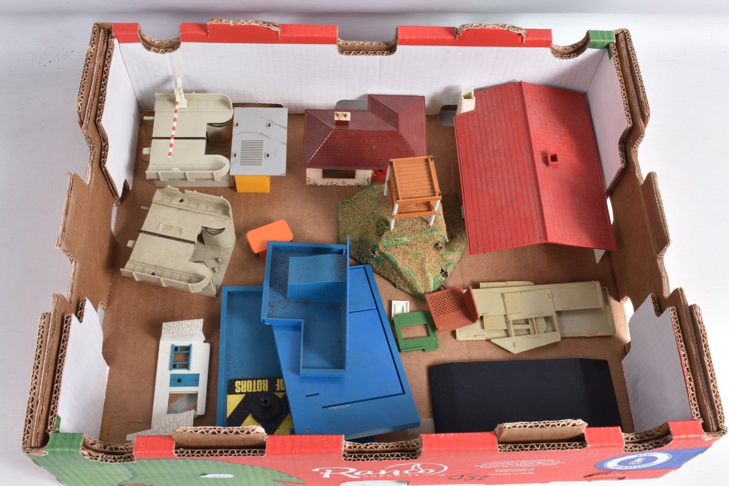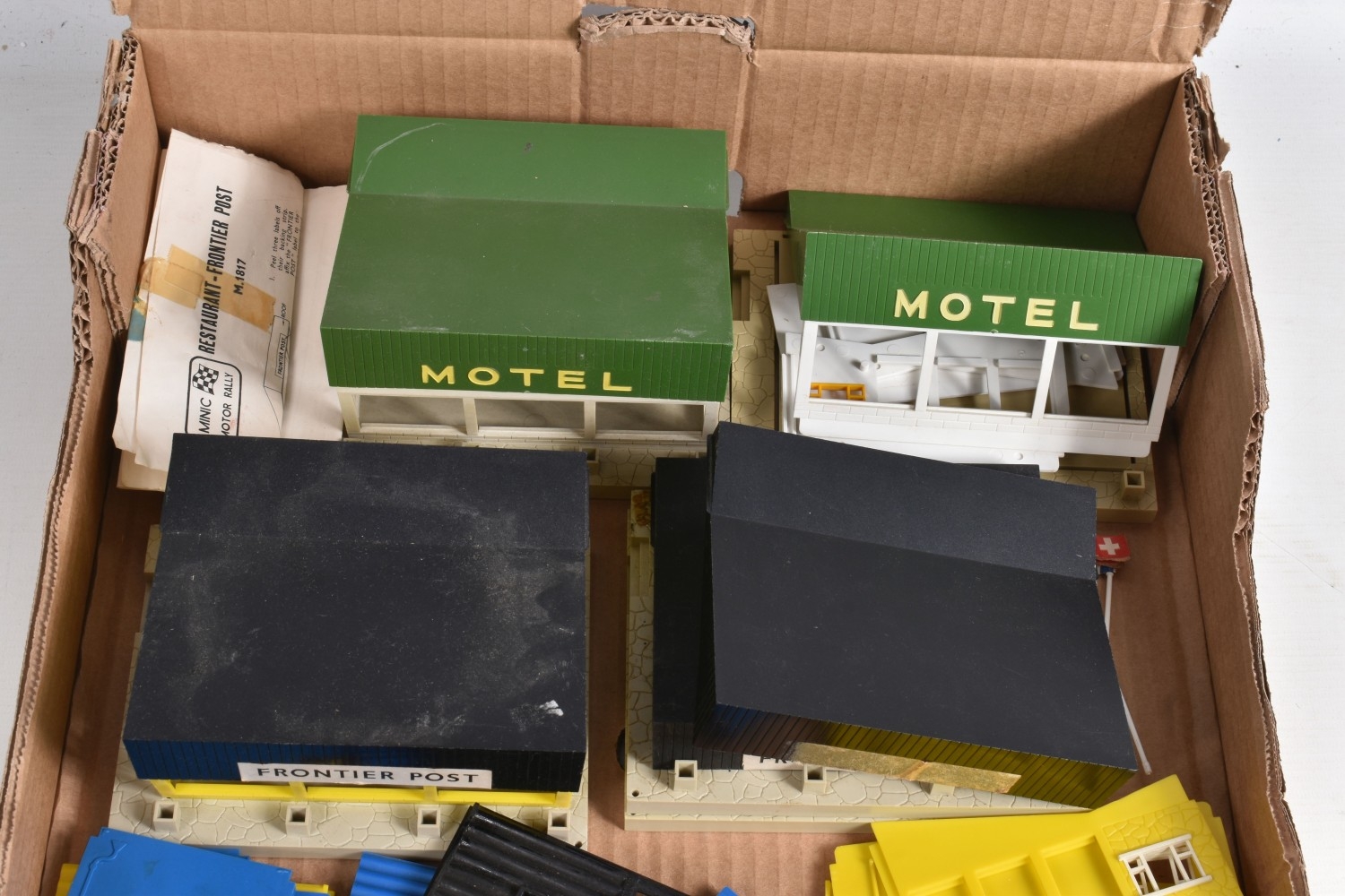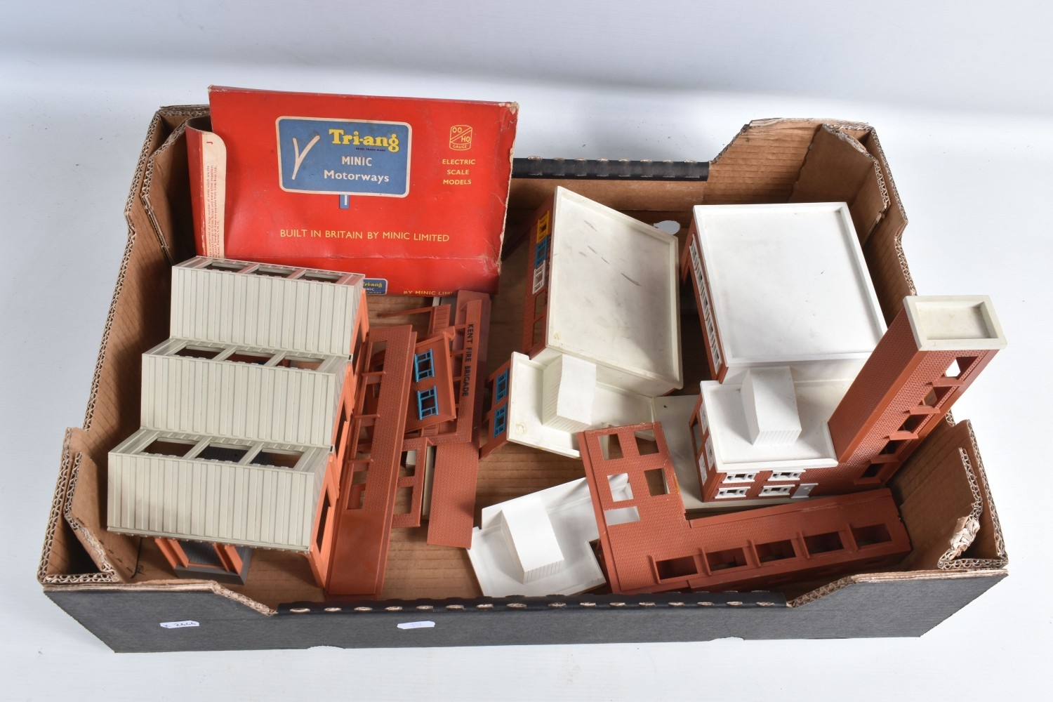 A QUANTITY OF UNBOXED ASSORTED TRI-ANG MINIC MOTORWAYS BUILDINGS AND ACCESSORIES, contents not checked, all in playworn condition, mixture of part built examples and parts, some with damage and wear, missing many of the smaller parts windows and glazing etc., buildings to include Railway Goods Shed with damaged box, No.M1808, Fire Station, No.M1804, Drive Through Building, No.M2003, Drive Through Building/Heliport, No.M1811, Frontier Post, No.M1817, Motel Restaurant, No.M1813, 2 x Car Loading Ramp, No.RM921, Bungalow with Garage, No.M1806, also includes buildings by Corgi, Matchbox, Airfix and Subbuteo (3 boxes)