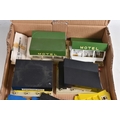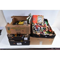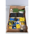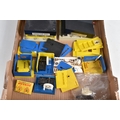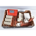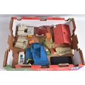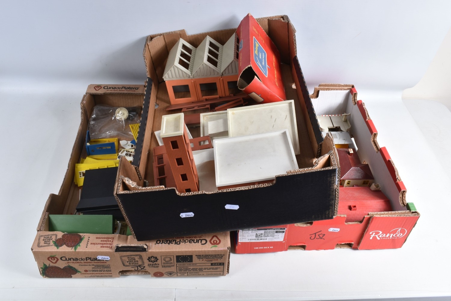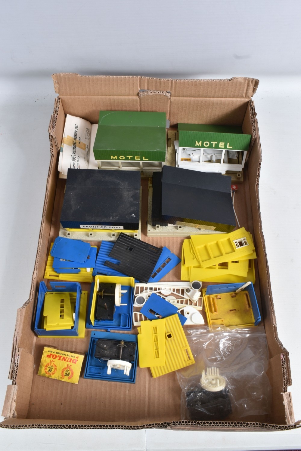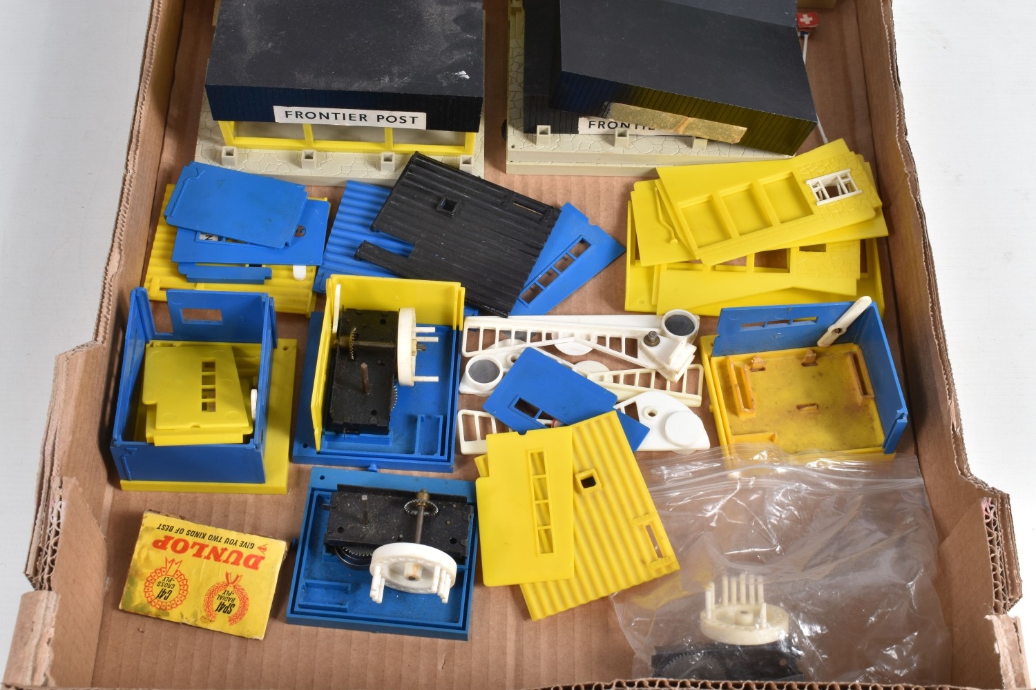 A QUANTITY OF UNBOXED ASSORTED TRI-ANG MINIC MOTORWAYS BUILDINGS AND ACCESSORIES, contents not checked, all in playworn condition, mixture of part built examples and parts, some with damage and wear, missing many of the smaller parts windows and glazing etc., buildings to include Railway Goods Shed with damaged box, No.M1808, Fire Station, No.M1804, Drive Through Building, No.M2003, Drive Through Building/Heliport, No.M1811, Frontier Post, No.M1817, Motel Restaurant, No.M1813, 2 x Car Loading Ramp, No.RM921, Bungalow with Garage, No.M1806, also includes buildings by Corgi, Matchbox, Airfix and Subbuteo (3 boxes)