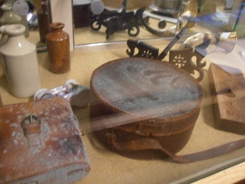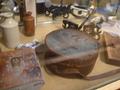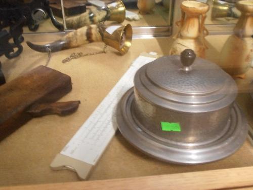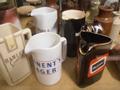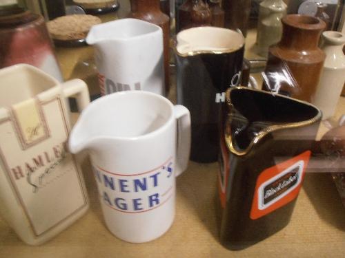 MIXED LOT TO INCLUDE SLIDE RULE, HORN WITH BRASS EDGING, PUB ADVERTISING JUGS, BYGONE PLANE ETC