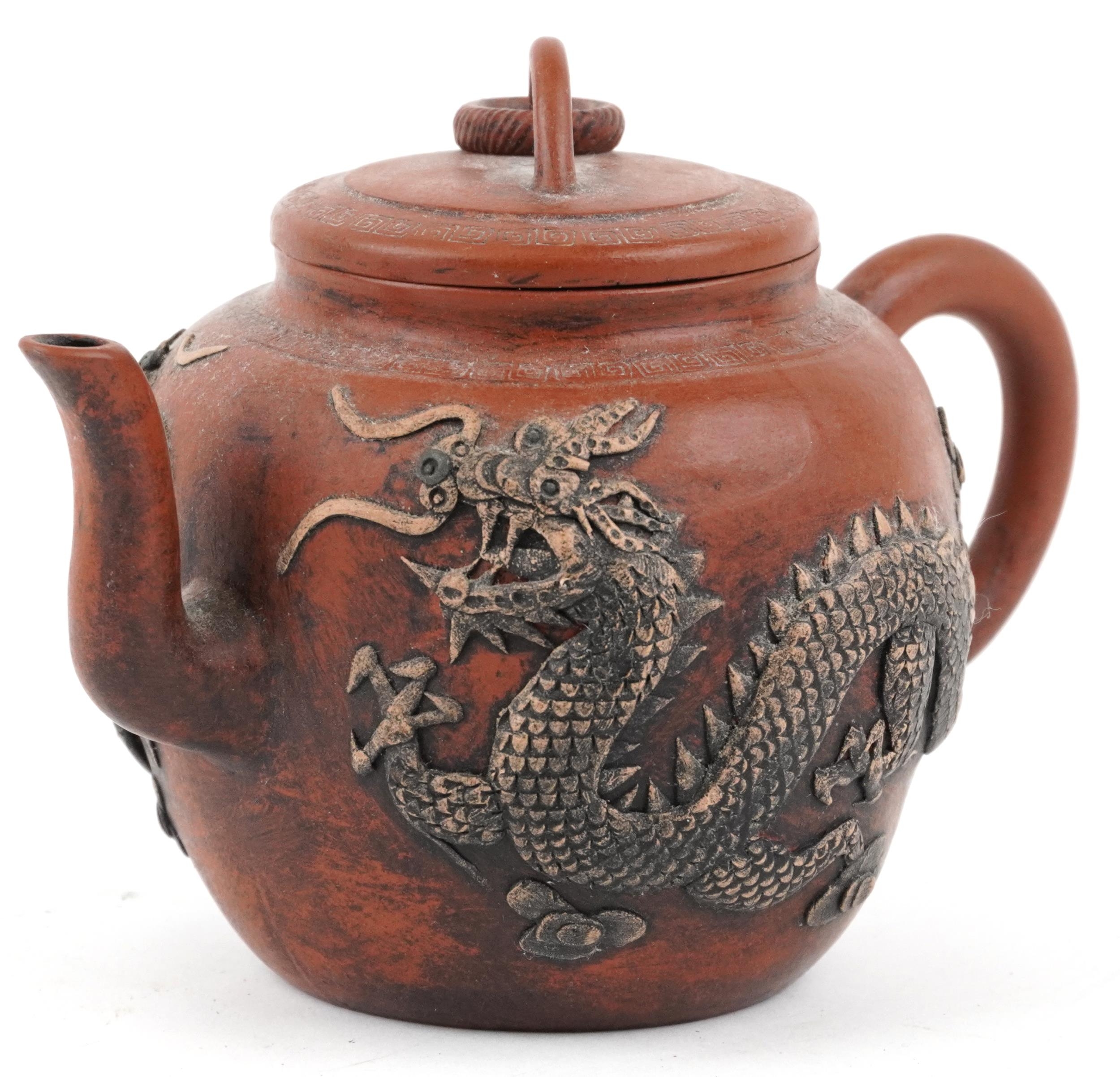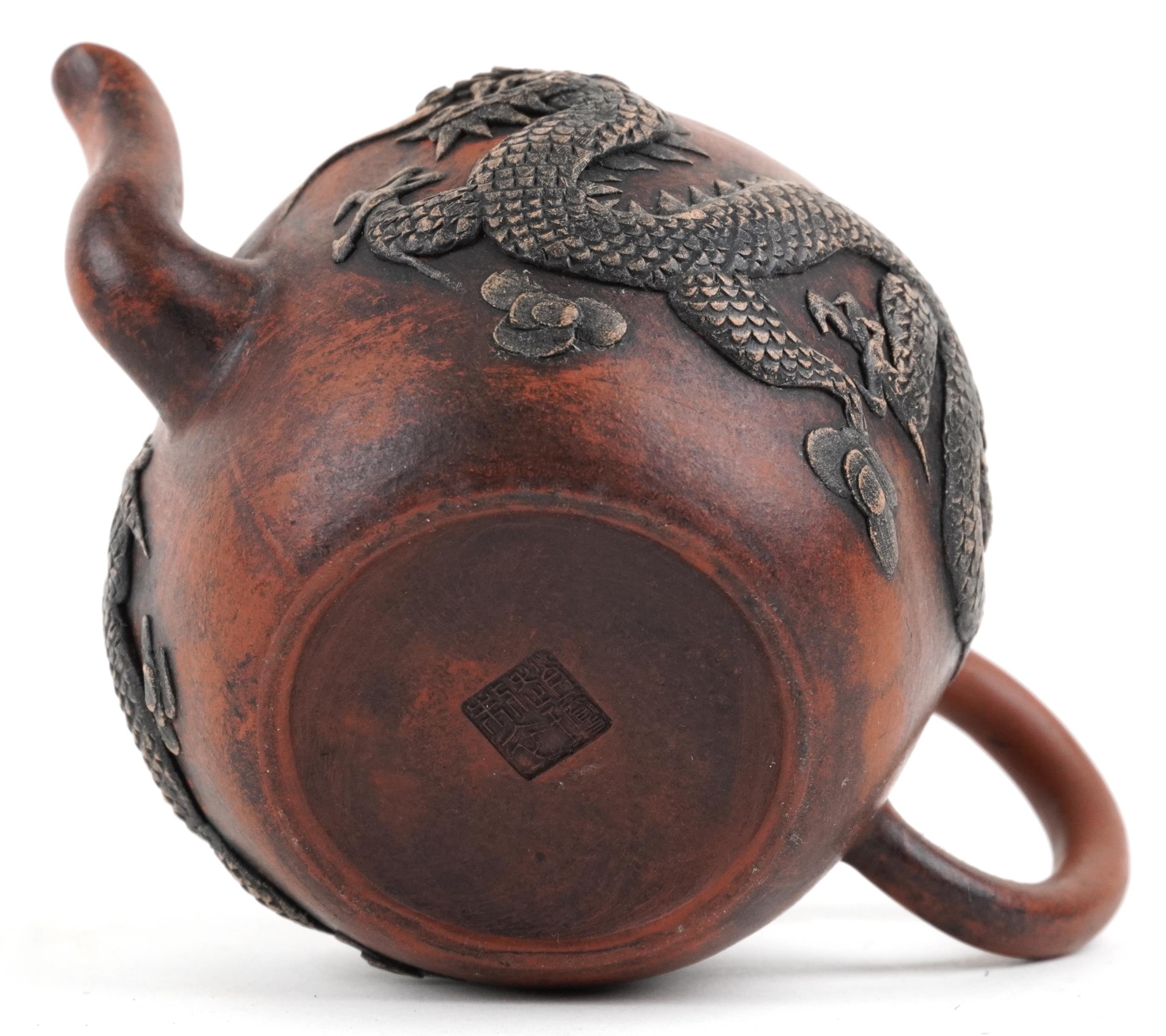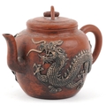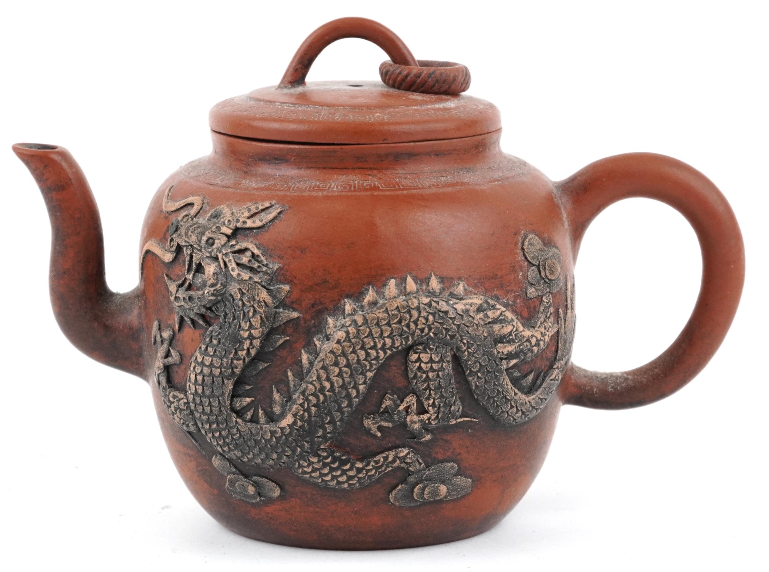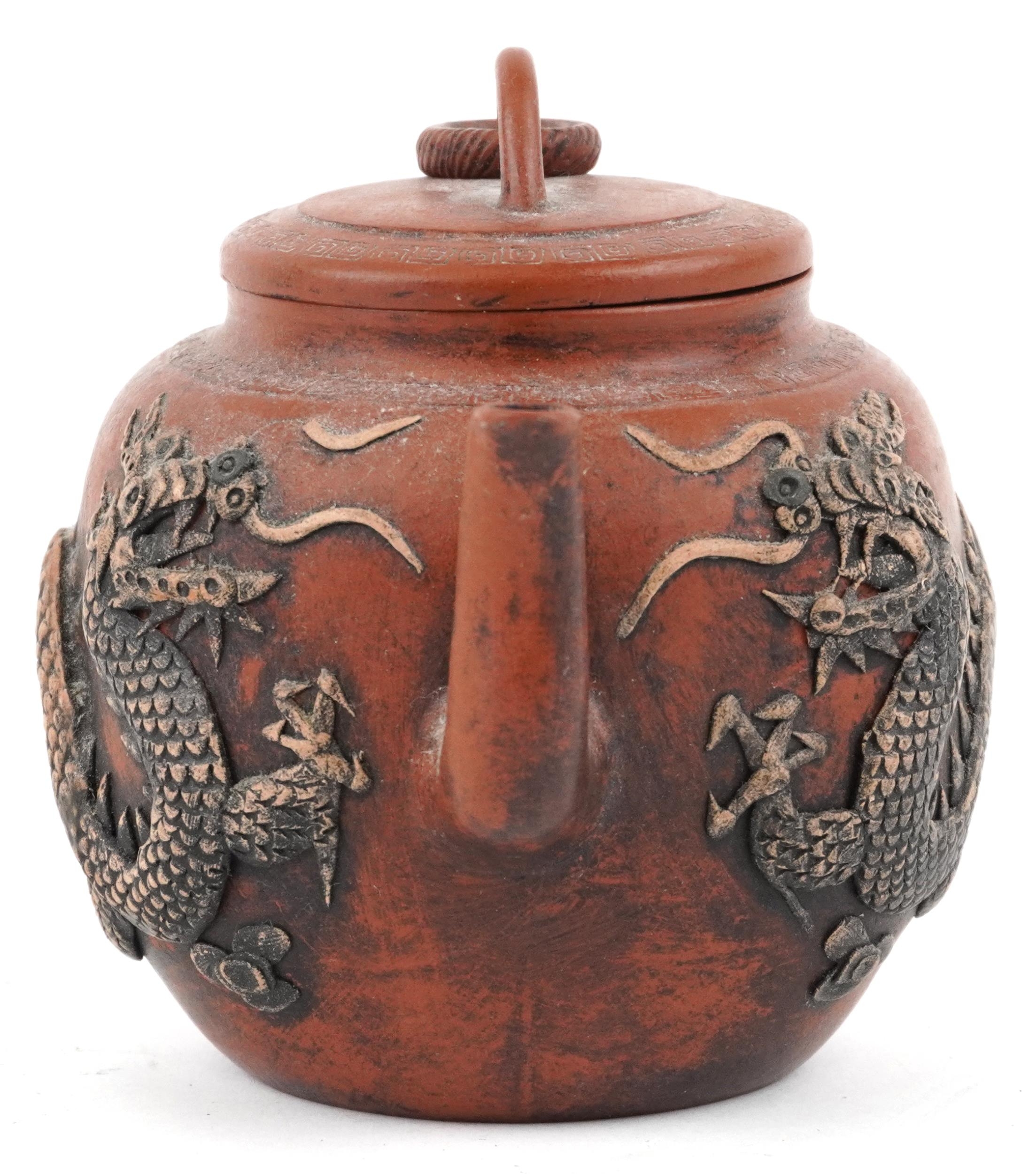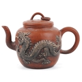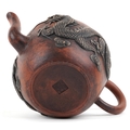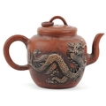 A Chinese Yixing stoneware teapot, 20th century, decorated with two dragons, bearing four character mark to base, 11cm high.