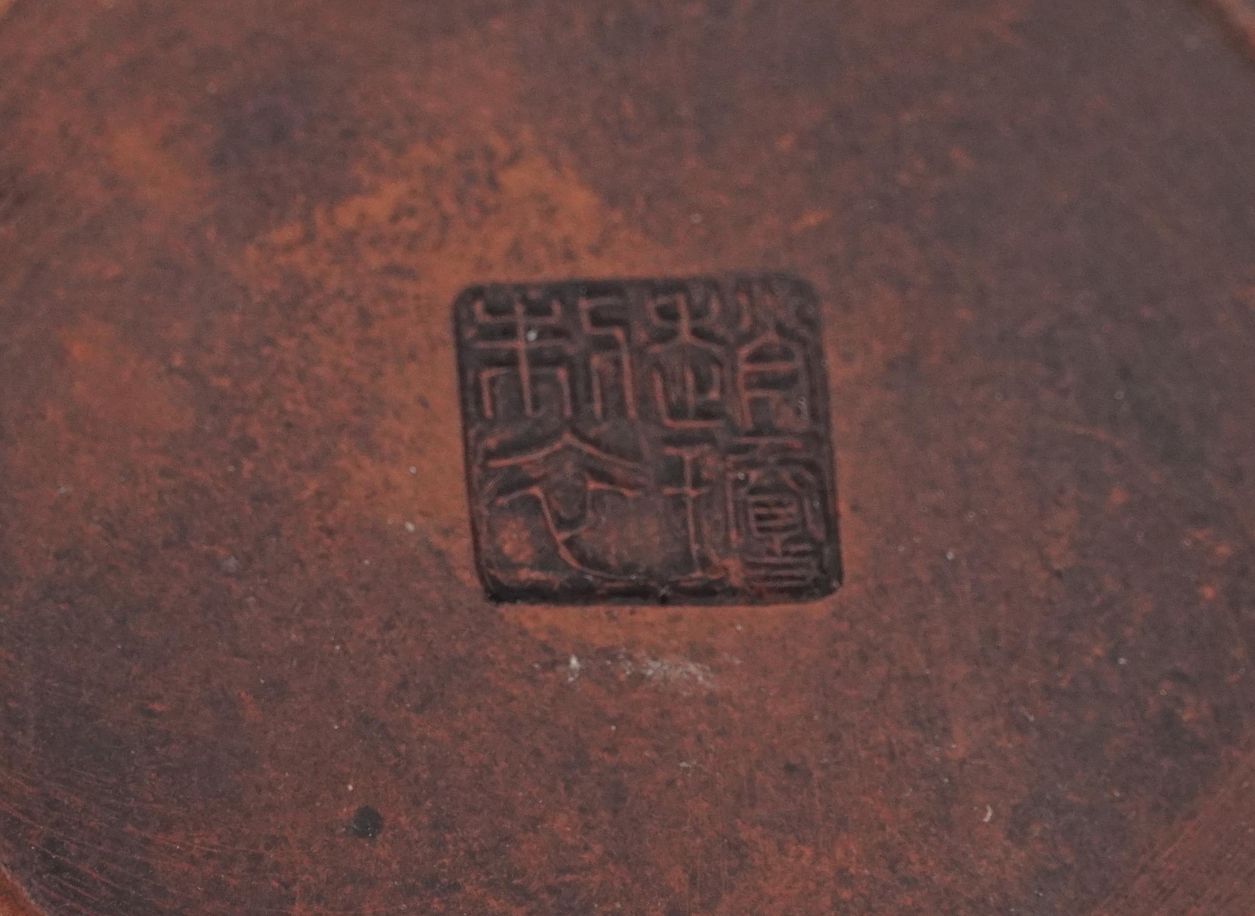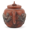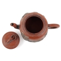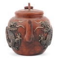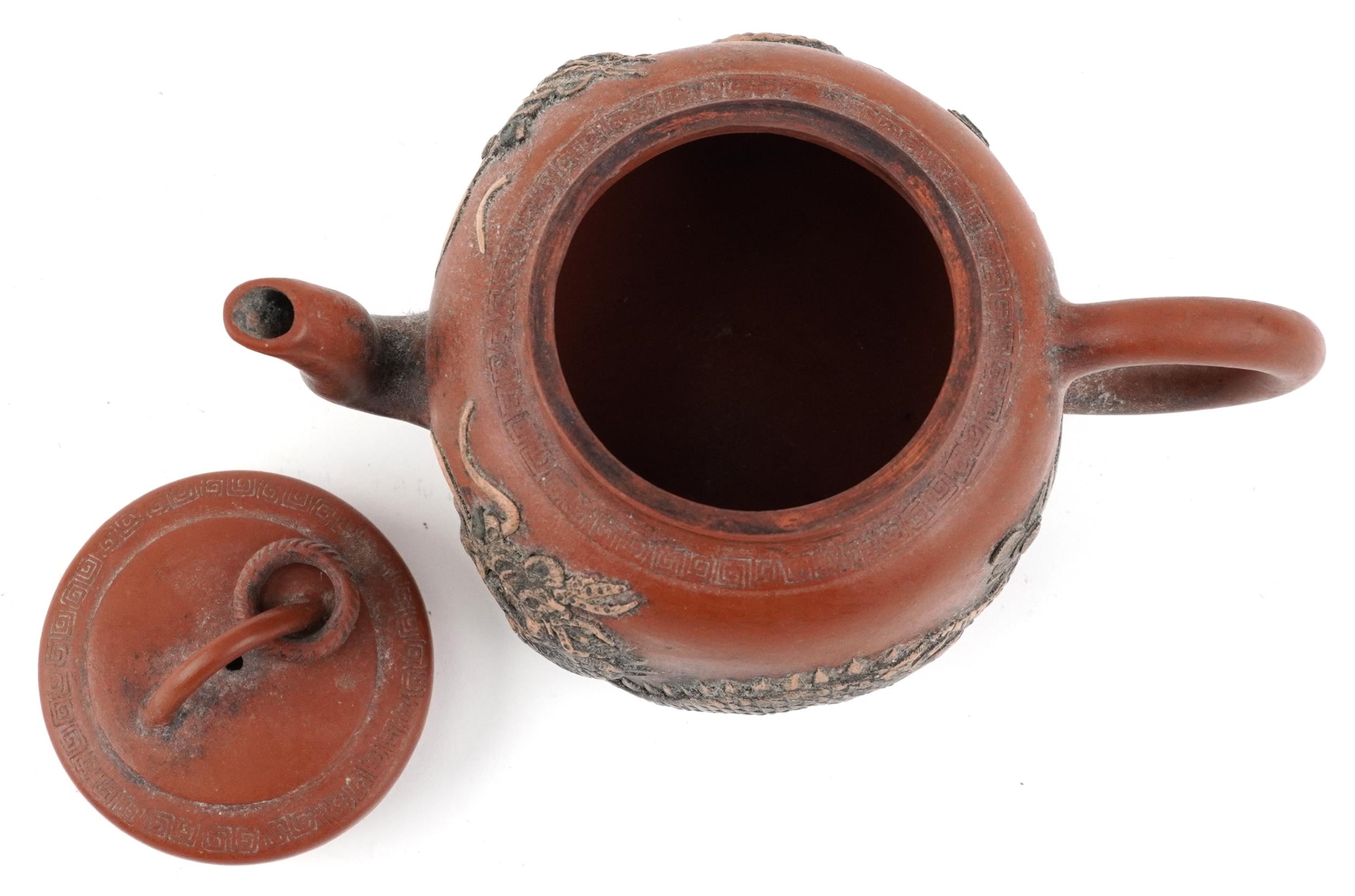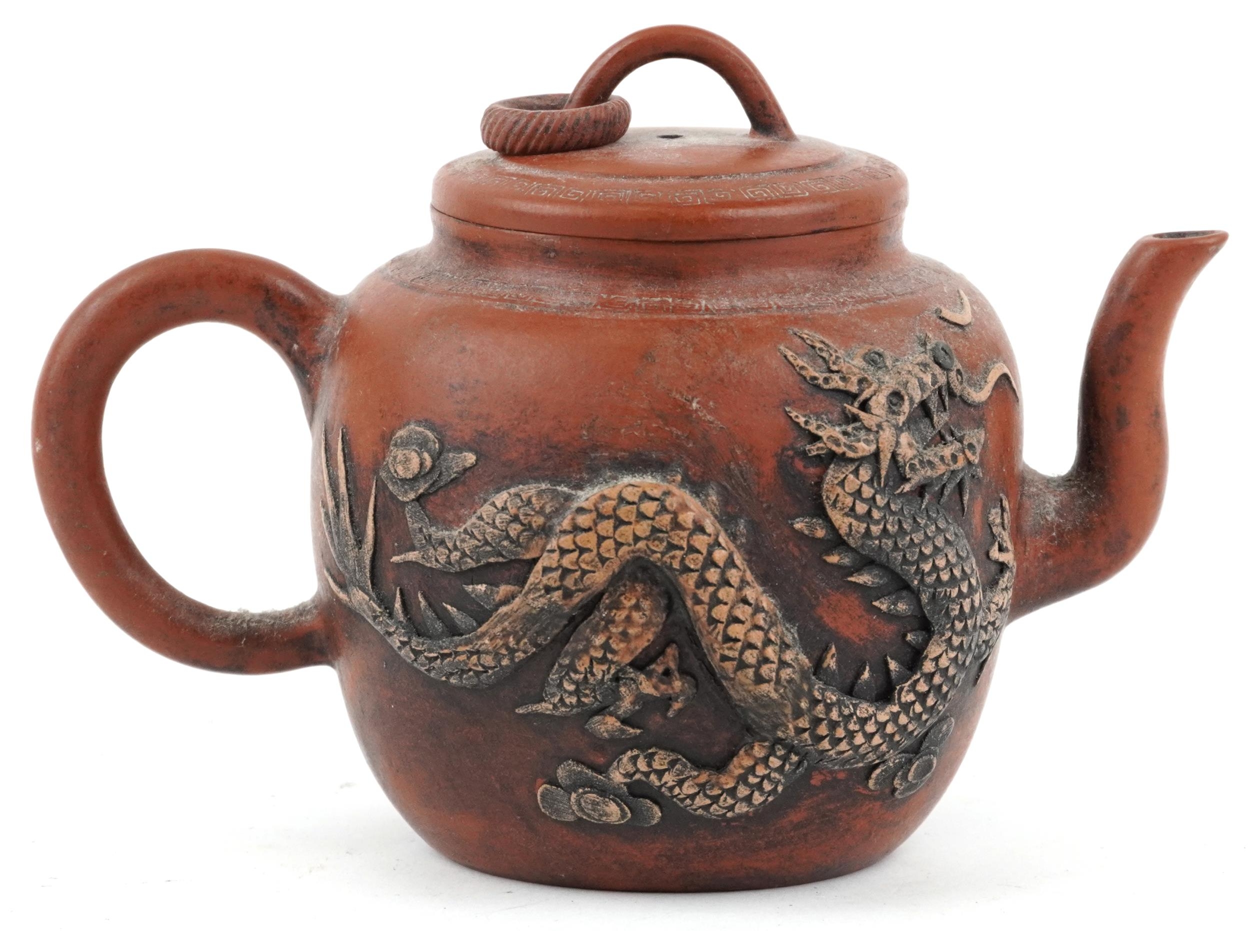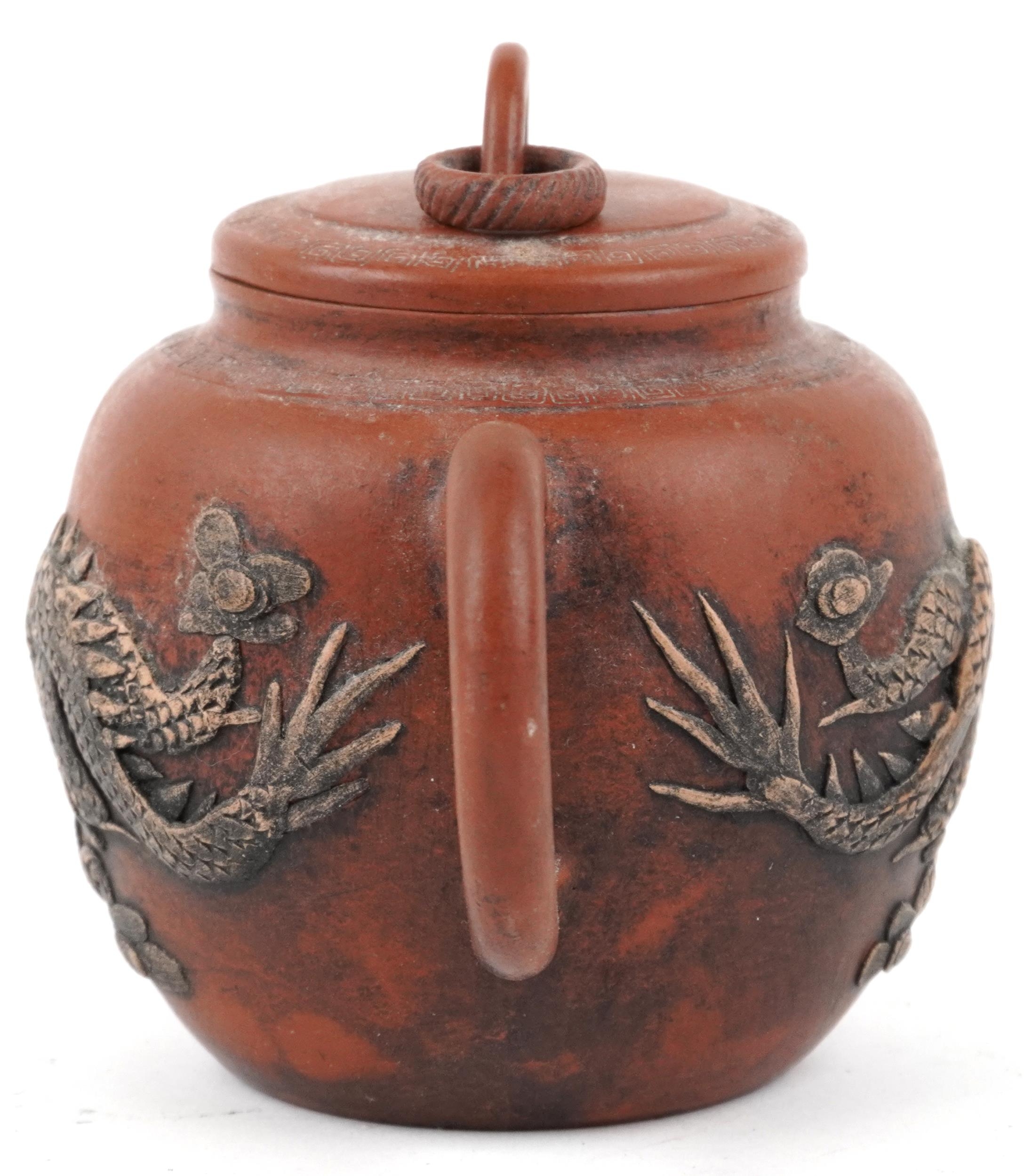A Chinese Yixing stoneware teapot, 20th century, decorated with two dragons, bearing four character mark to base, 11cm high.