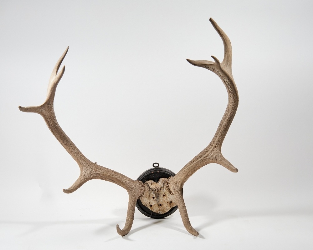 A taxidermy mounted Stag skull cap and antlers, 20th century, with circular mount, the antlers approx. 60cm high, 55cm wide