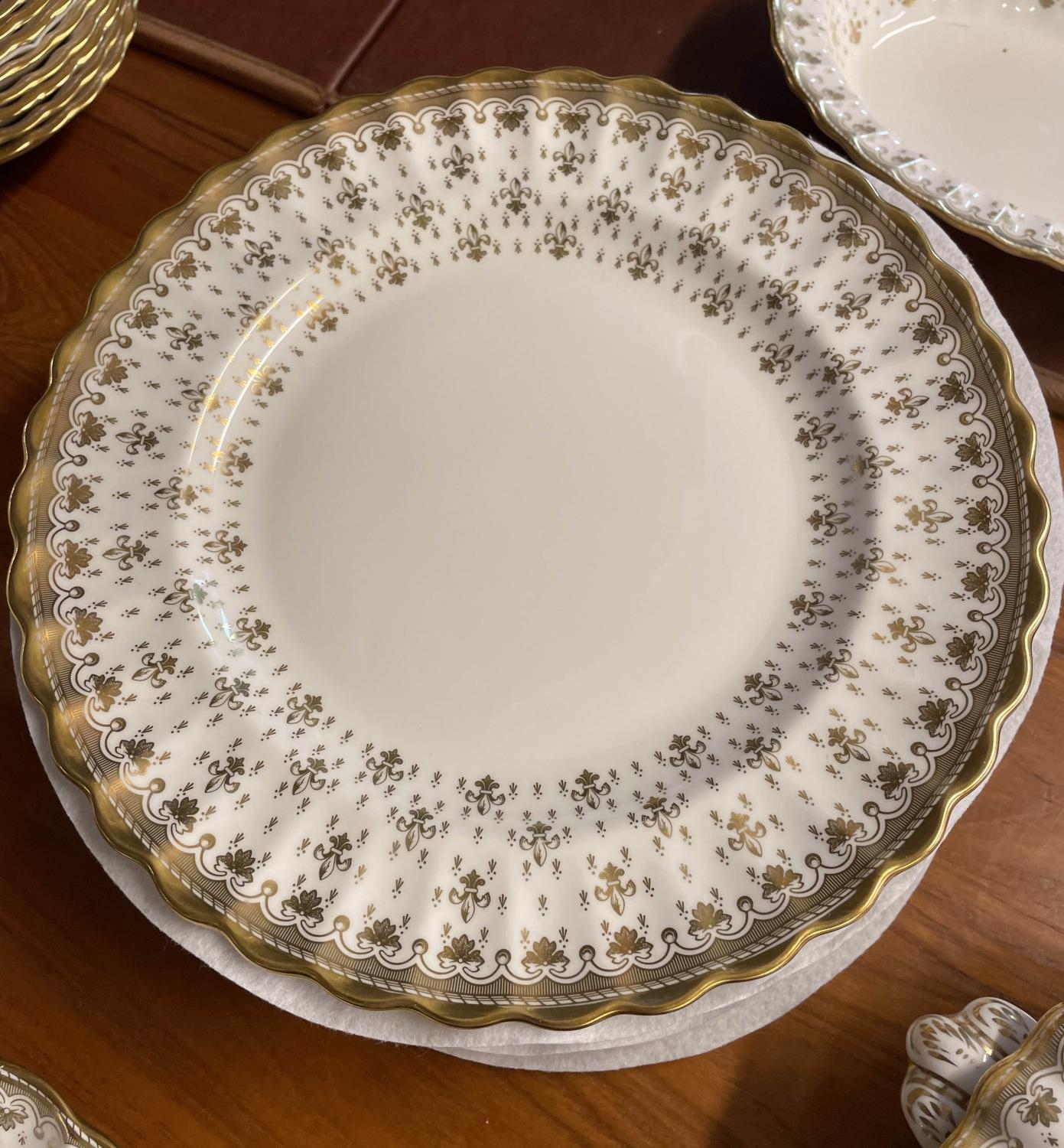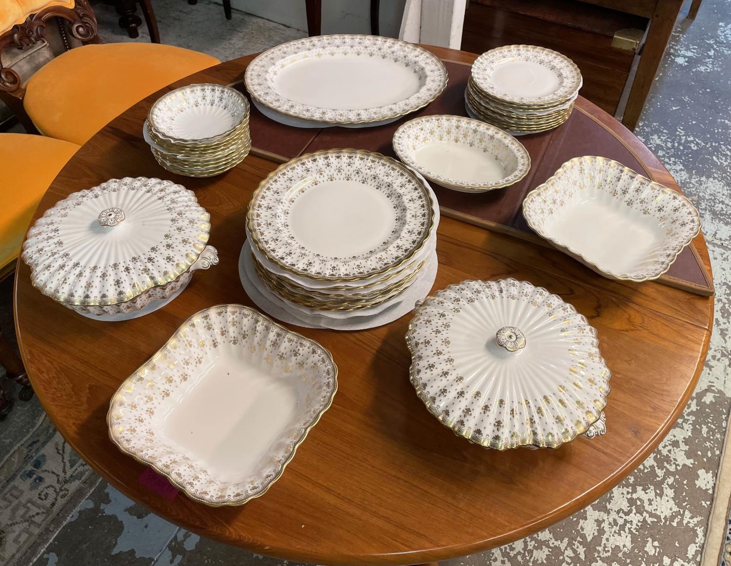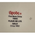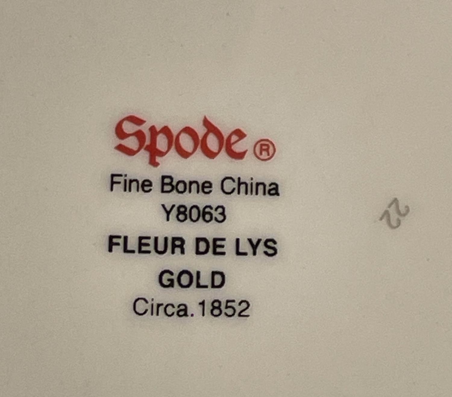 SPODE 'FLEUR DE LYS GOLD' PART DINNER SERVICE, comprising ten plates, ten side plates, ten dessert bowls, a pair of square serving bowls, a pair of lidded tureens, a large serving tray and another serving bowl. (36) (Qty)