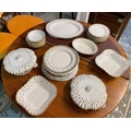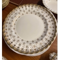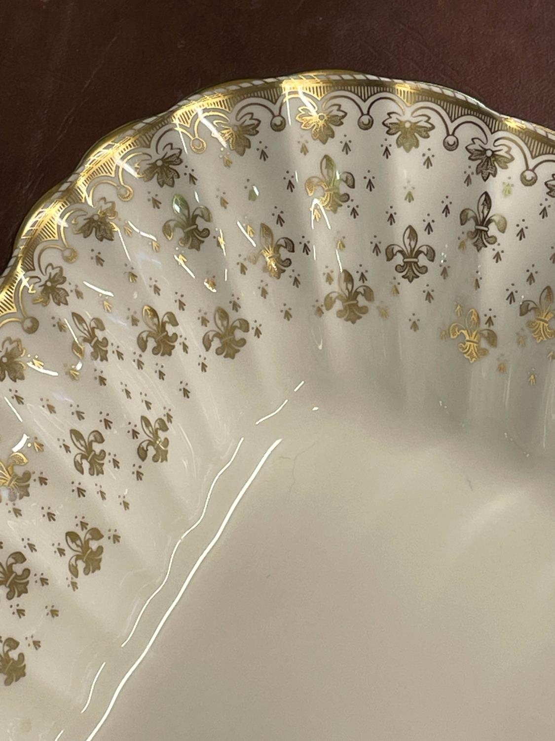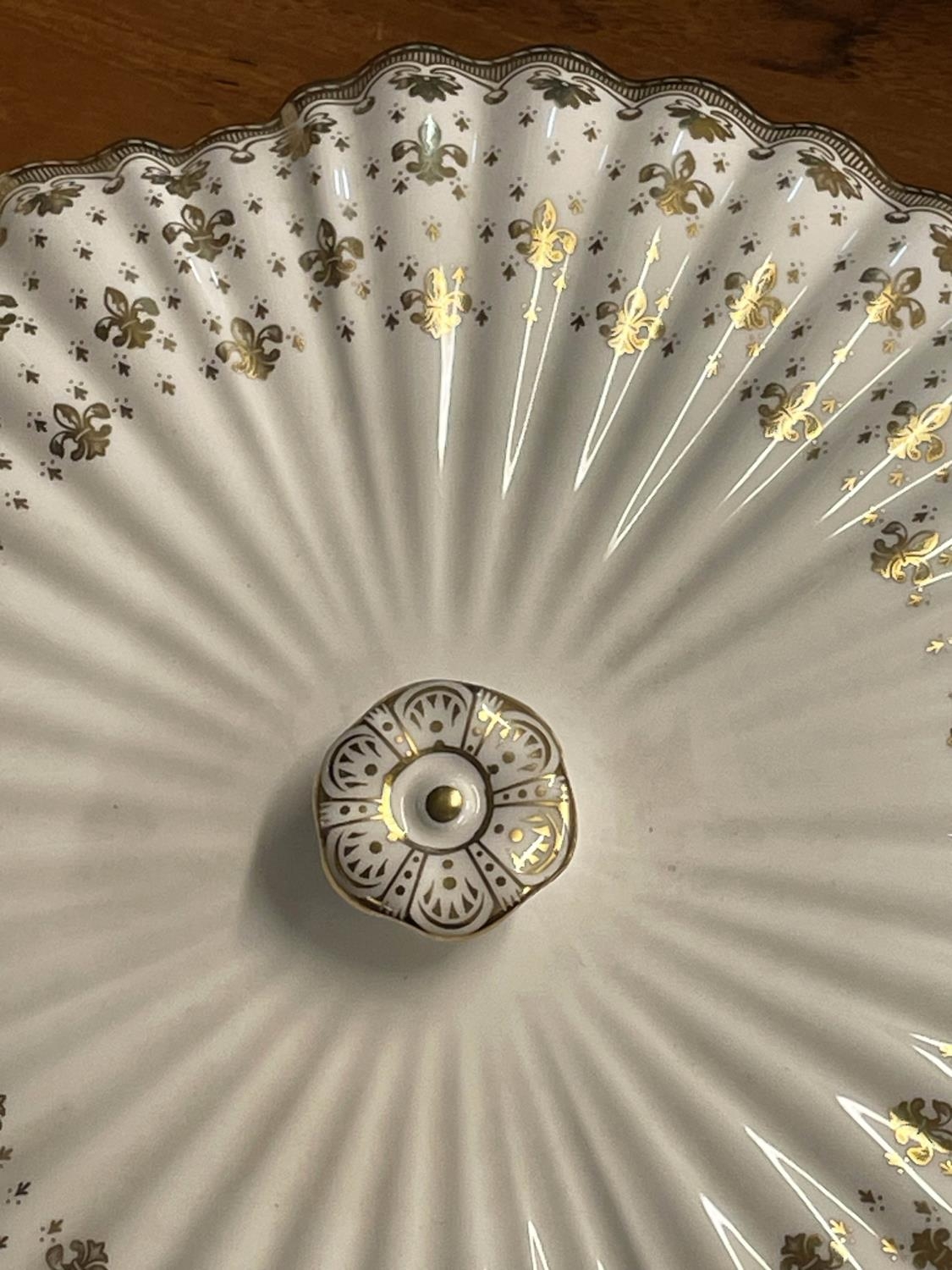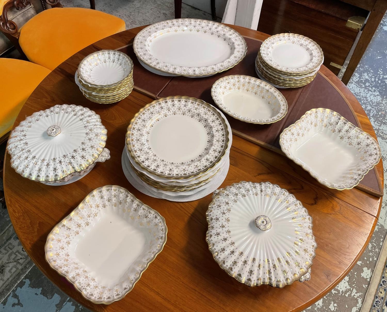 SPODE 'FLEUR DE LYS GOLD' PART DINNER SERVICE, comprising ten plates, ten side plates, ten dessert bowls, a pair of square serving bowls, a pair of lidded tureens, a large serving tray and another serving bowl. (36) (Qty)