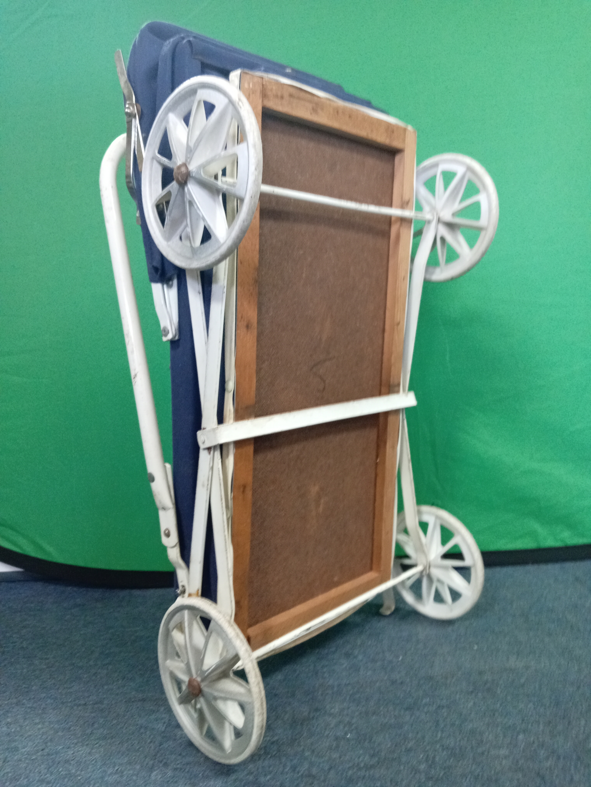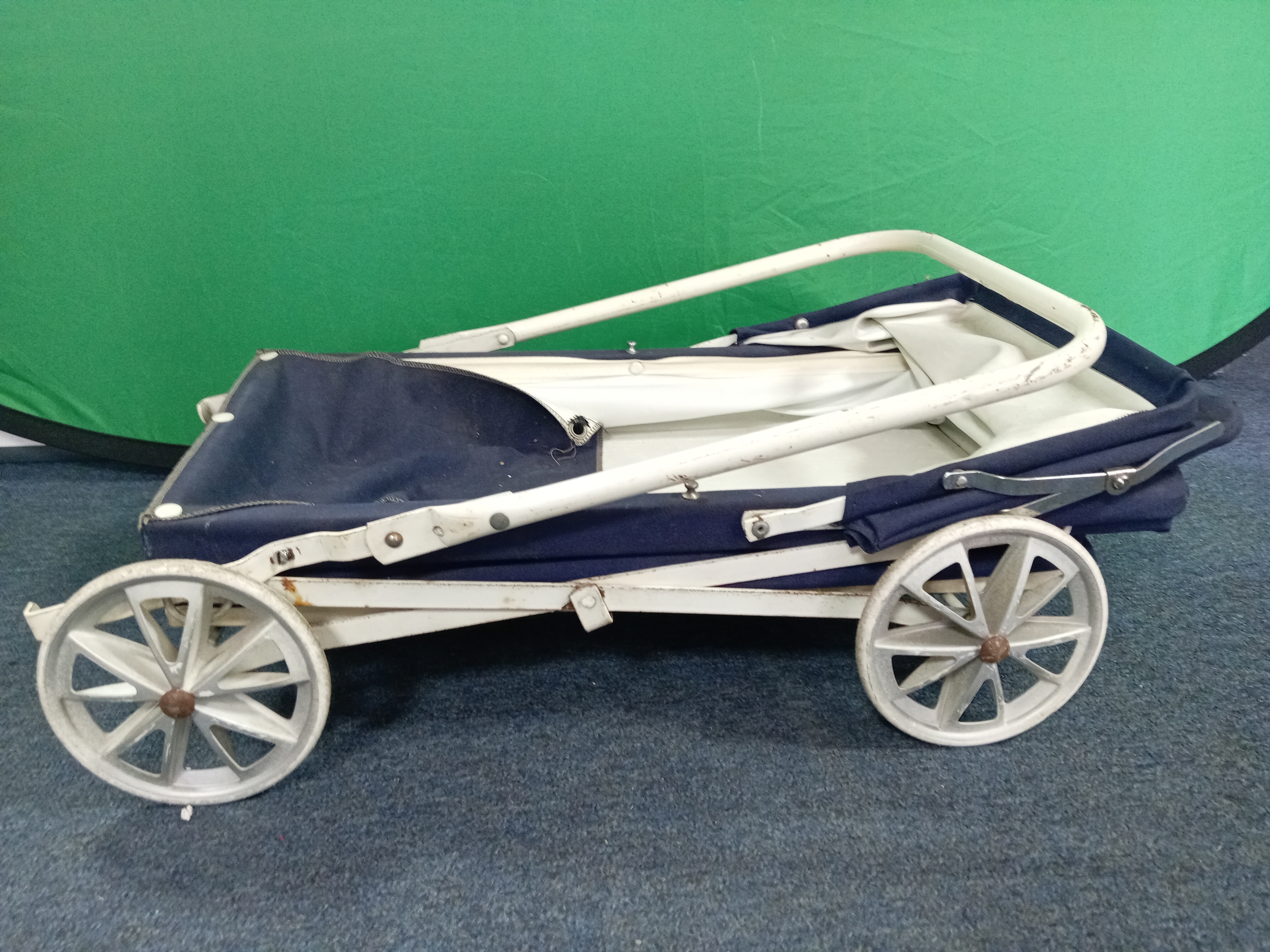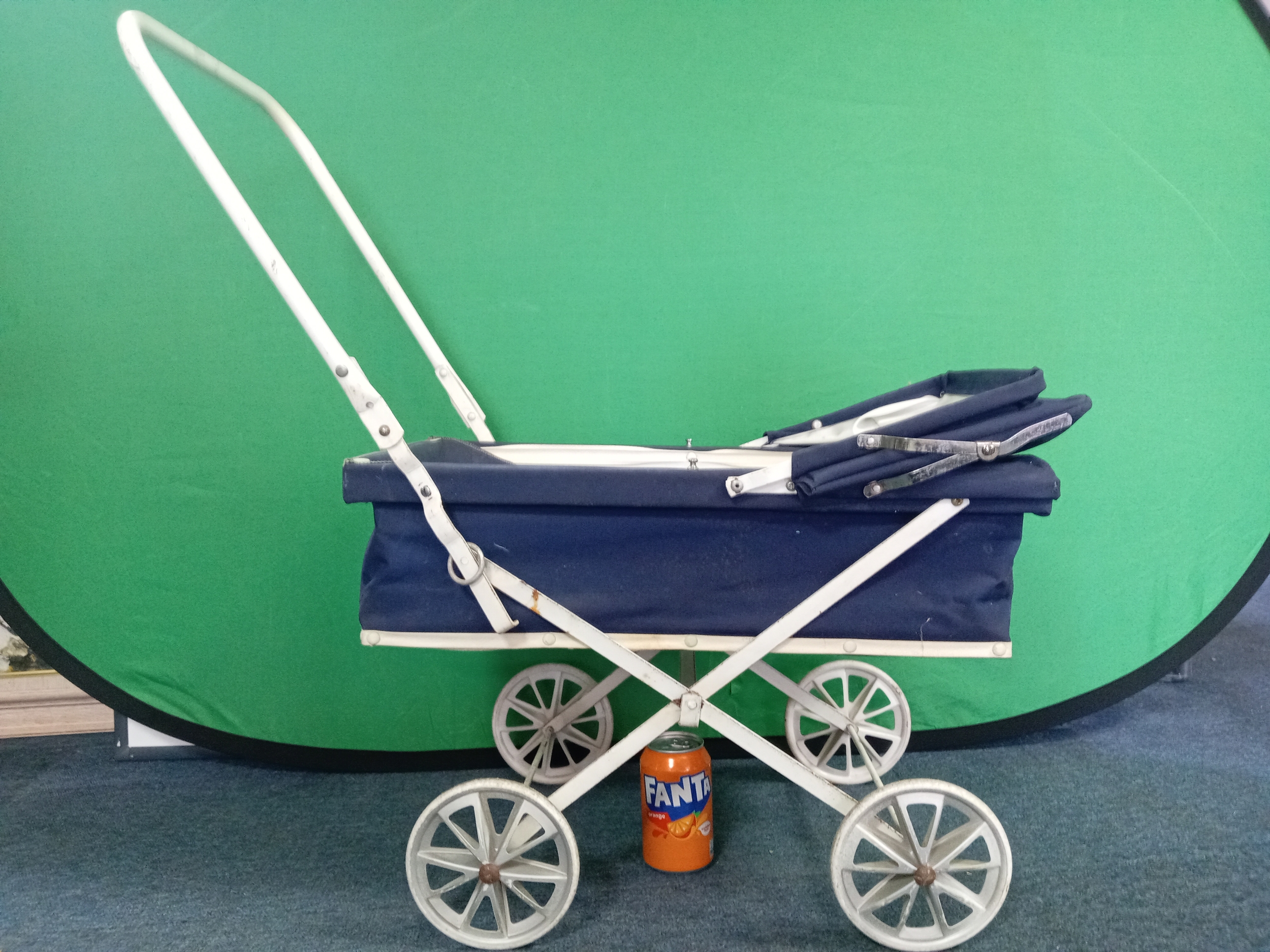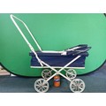 A vintage navy blue collapsible dolls pram