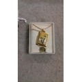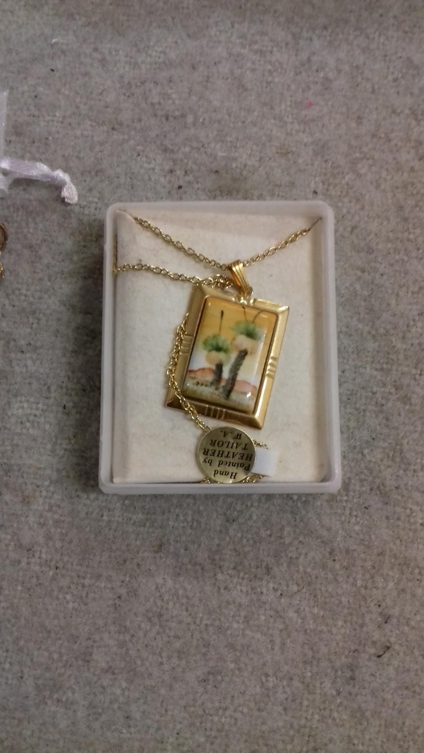 Heather Tailer W.A. hand painted porcelain pendant on gold tone mount with chain