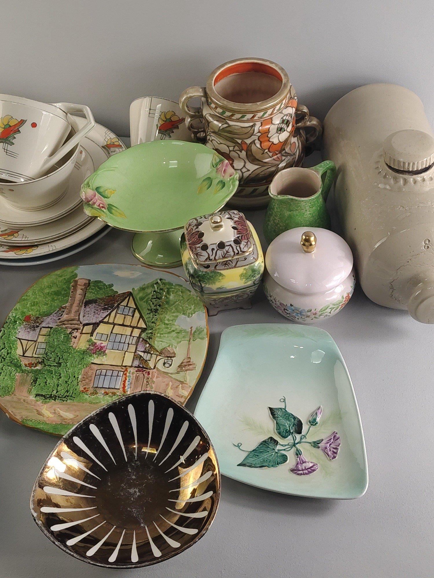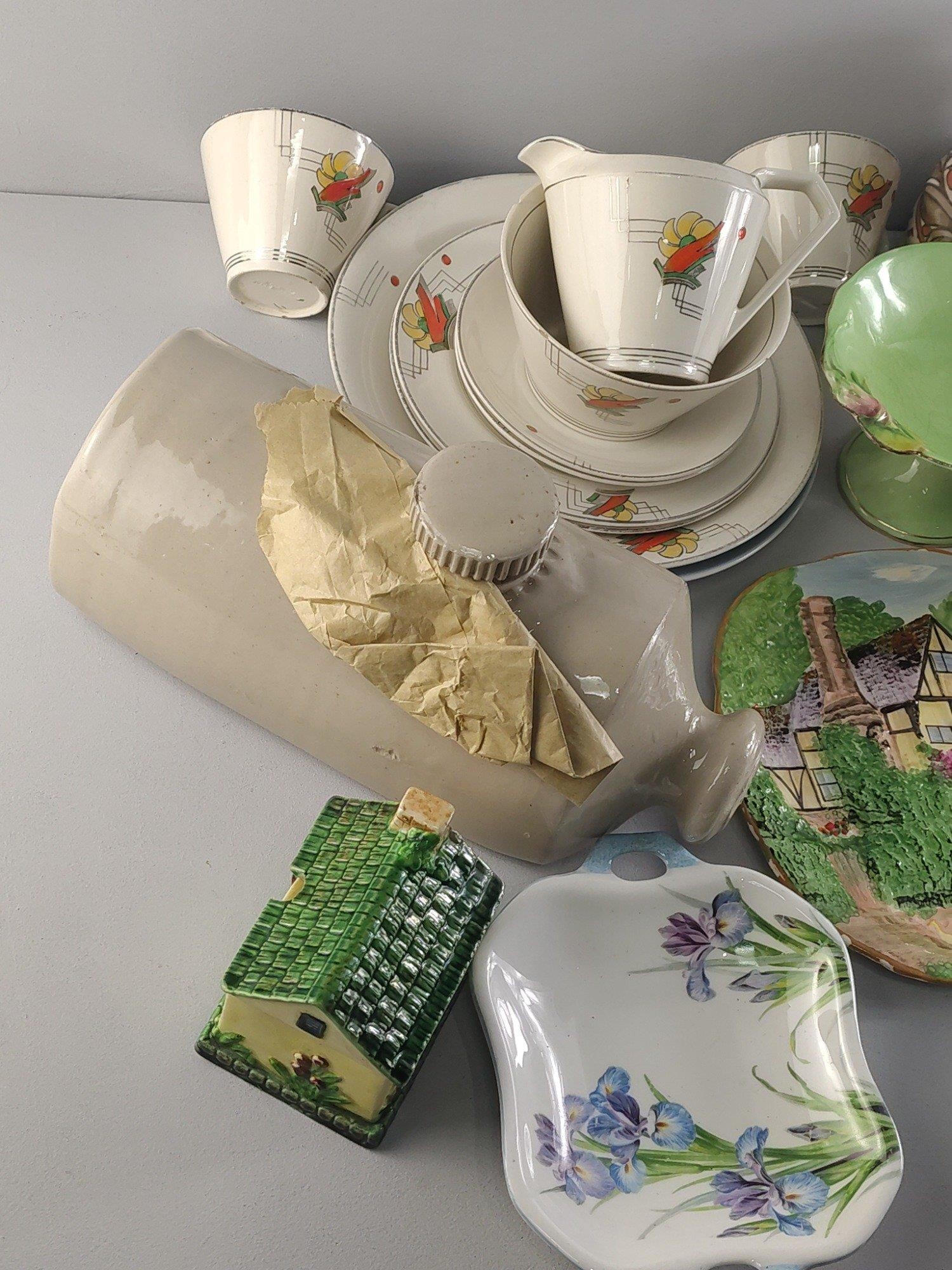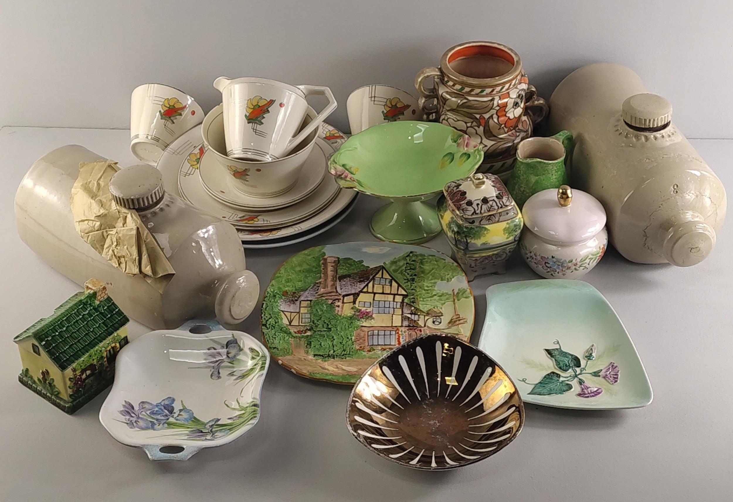 A mixed ceramic lot to include stone pig bottles, vases, PAREEK cups and saucers, GOVANCROFT etc