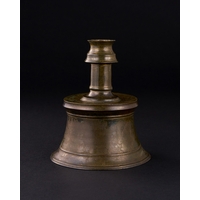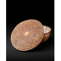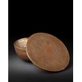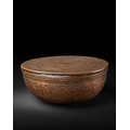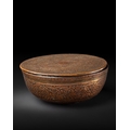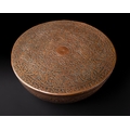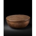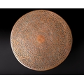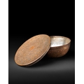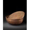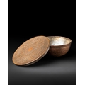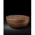 Of rounded form with a fitted flat cover, this fine bowl is worked in engraved copper with intricate arabesques and geometric medallions filled with scrolling vegetal motifs. The exterior is divided into repeated roundels and cartouches, each filled with dense interlace patterns framed by flowing arabesques. The lid is decorated en suite, with concentric bands of floral scrolls radiating from a central medallion. The interior retains traces of tinning.
