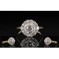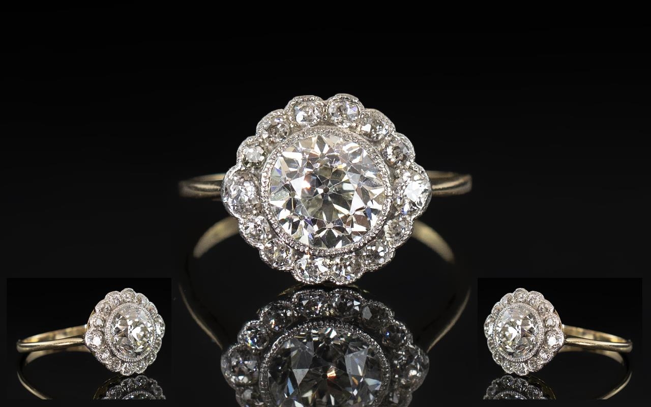 Antique Period - Ladies 18ct Gold and Platinum Superb Quality Diamond Set Cluster Ring. The Central Round Faceted Diamond Surrounded by 16 Matching Round Diamonds. All Diamonds of Top Colour and Clarity. The Central Diamond of 1.30 cts. The Surrounding 16 Diamonds Est 0.80 pts - Total 2.10 cts. Ring Size L. The Shank and Setting Excellent Condition.
