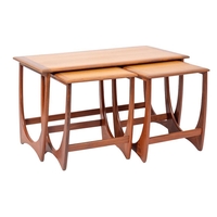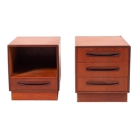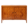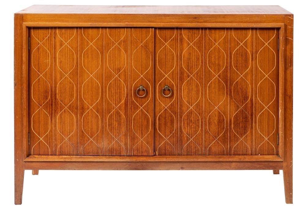 A teak sideboard, by Gordon Russell 'Helix' pattern, circa 1960s; the twin doors with metal ring handles and routed interlaced decoration, on square tapering supports, with Russell of Broadway label to reverse; 84high, 122cm wide, 47cm deep