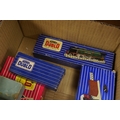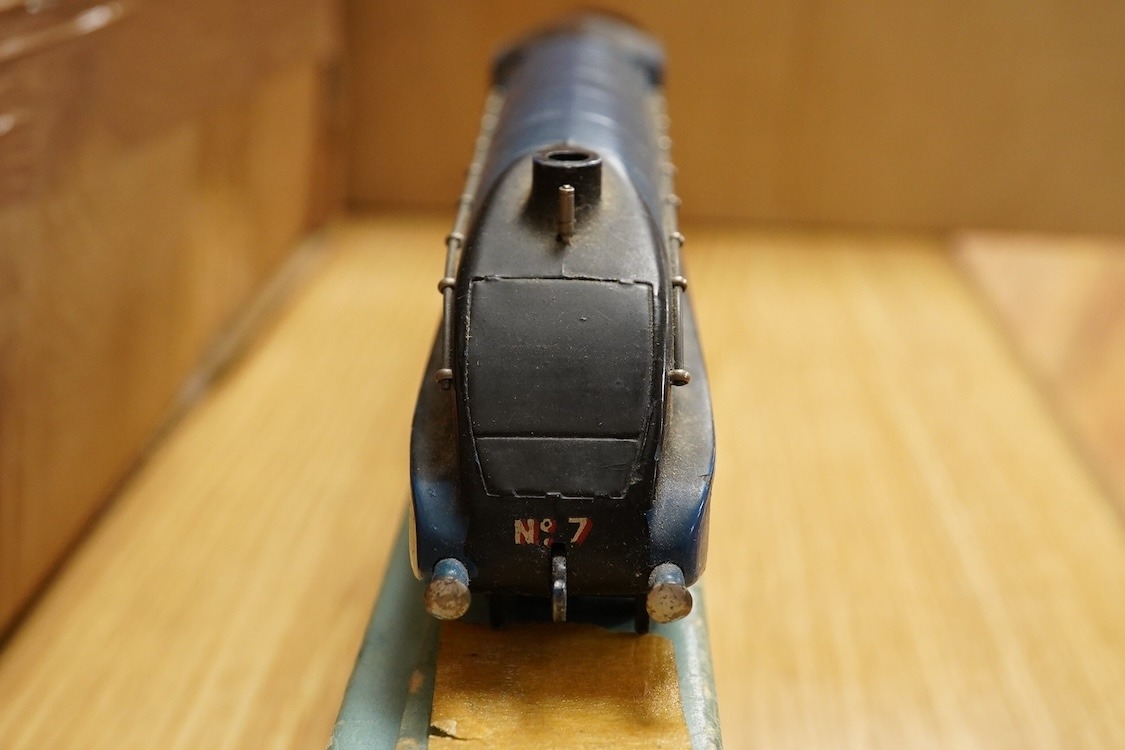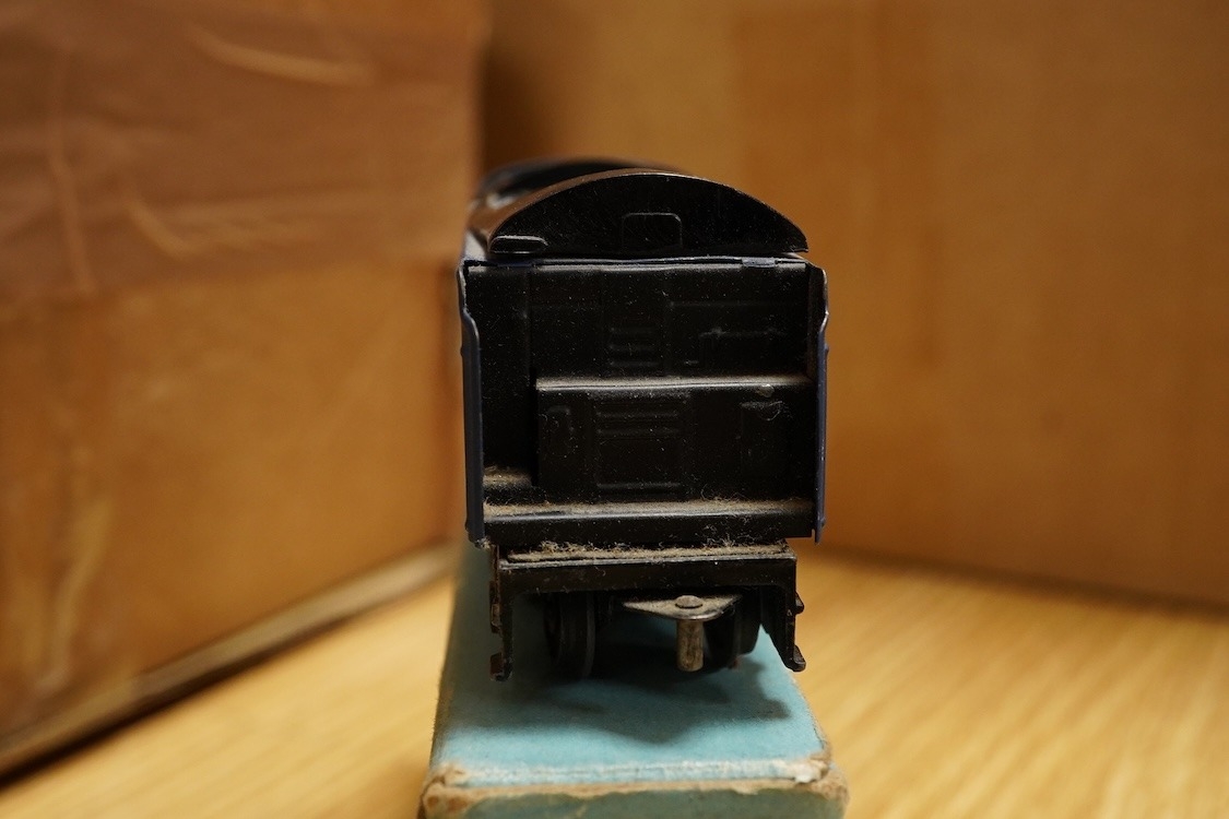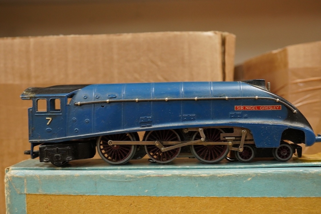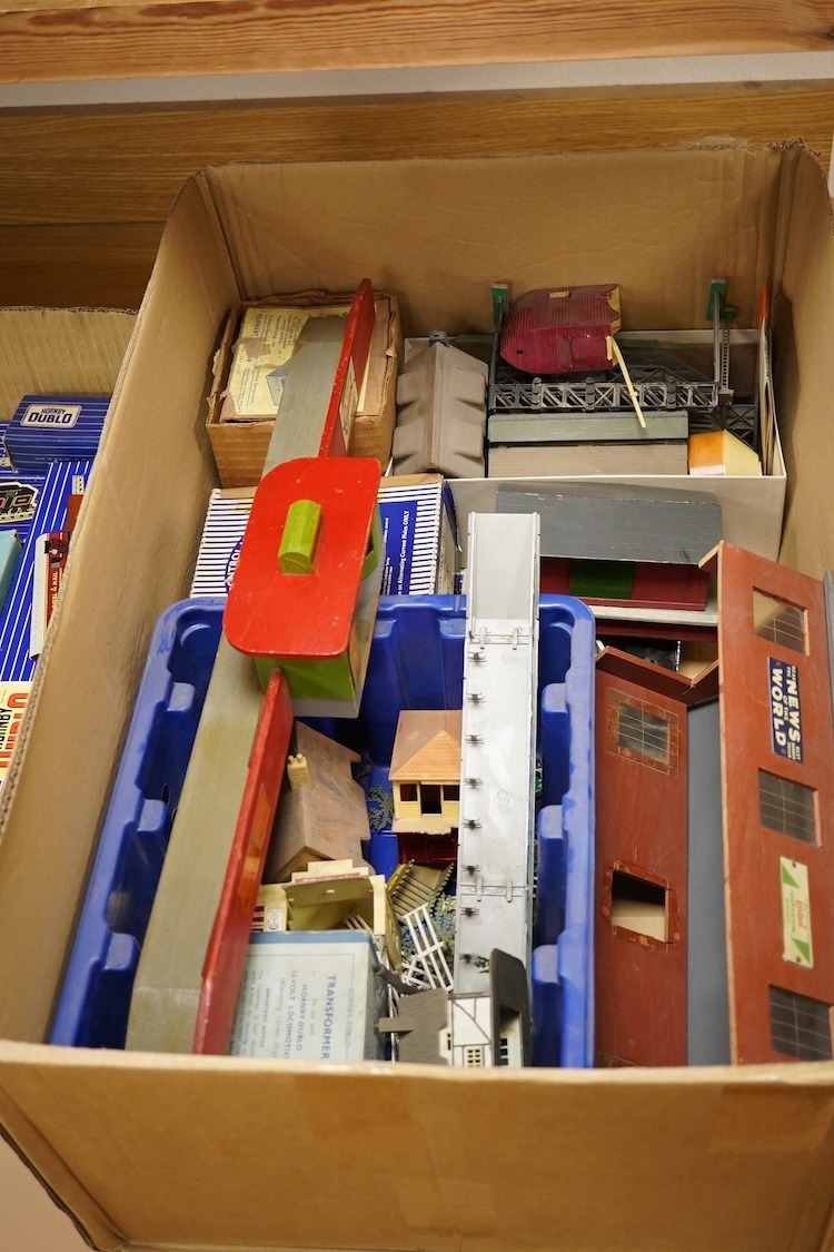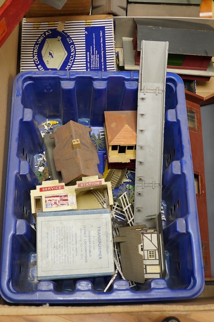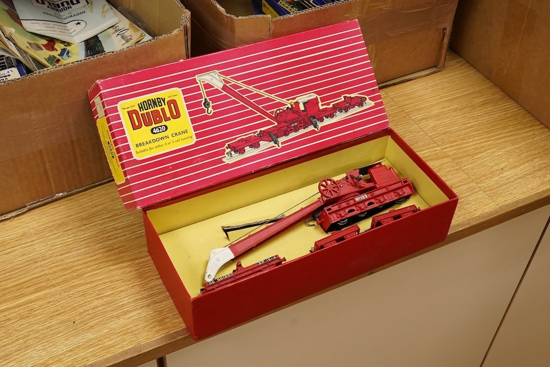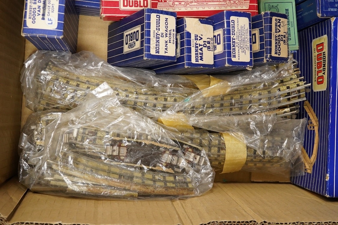 A collection of Hornby Dublo railway for 3-rail running, including three boxed locomotives; an LNER class A4 4-6-2 tender locomotive, Sir Nigel Gresley 7 (EDL1), a BR Duchess of Montrose 46232 (EDL12), and a BR class N2 0-6-2T locomotive, 69567 (3217), together with a T.P.O. Mail van set, a Breakdown Crane (4620), three box bogie coaches and four freight wagons, a quantity of track sections, some boxed, including six box sets of points, an early plywood station platform and a plywood locomotive shed, a D1 footbridge and a D1 signal cabin, both boxed, a number of constructed plastic kit buildings, controllers, Meccano catalogues, etc.