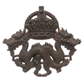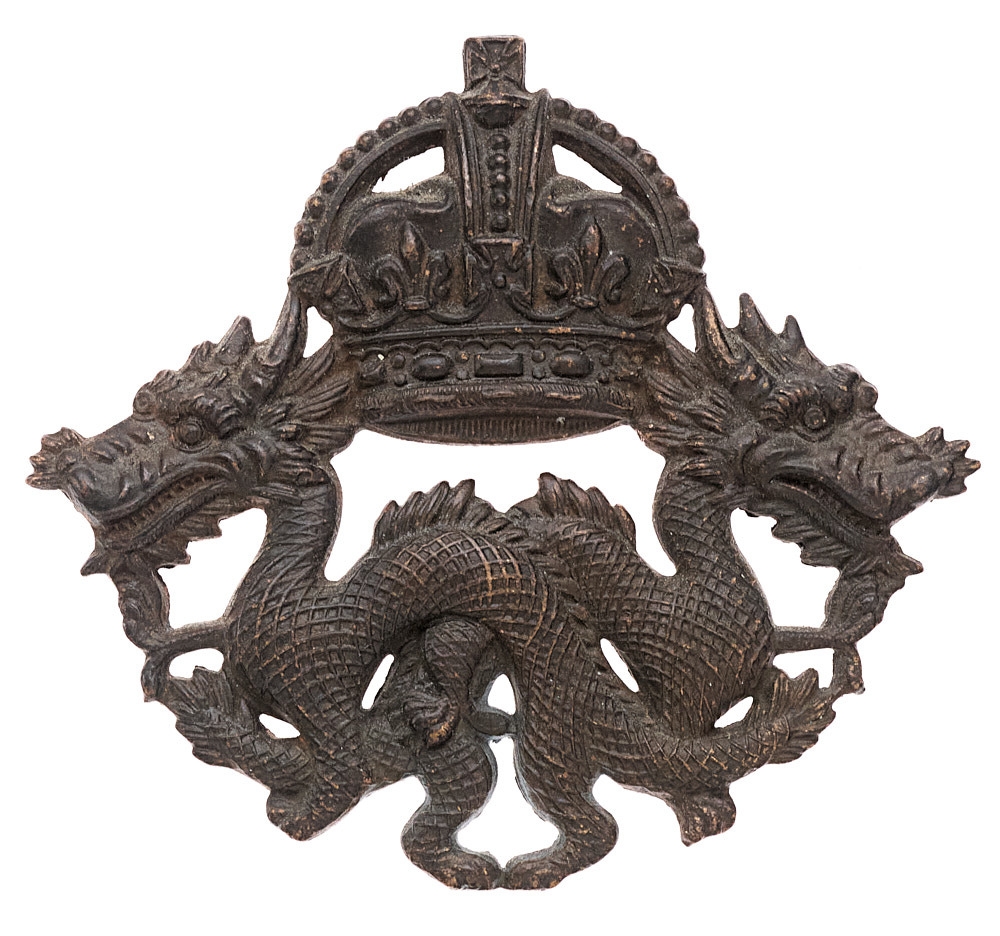 Hong Kong Volunteer Defence Corps Officer's pagri badge c. 1920-29. Good scarce British made die-stamped bronze crowned pair of outward facing dragons. Loops. VGC