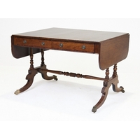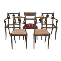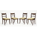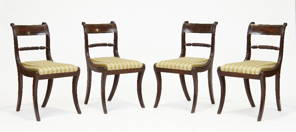 A set of four Regency mahogany dining chairs, first quarter 19th century, the brass inlaid crest rails above rope twist splats, on sabre legs, 84cm high, 47cm wide (4)