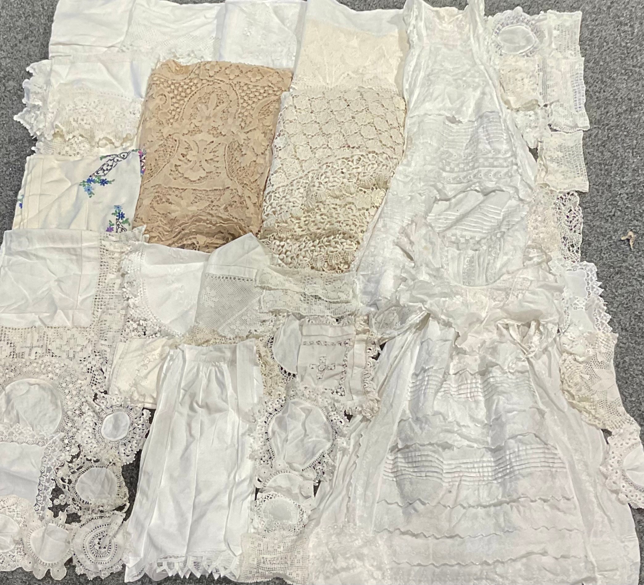 Textiles - lace edged linen tablecloths; other tablecloths; Christening gowns; etc, qty
