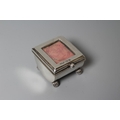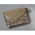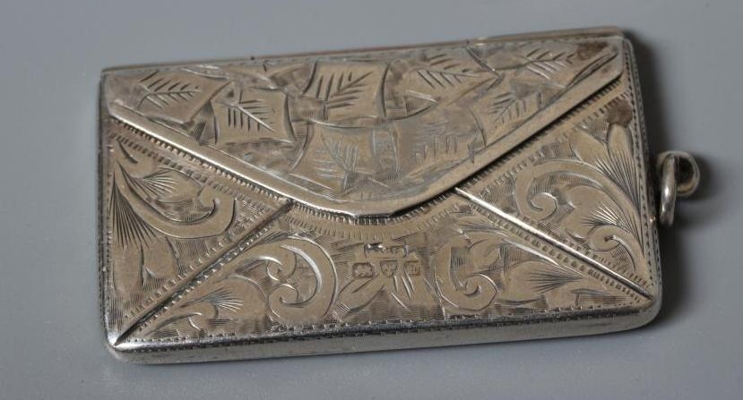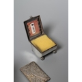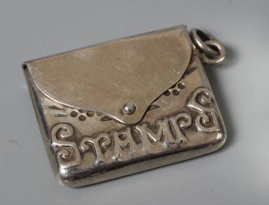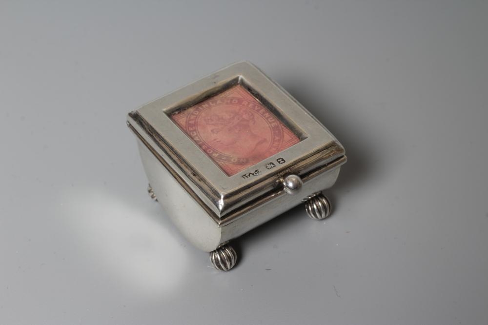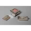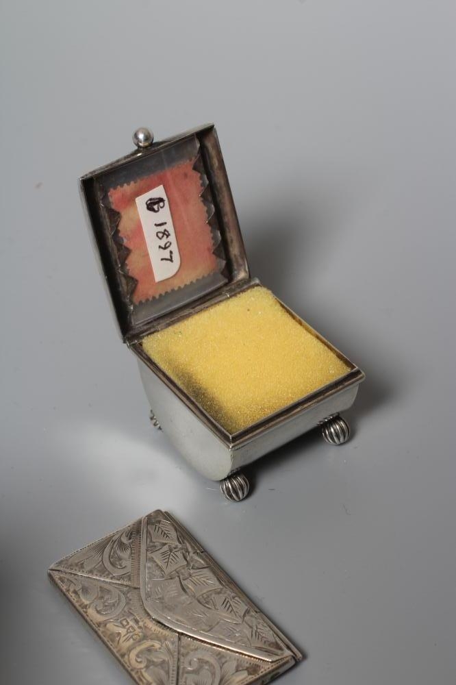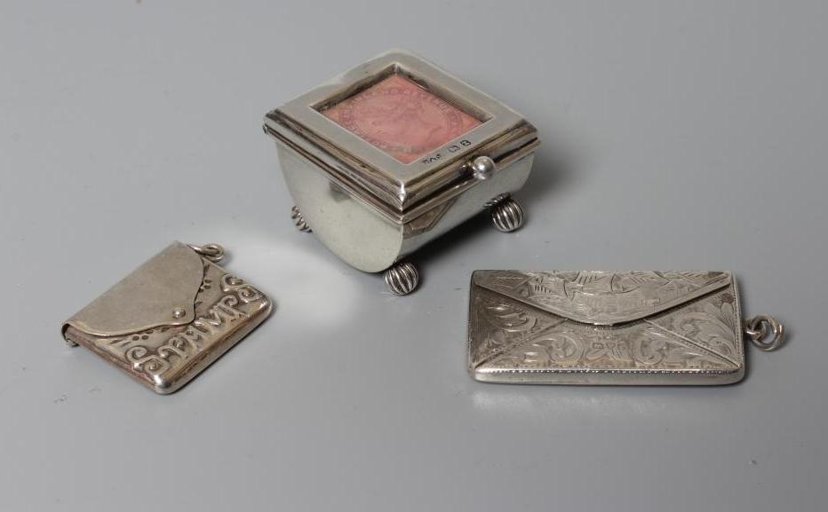 OF PHILATELIC INTEREST - A LATE VICTORIAN SILVER STAMP BOX by Grey & Co., Birmingham 1897, of semi-circular form raised upon four reeded bun feet, together with two silver stamp envelope cases comprising a double holder, Chester 1904, 1 3/4", wide and single holder, stamped 925 Sterling (3)