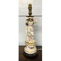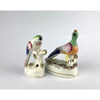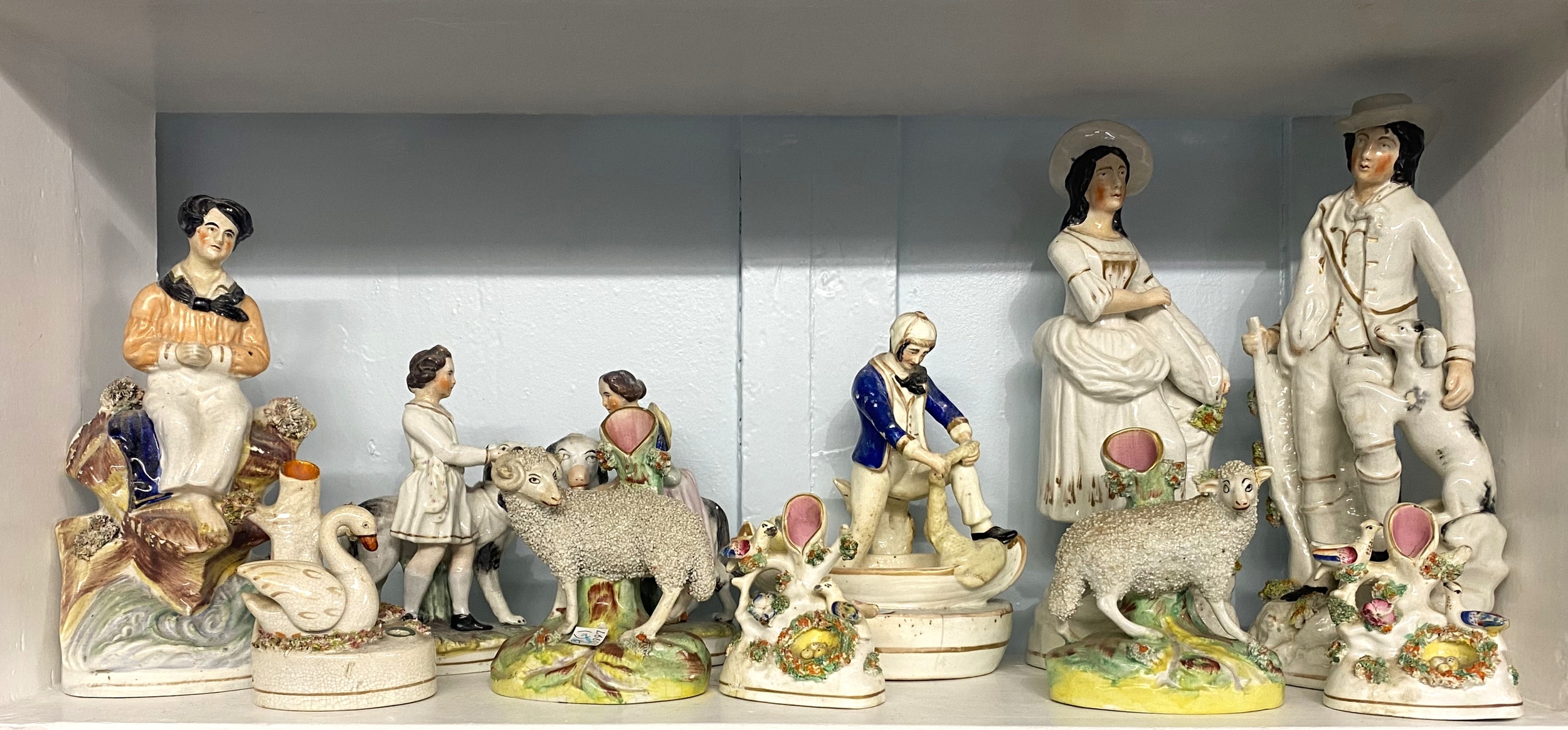 A collection of eleven Staffordshire pottery figures and quill holders to include a fisherman in a boat 20cm high, and a pair of figures with dog and rabbit 30cm (a/f)