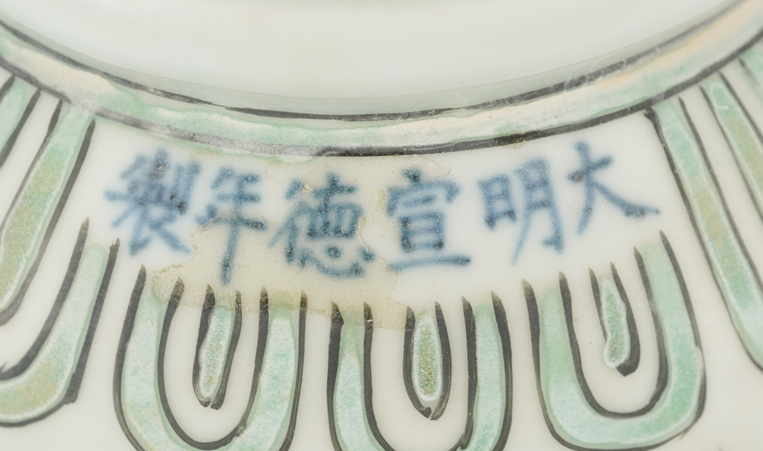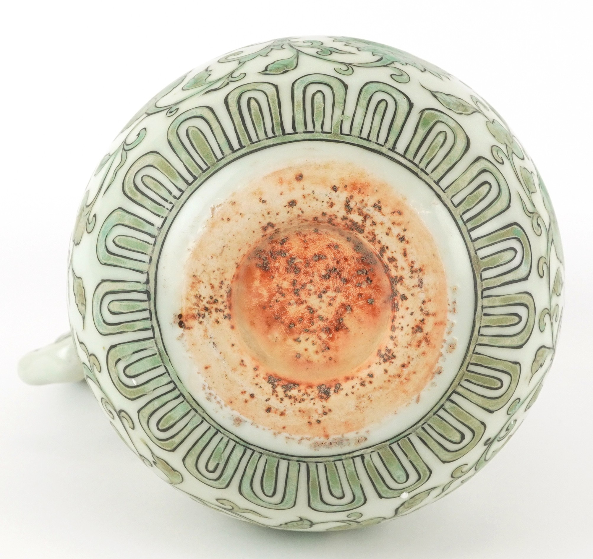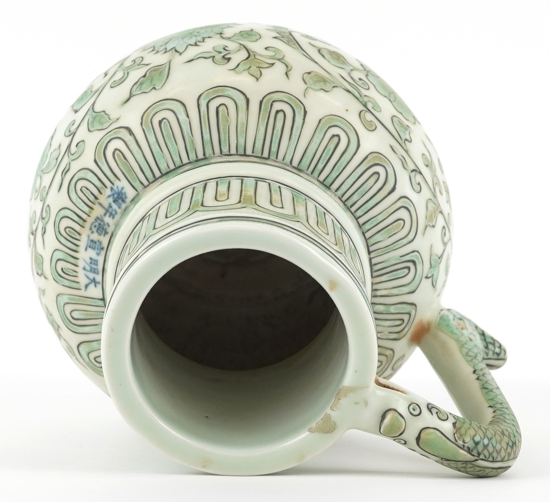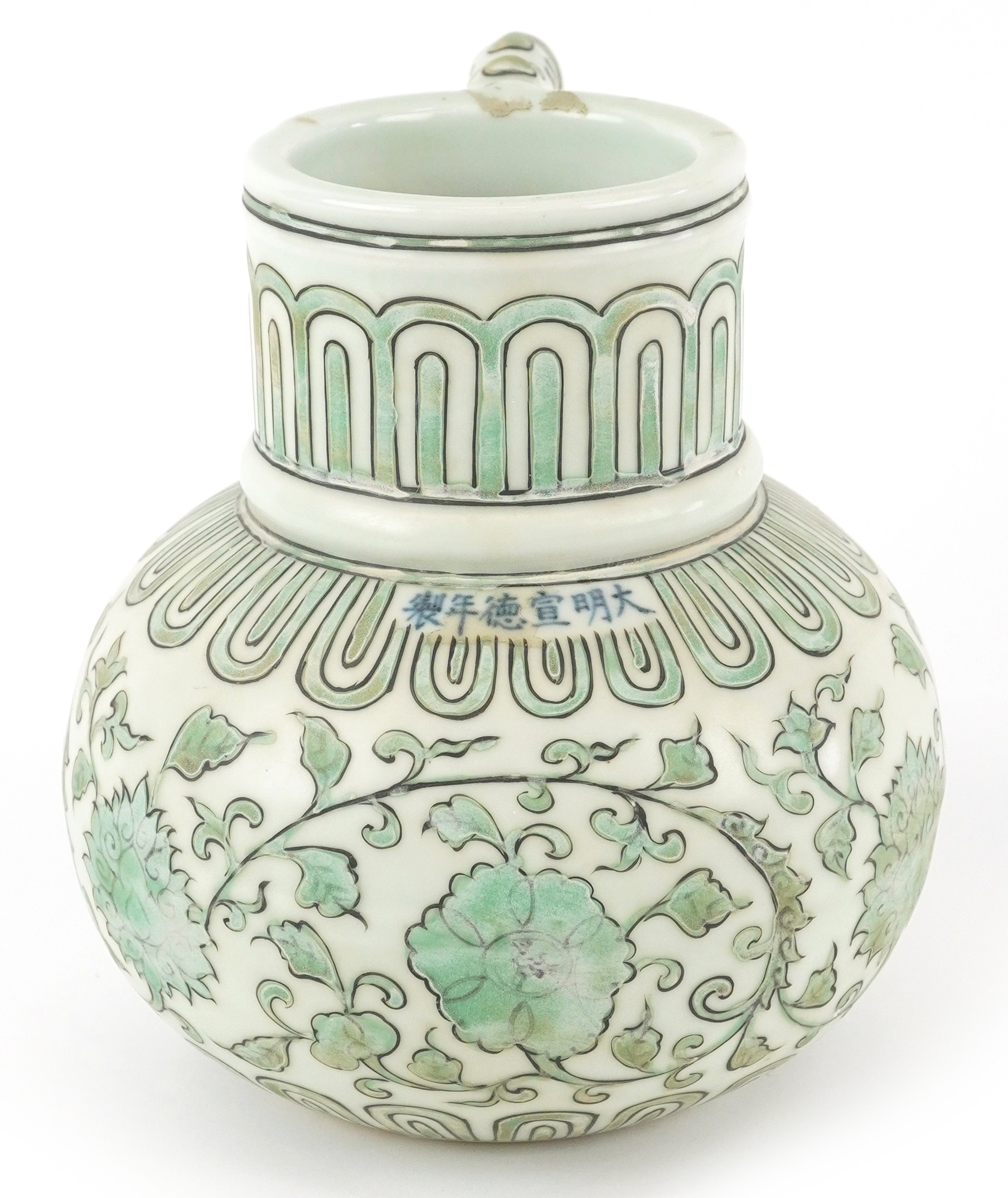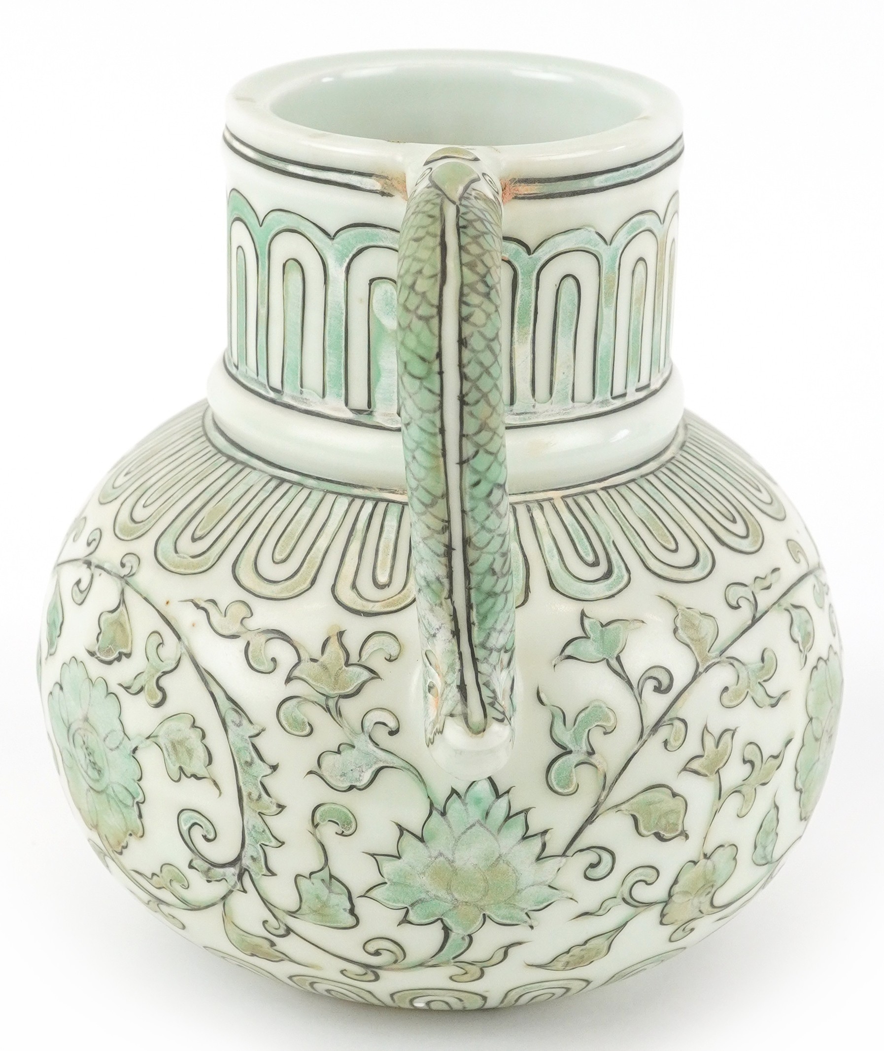 A Chinese porcelain ewer with fish handle, hand painted with flower heads and scrolling vines, six figure character marks, 17cm high.