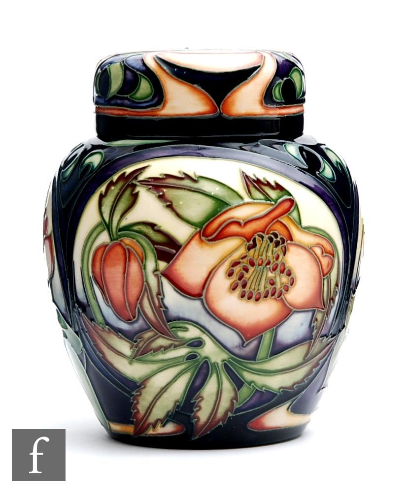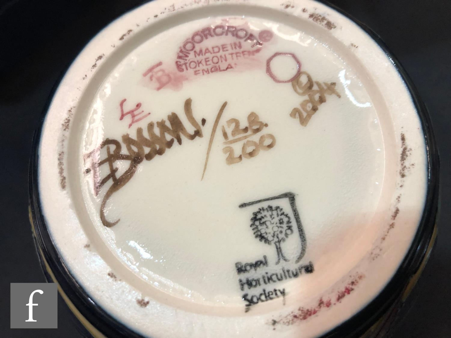 A Moorcroft Pottery ginger jar and cover decorated in the Ashwood Gold pattern designed by Emma Bossons for the Royal Horticultural Society, numbered 128 from a limited edition of 200, impressed mark and signed E. Bossons, boxed, height 16cm.