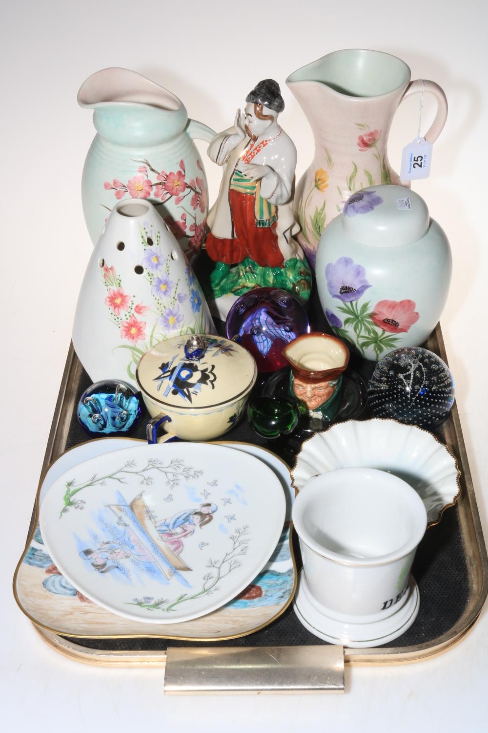 Two Radford jugs, jar and vase, Caithness paperweights, Doulton match holder, hand painted dishes, etc.