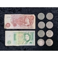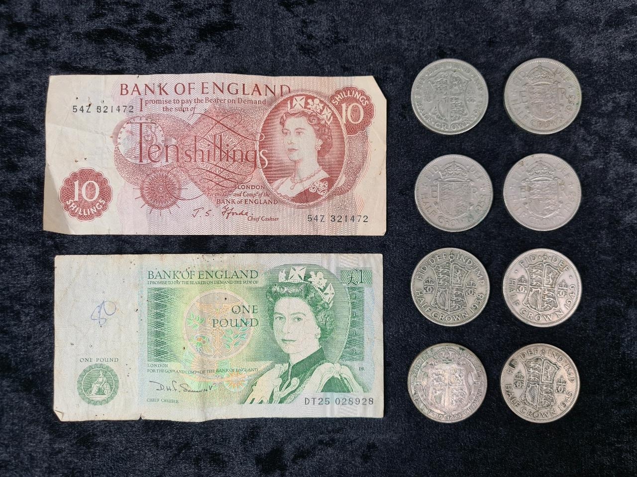 Ten shilling note, one pound note and 8 x half crowns (1923, 1931, 1938, 1945, 1949, 1955, 1958, 1963)