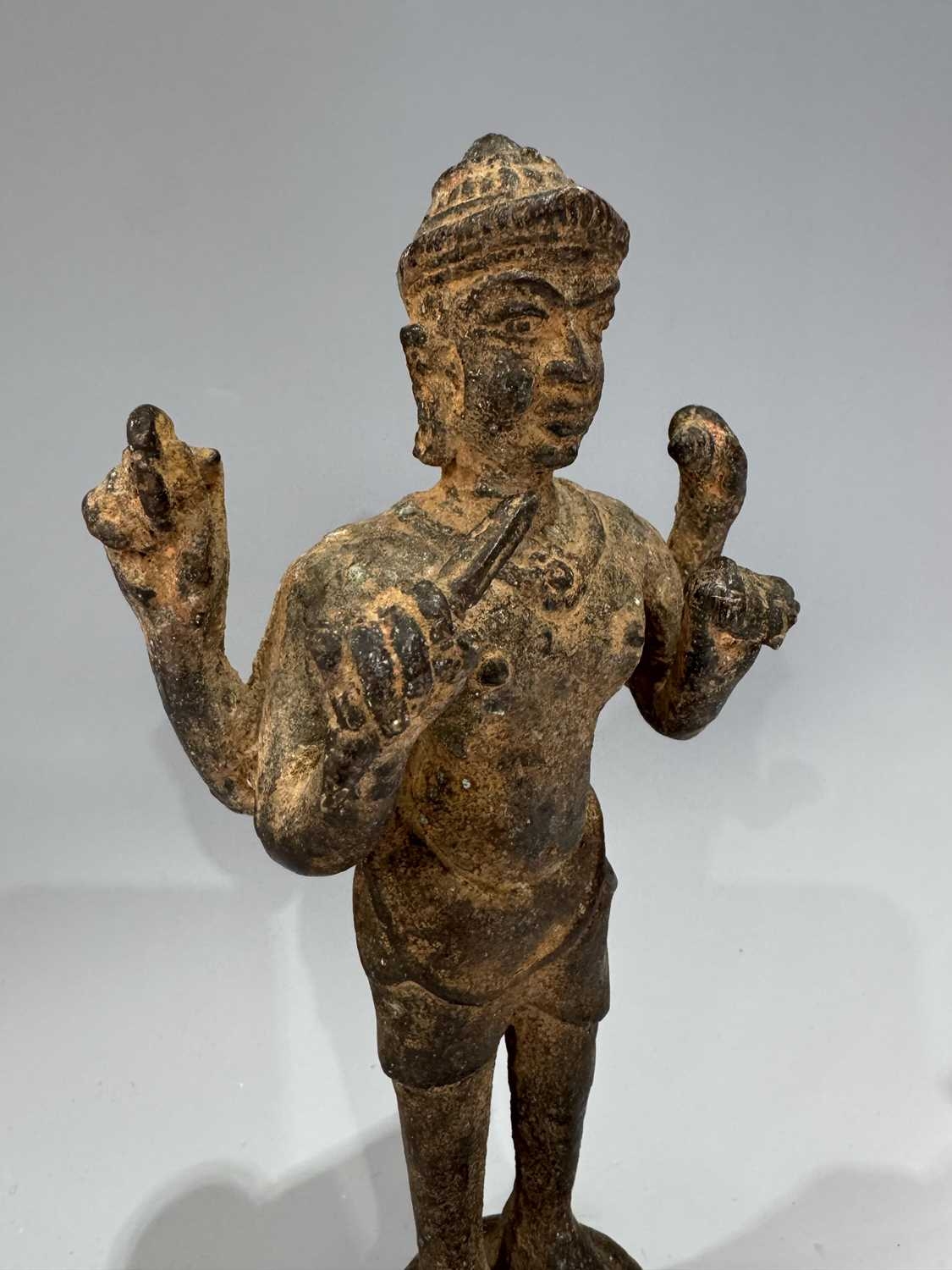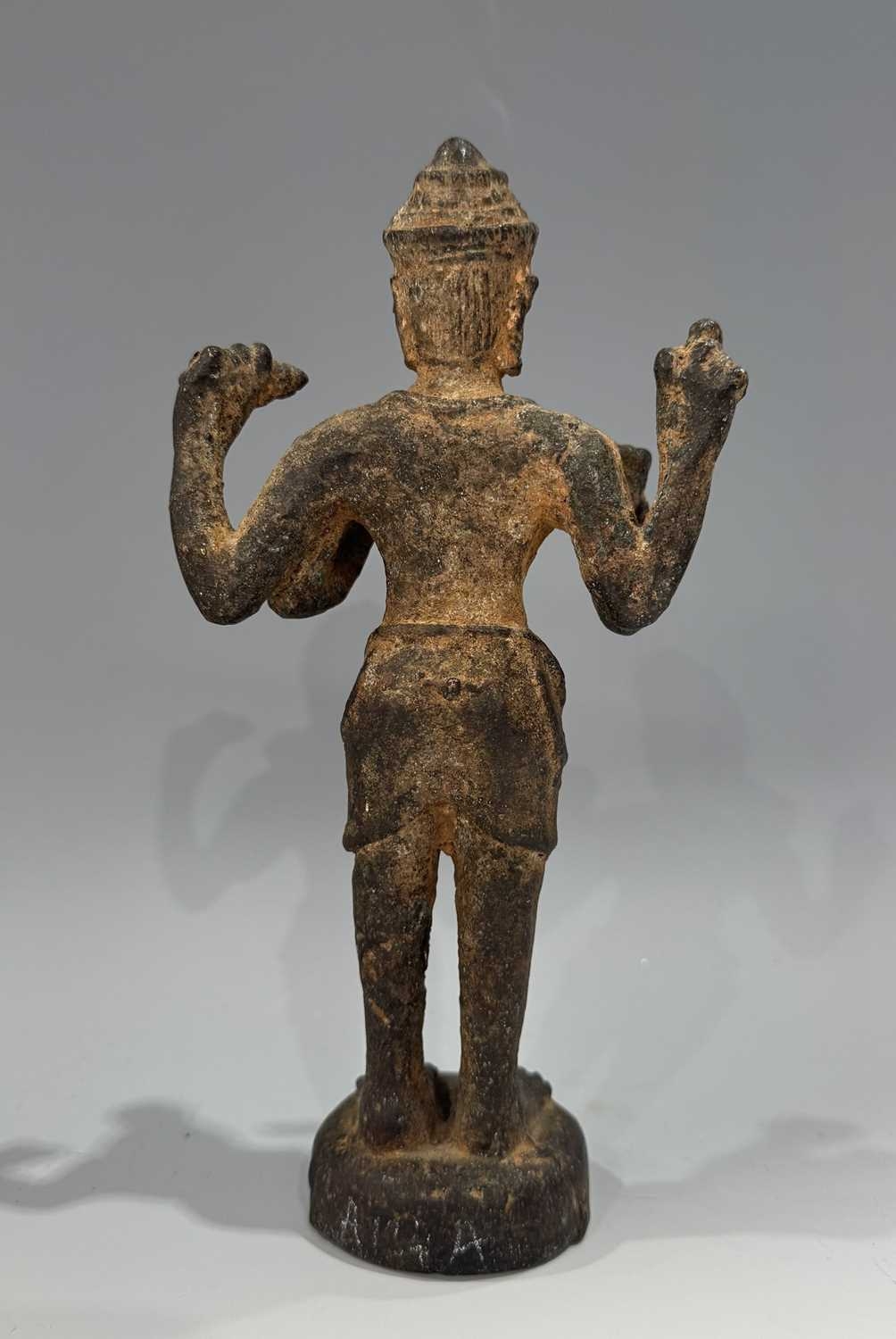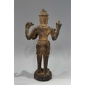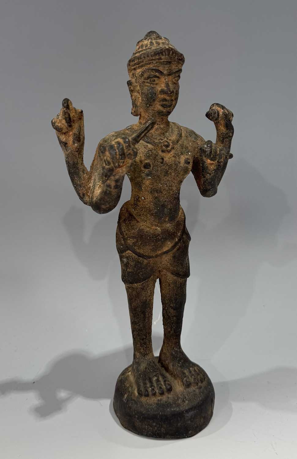 A Khmer type bronze figure of a four-armed Vishnu, 19th century or earlier, standing atop a circular base and holding the four typical attributes or ayudhas: the conch, lotus, mace and lotus, 22.5cm high Provenance: The Alain Rouveure Collection