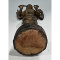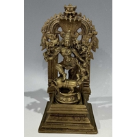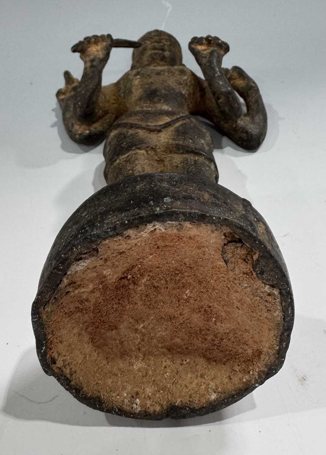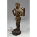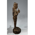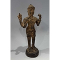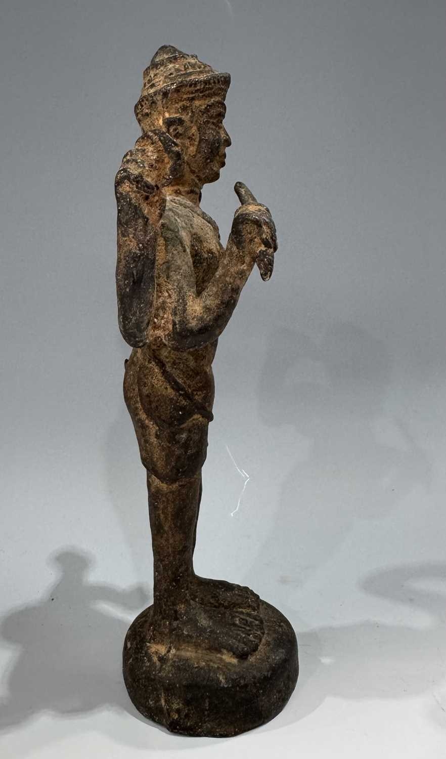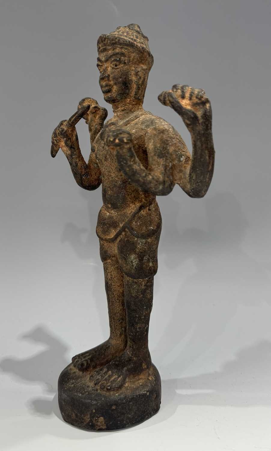 A Khmer type bronze figure of a four-armed Vishnu, 19th century or earlier, standing atop a circular base and holding the four typical attributes or ayudhas: the conch, lotus, mace and lotus, 22.5cm high Provenance: The Alain Rouveure Collection
