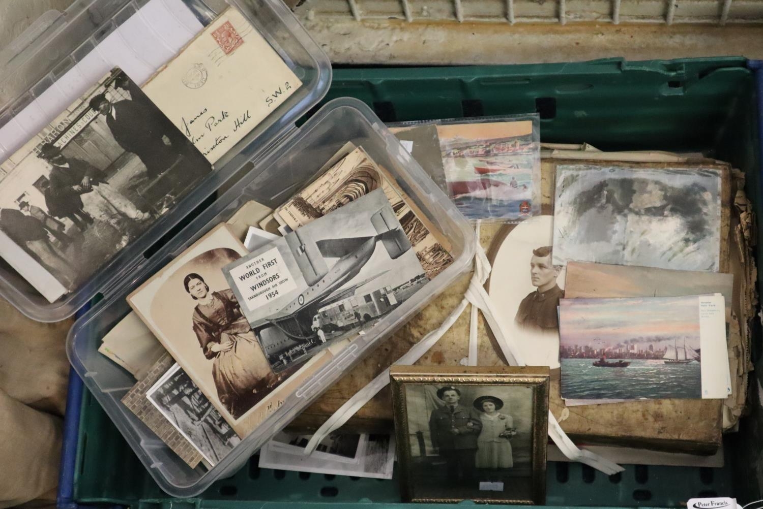 Box of Welsh military interest (Swansea) to include old envelope fronts with stamps, ruins of Y-Press 1915, Palestine, Jerusalem postcards, Swansea Sea Pilot service letter, telegrams, and other ephemera.