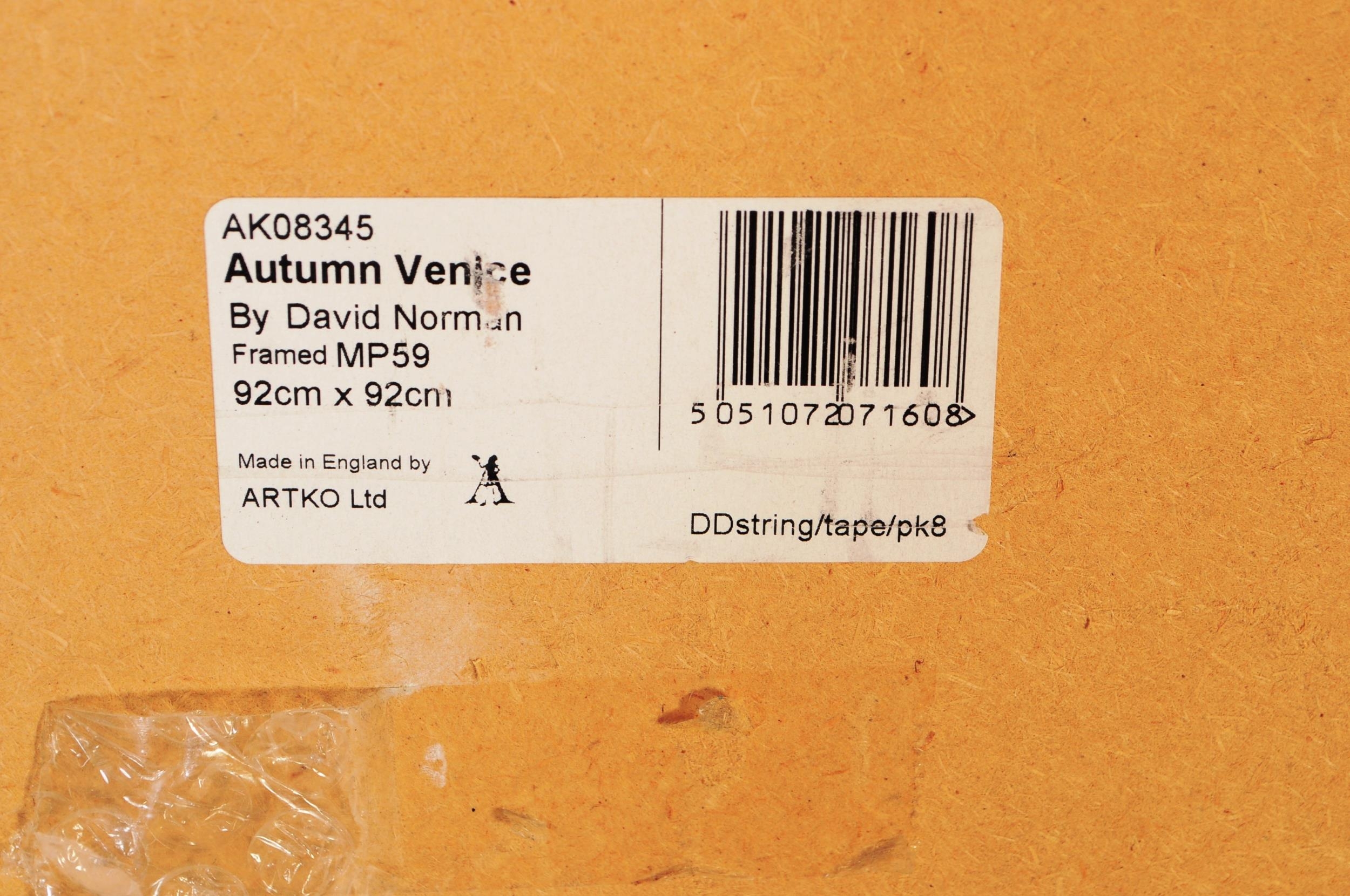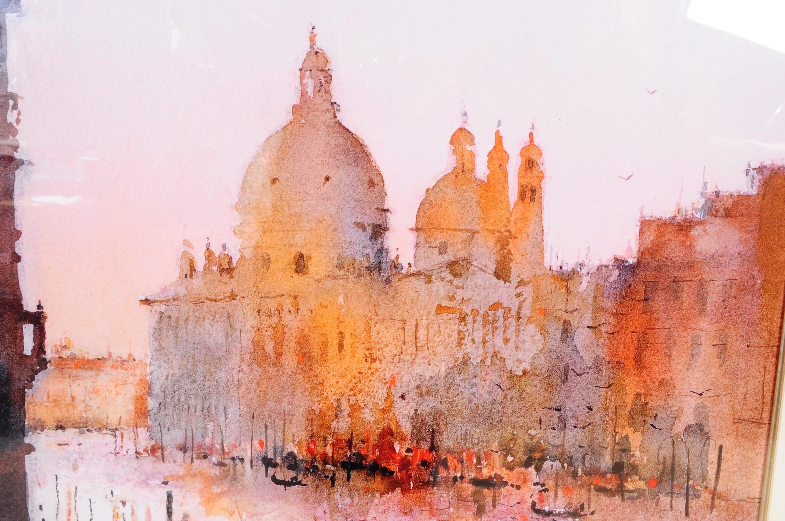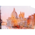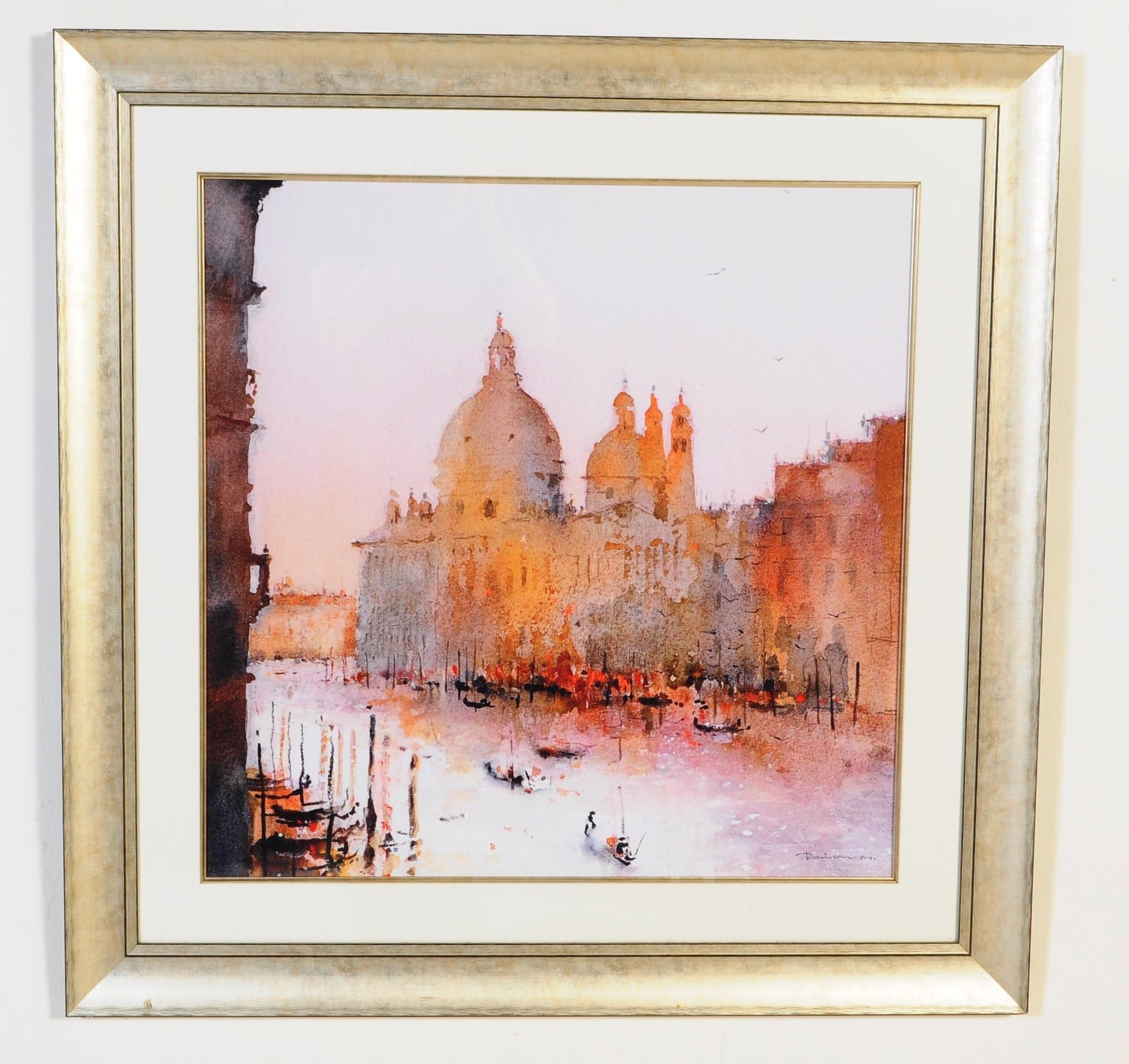 David Norman - A contemporary late 20th century watercolour print on paper. The scene depicting the Grand Canal, Venice with the Santa Maria della Salute Roman Catholic church in the foreground. David Norman in an ex architectural illustrator and his skills in perspective and draughtsmanship are beyond question. His watercolours can portray the boldest of colours or the most subtle sun bleached tones in the manner of Sir William Russell Flint. He favours little towns in France, Italy and Spain working from sketches completed on his travels. Framed & glazed. Measures 92cm x 92cm.