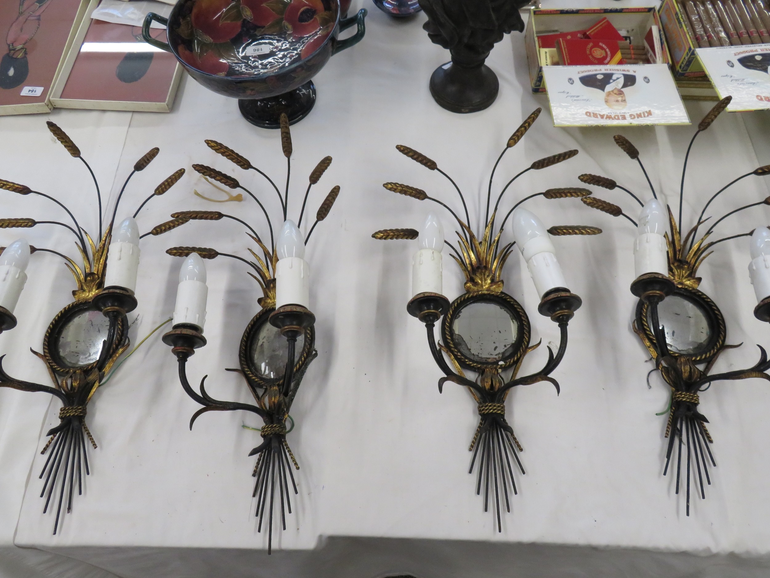 Set of four twin branch wire wall lights with ears of wheat decoration plus mirrors to centre