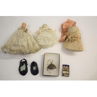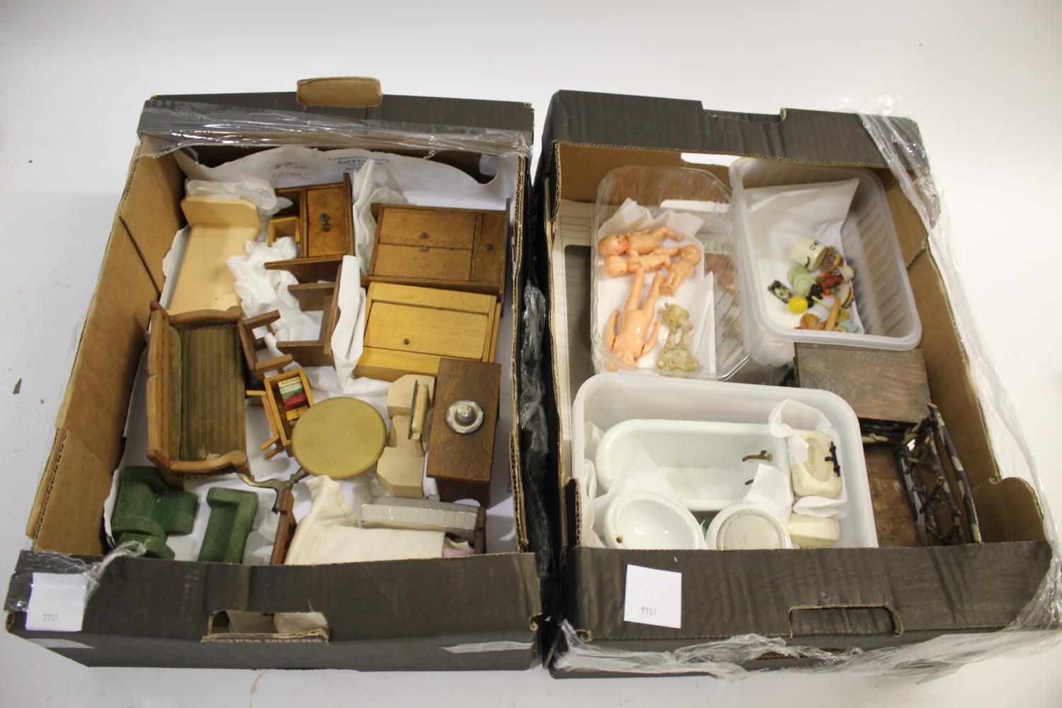 DOLLS HOUSE FURNITURE including bedroom furniture and bed, brass tripod table, 2 piece suite, garden table and bench, beds etc. Also with with bathroom items, miniature dolls, kitchen accessories etc.