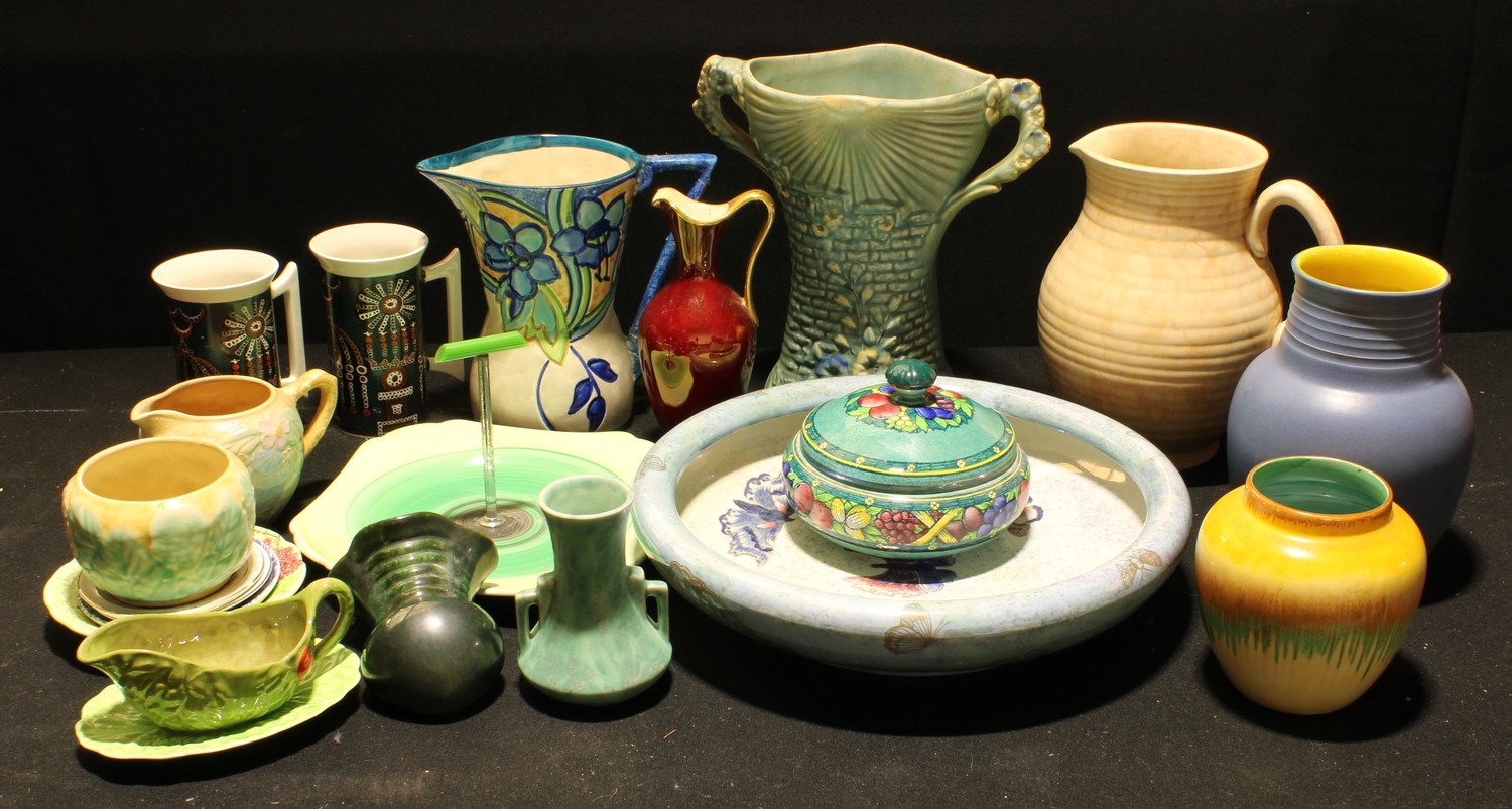 Decorative Ceramics - a Shelley banded cake stand; a Shelley Harmony Art Ware dripped vase; Arthur Woods jug; Portmerion magic City mugs; etc