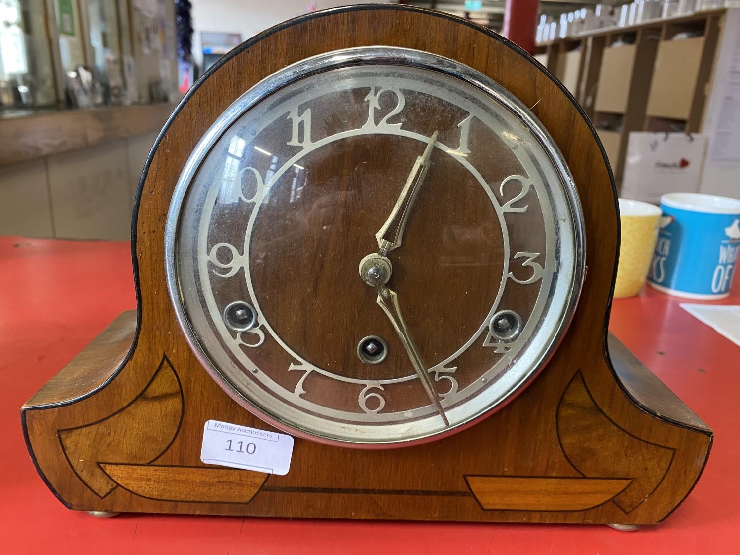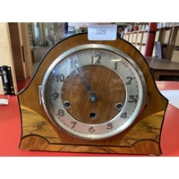 A 1930`s wooden cased mantle clock with key and pendulum (untested). Shipping unavailable
