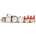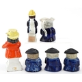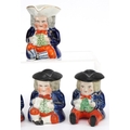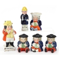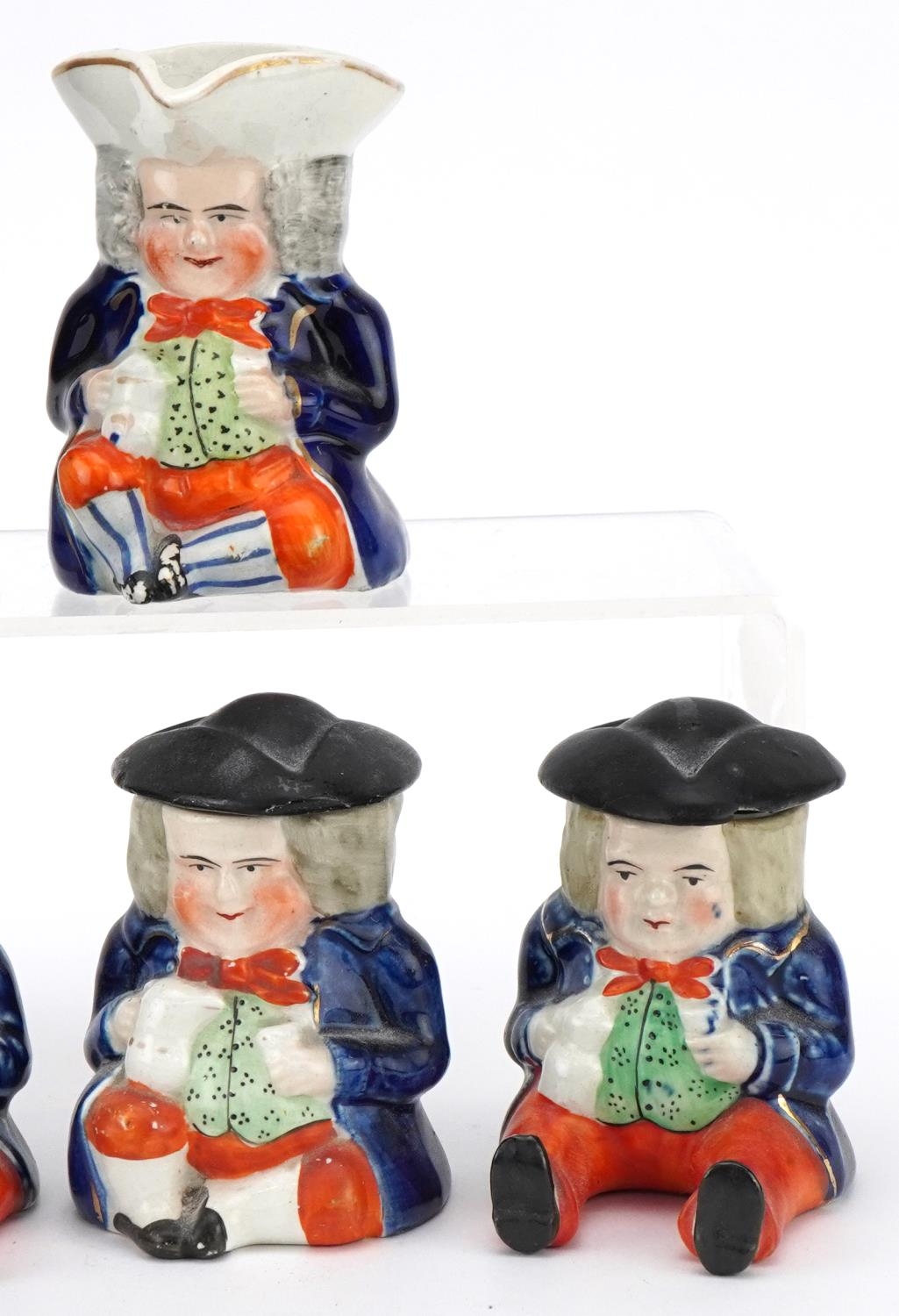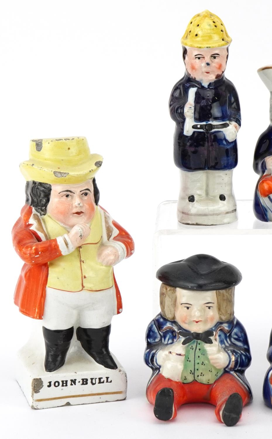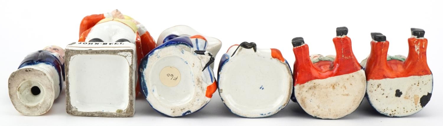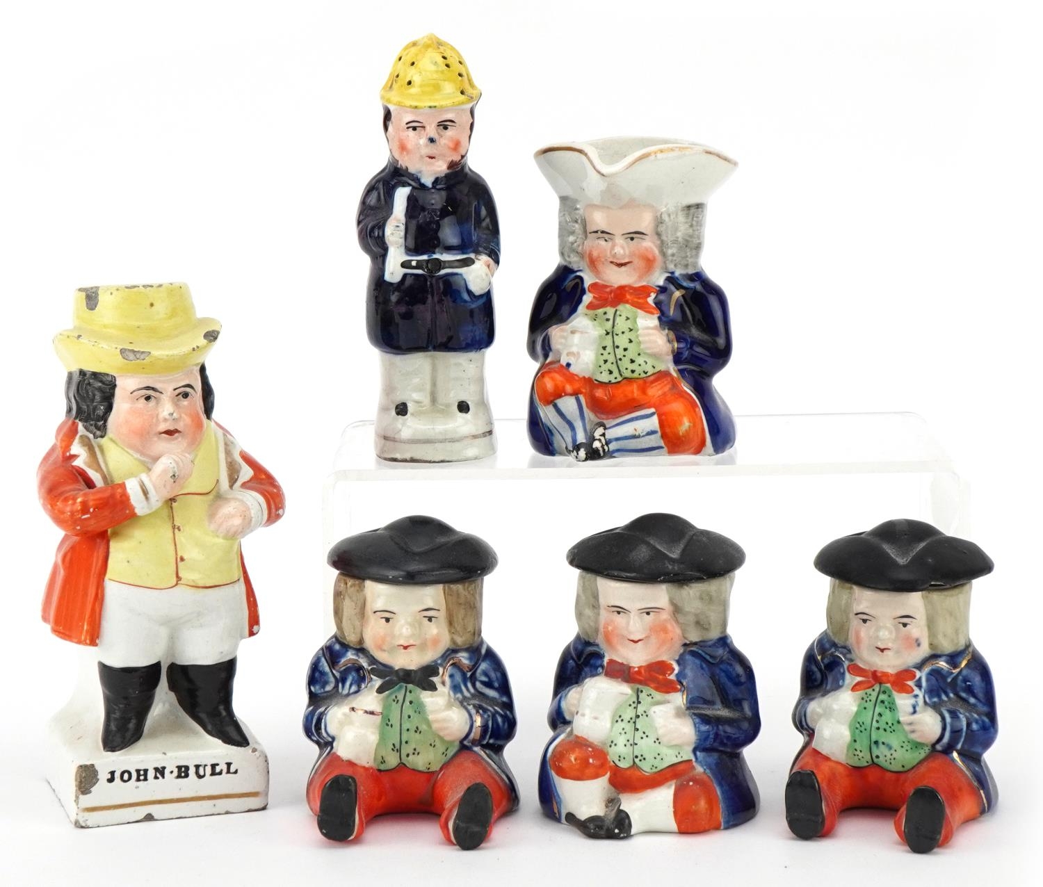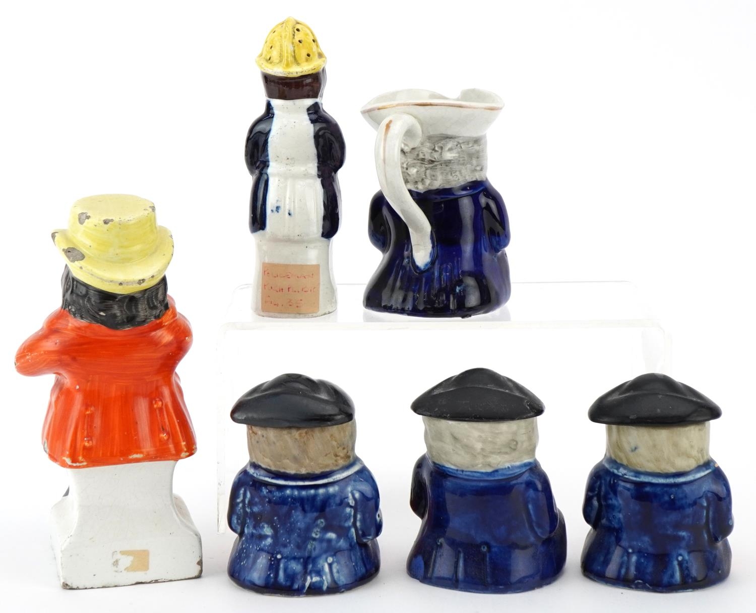 Six Victorian Staffordshire pottery figures comprising three condiment pots and covers, a Toby milk jug, a policeman pepper shaker and a John Bull figure, the largest 14cm high.