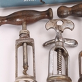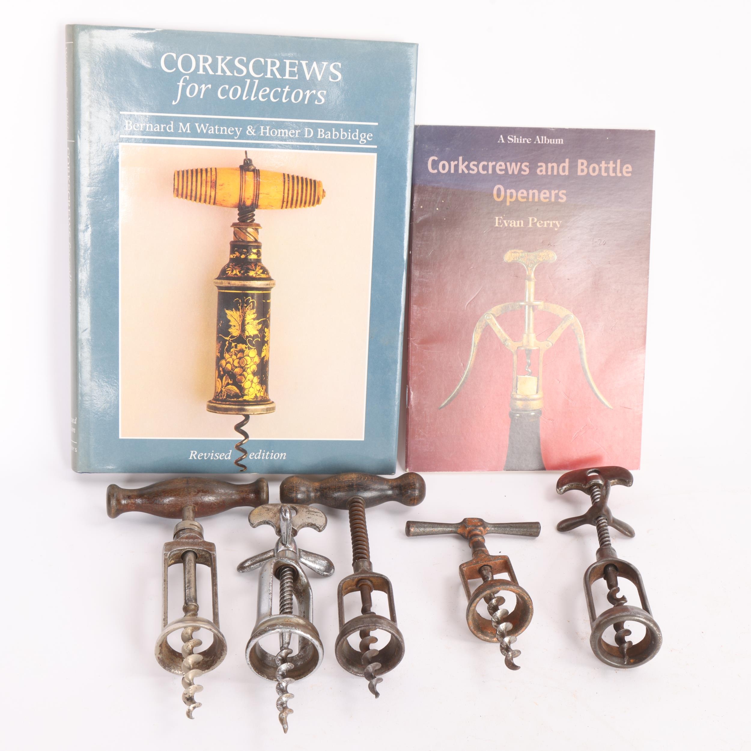 5 assisted frame corkscrews, including 2 French reversible types, Wooden handled model marked "Record", together with Corkscrews for Collectors book by Watney & Babbidge and another booklet.