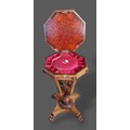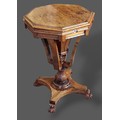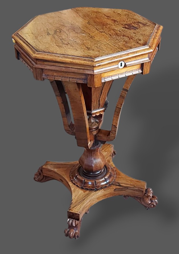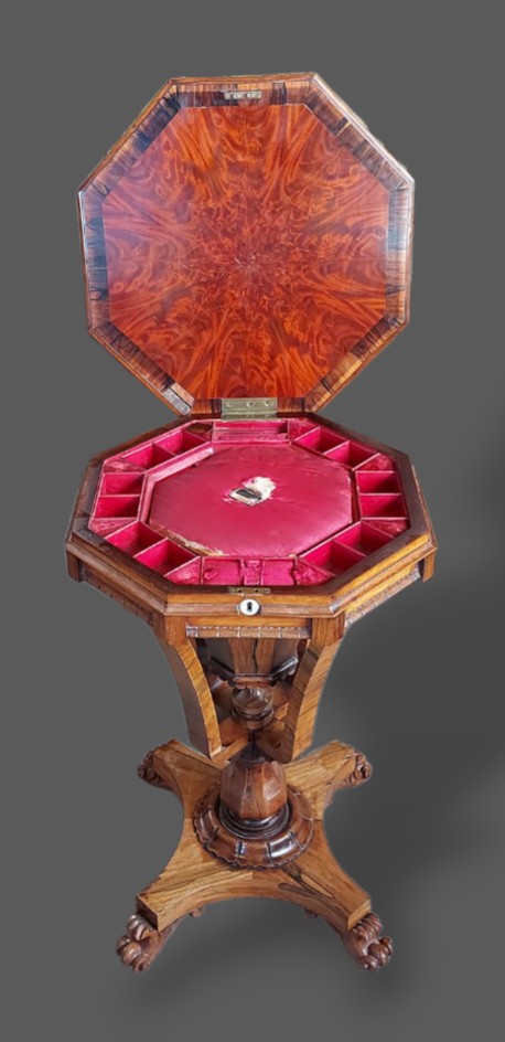 A Victorian Rosewood worktable of octagonal form, the hinged top enclosing a fitted interior raised upon shaped supports with platform base and scroll feet