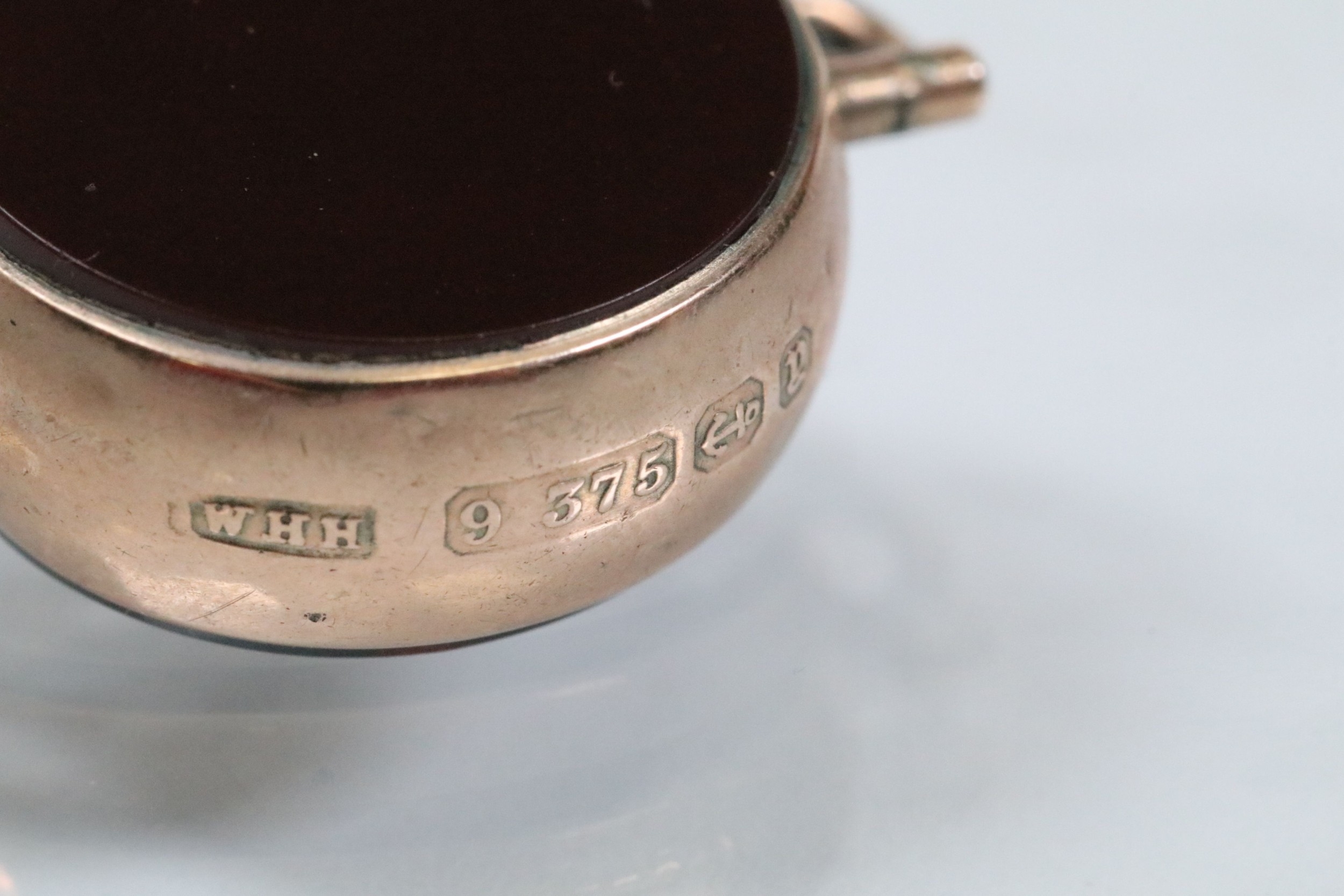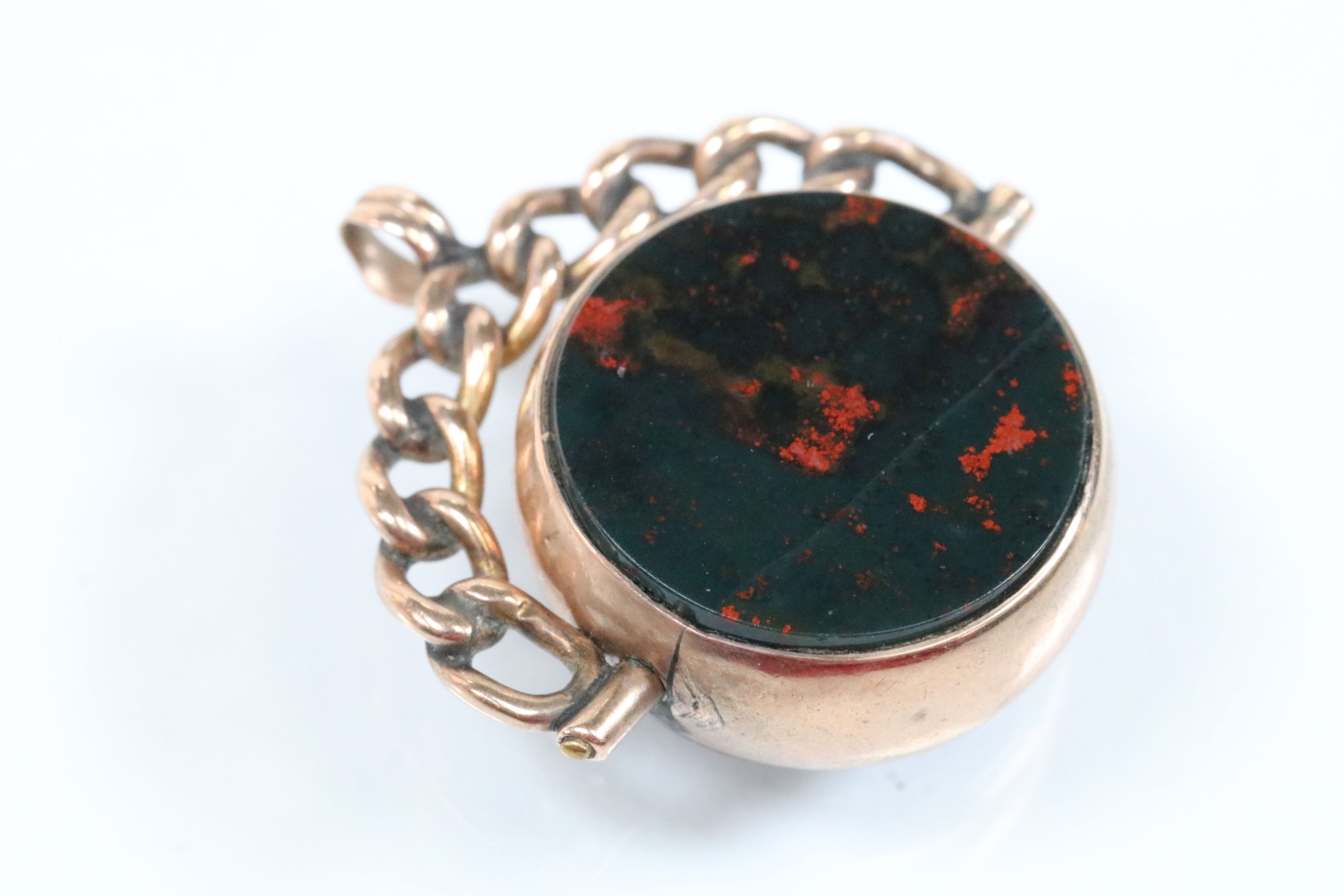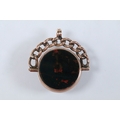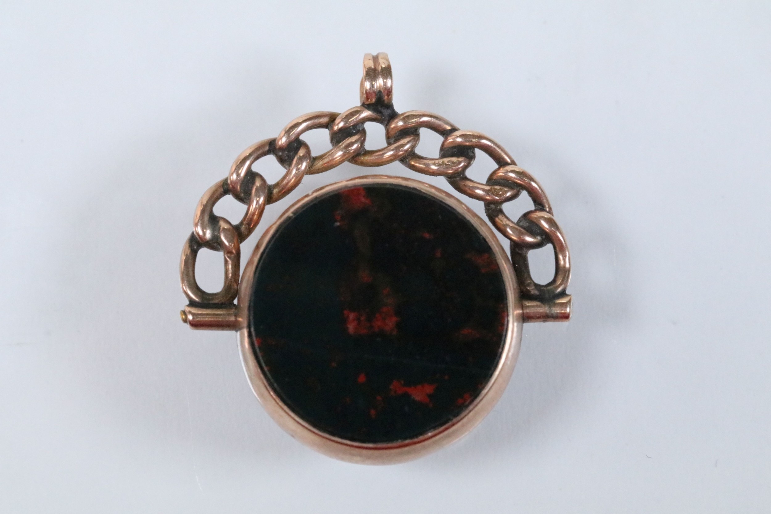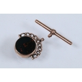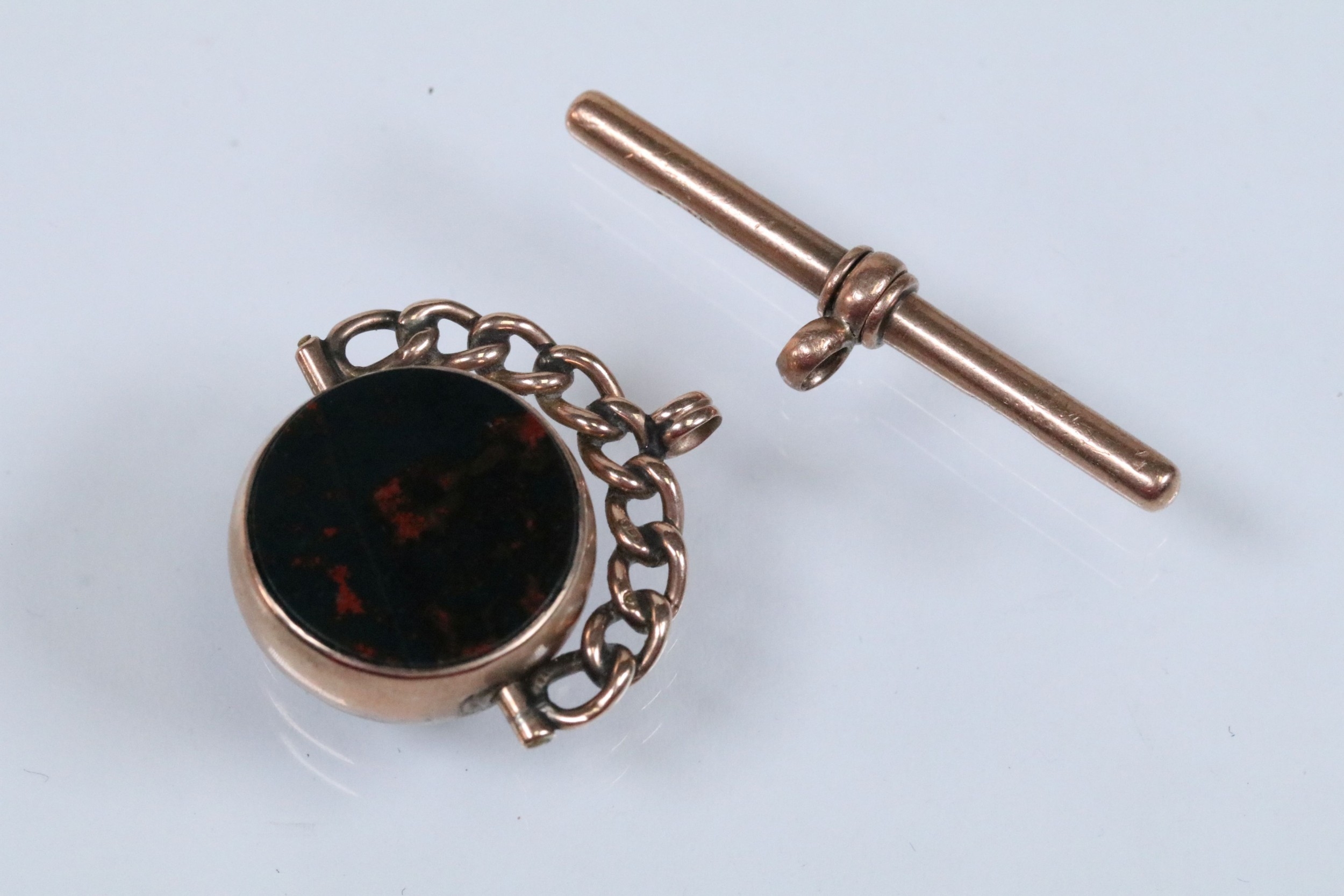 9ct gold Victorian bloodstone and onyx swivel fob (hallmarked Birmingham 1898) together with a 9ct gold T bar (marked 375). Fob measures 27mm.