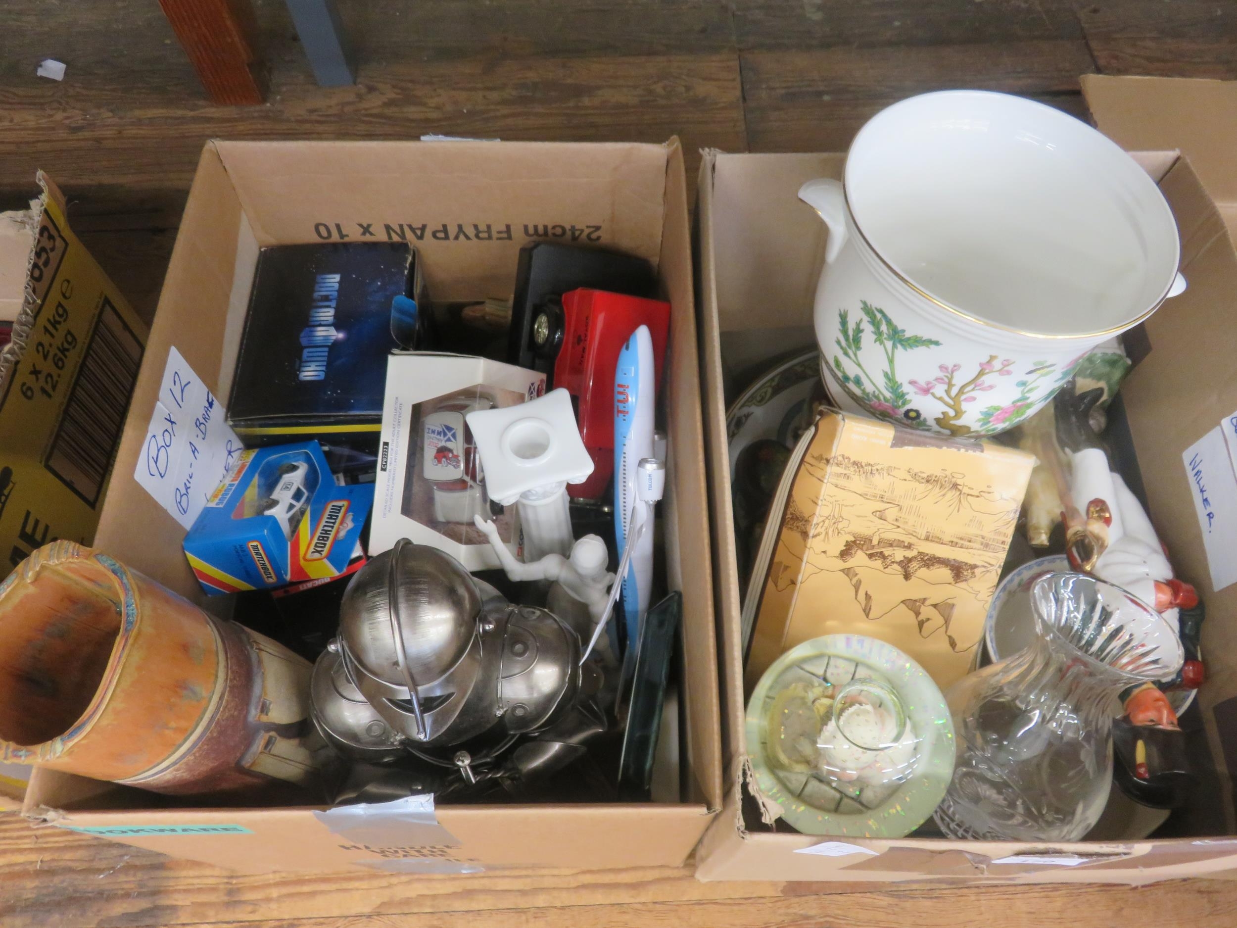 Two Boxes of Mixed Bric-a-Brac, Minton Bowl, Bird Figures, Doctor Who Cup Cars etc