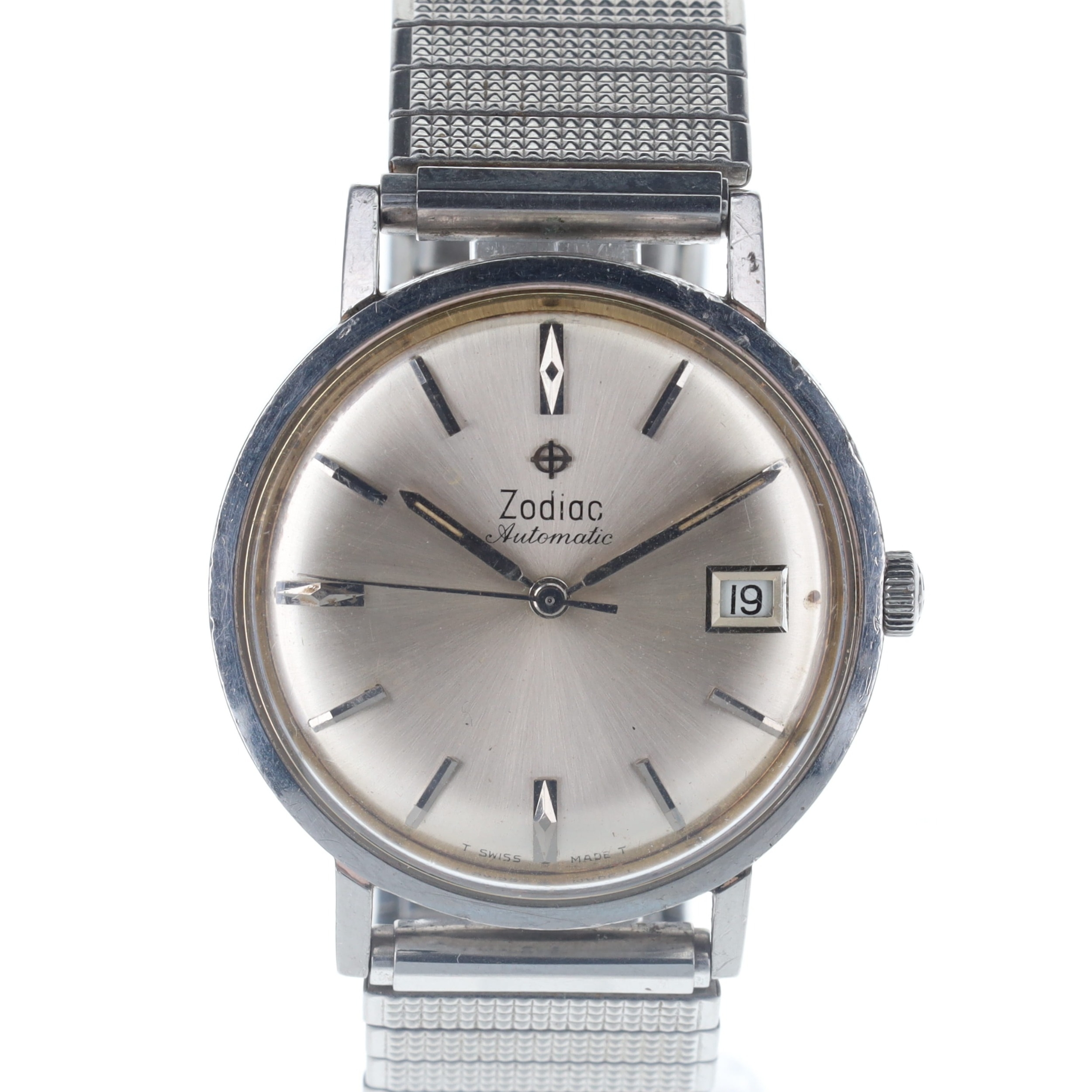 Zodiac - Vintage Automatic Steel Dress Watch. Swiss made automatic movement. Case and bracelet made of stainless steel. Acrylic crystal in good condition. Silvered dial with silver hands and hour markers, date window at 3 o'clock. Watch is in full working order, no box or papers included.