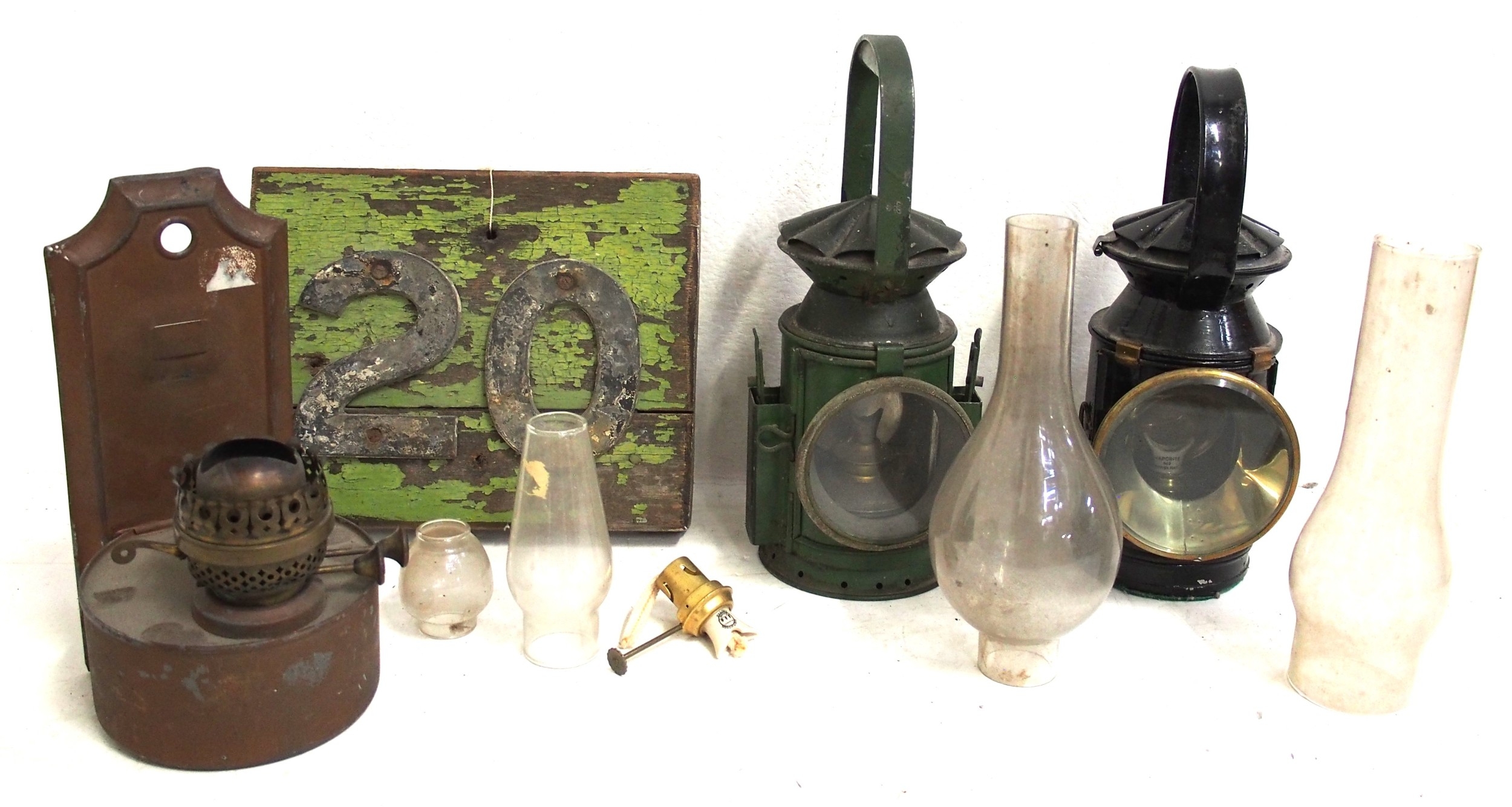 Miscellaneous items - BR(S) 3 aspect handlamp, WD 3 aspect - both complete & in good order, wood & C/I "20", wall lamp, glass funnels & glasses etc as per images. (A3X) (Dispatch by Mailboxes/Collect from Banbury Depot)