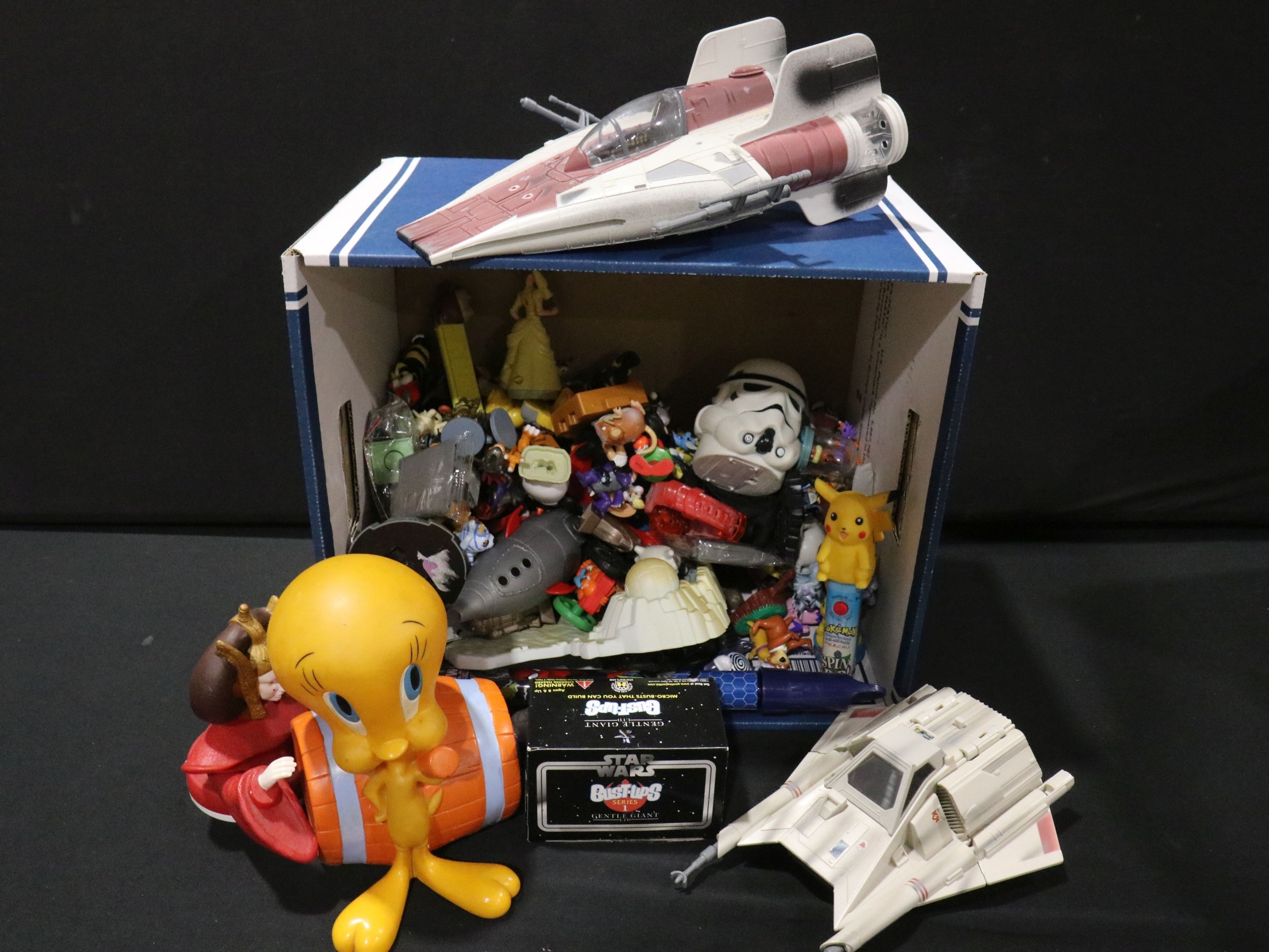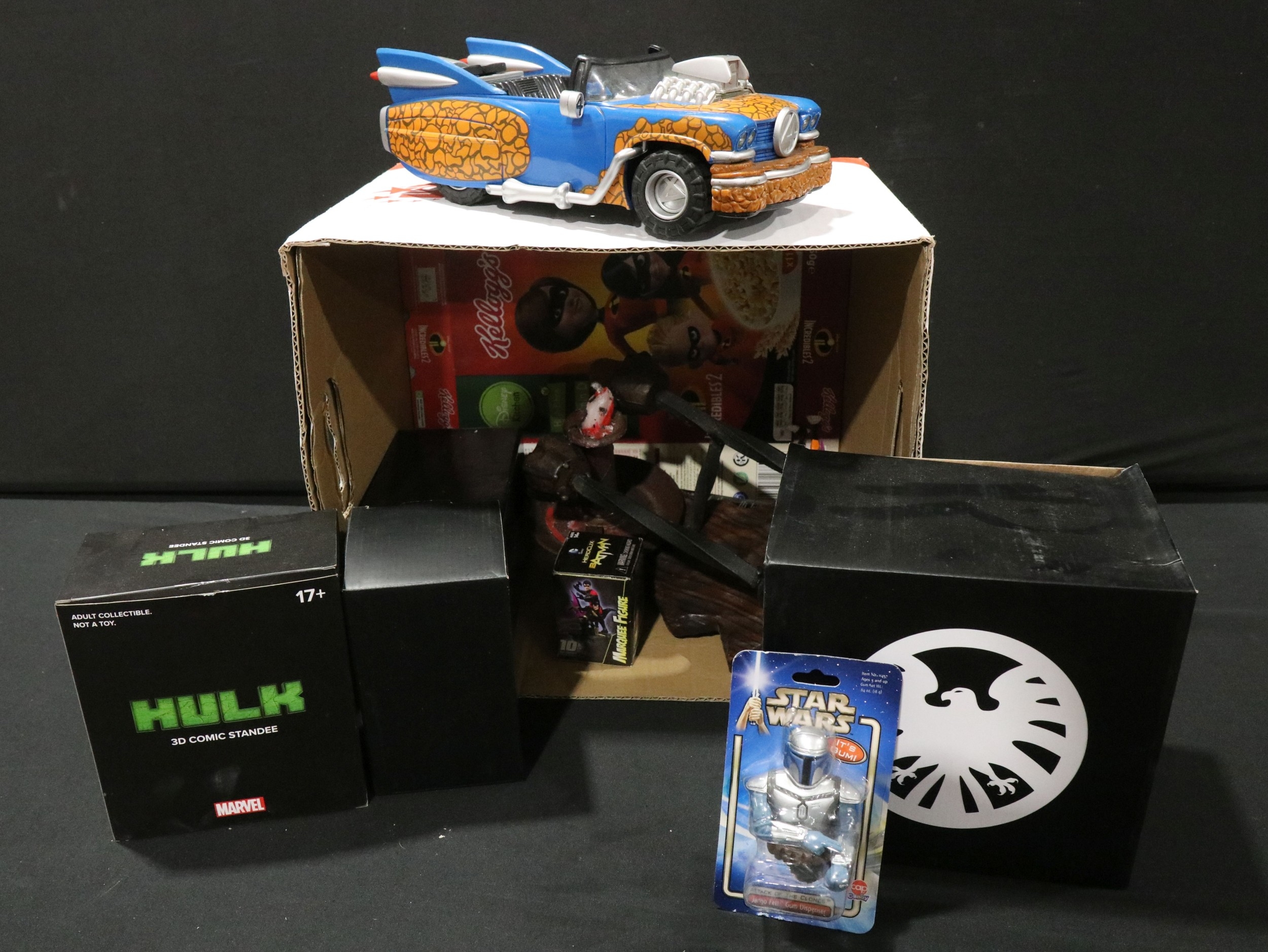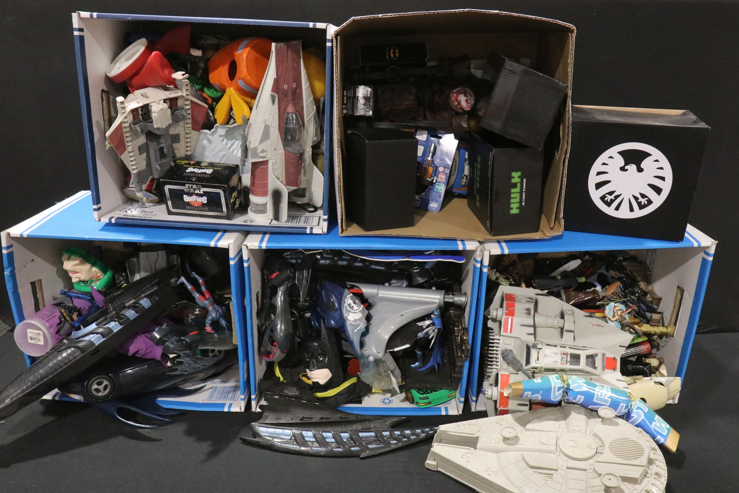 Large collection of Sci Fi and TV related toys, figures and collectables to include Star Wars, Batman, Marvel etc featuring boxed Gentle Giant Star Wars Bust-Ups, boxed Loot Crate Hulk 3D Comic Standee, many circa 1990s/2000s Batman figures and vehicles etc (5 boxes)