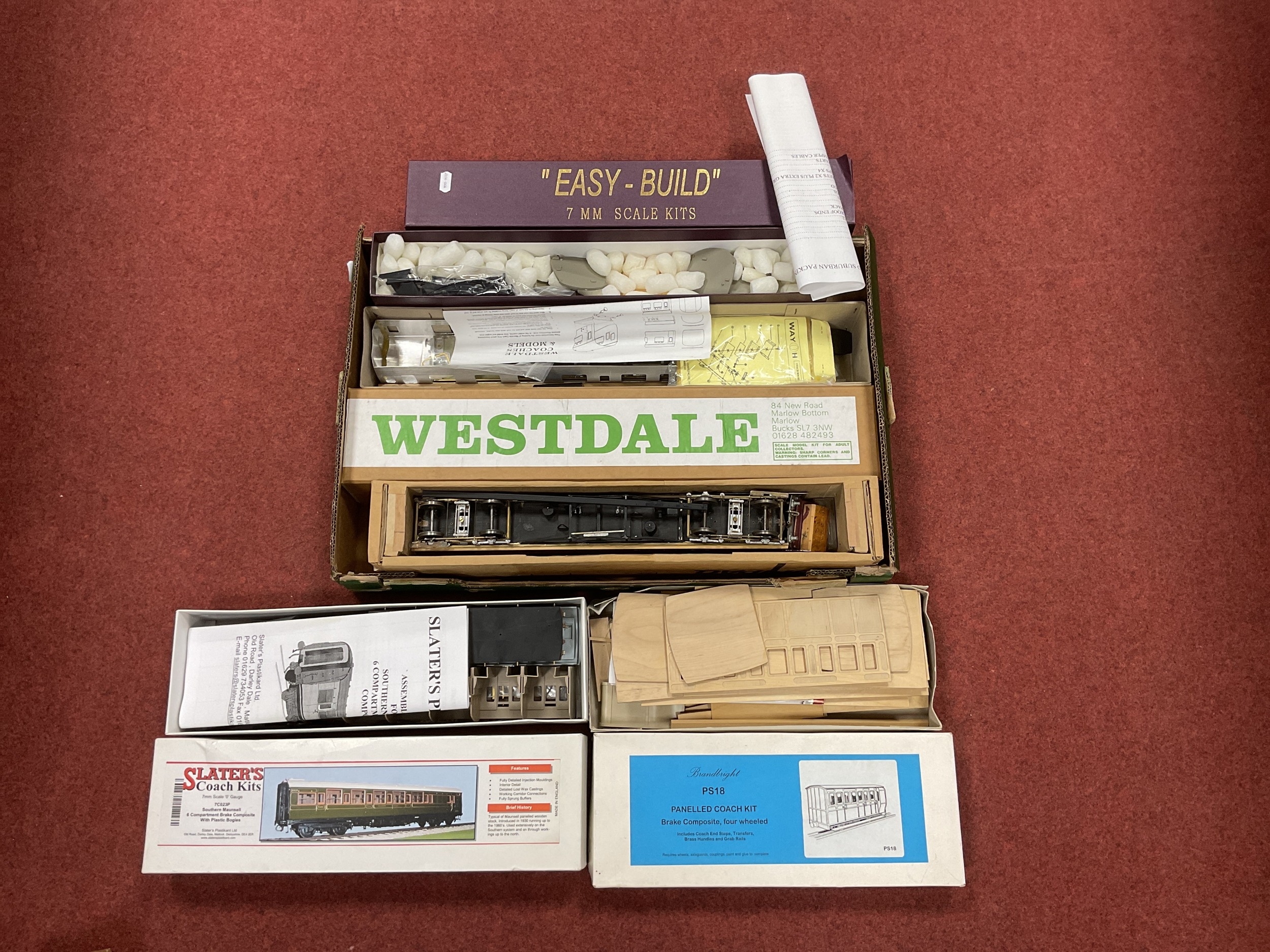 Five 'O' Gauge/7mm Boxed Passenger Coach Kits, comprising a unstarted "Easy Build" Suburban, the following four have varying degrees of build commencement, a Brandbright Ref PS18 panelled four wheel composit, a Slaters Ref No 7C23P bogie Southern Maunsell composite, a Westdale bogie BR MKI and a 75% complete L.M.S. non corridor composite (bogies, wheels, interior fitted), overall good condition - box contents unchecked.