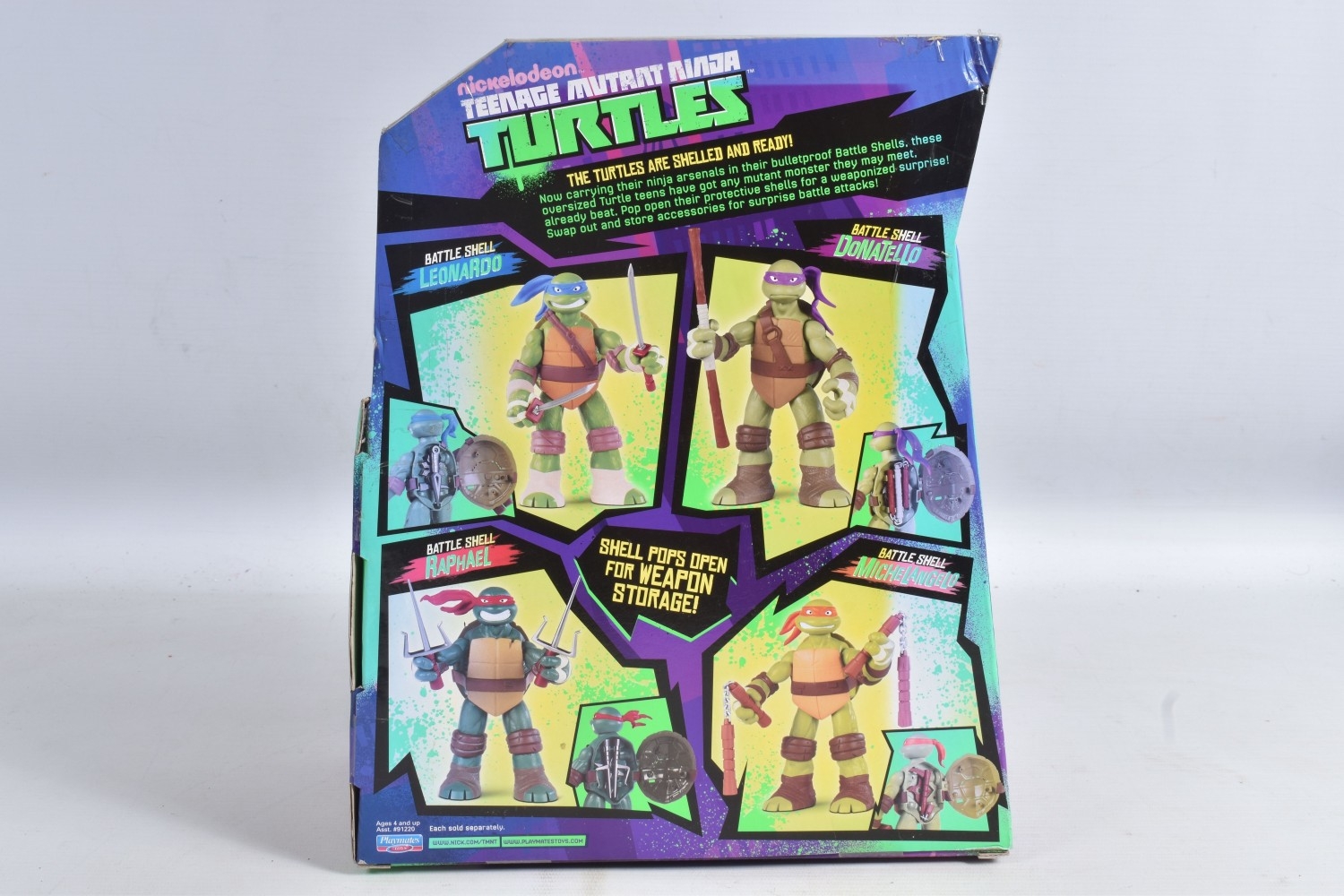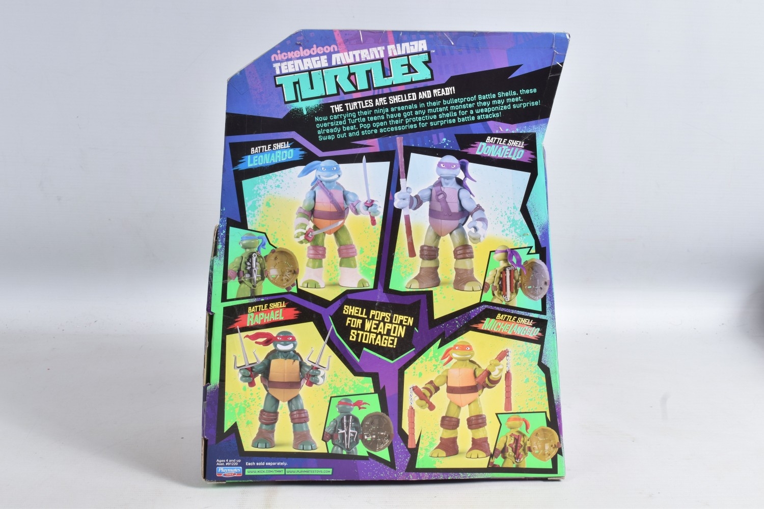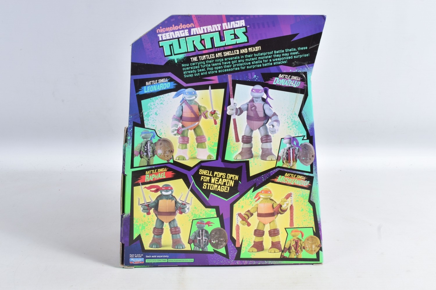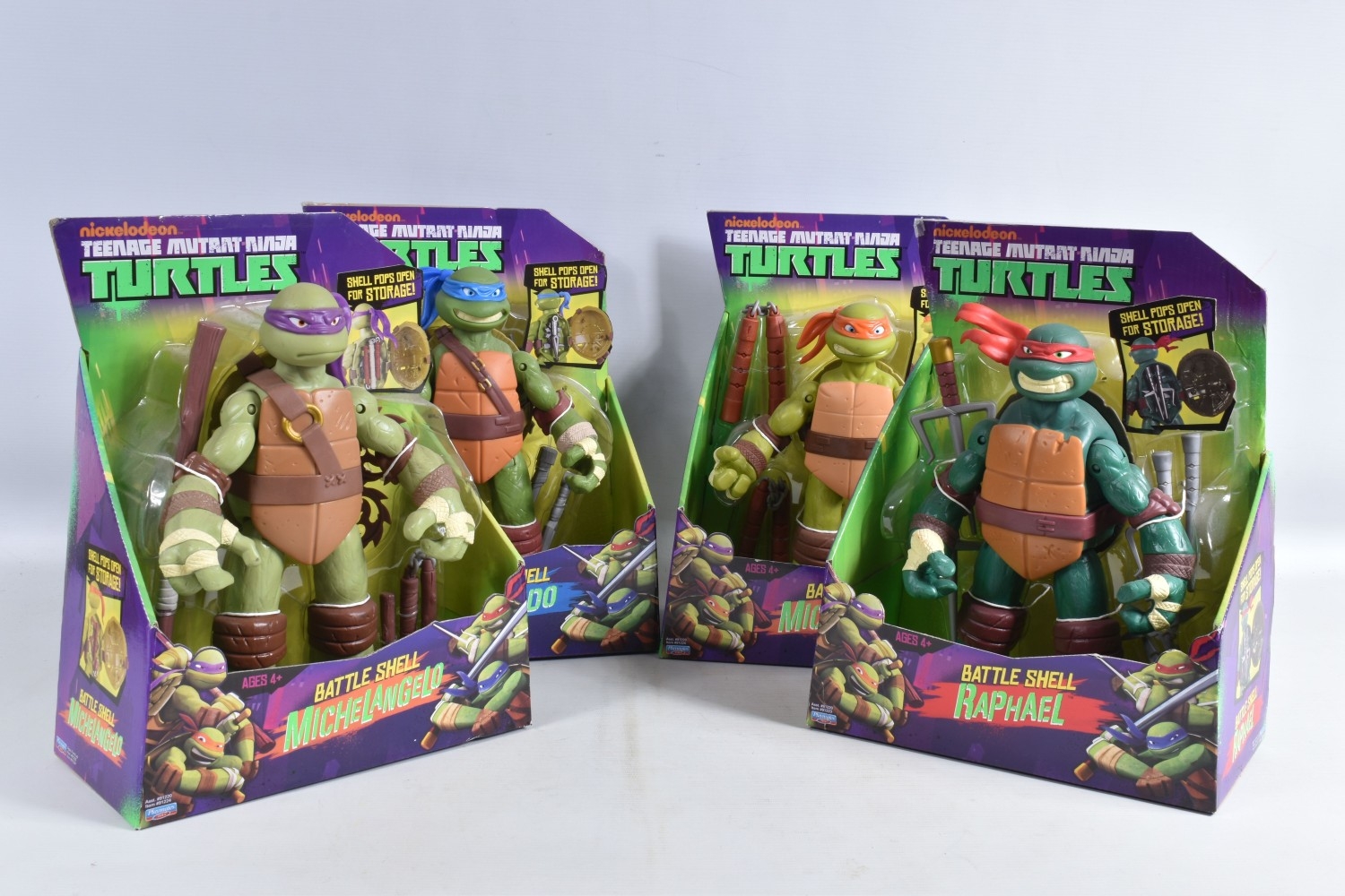 FOUR BOXED PLAYMATES NICKELODEON TEENAGE MUTANT NINJA TURTLE BATTLE SHELL MODELS, to include Leonardo 91221, Raphael 91223, Michelangelo 91224, Donatello in a 91224 box, other than the manufacturing error all appear in a new condtion wirh light dust