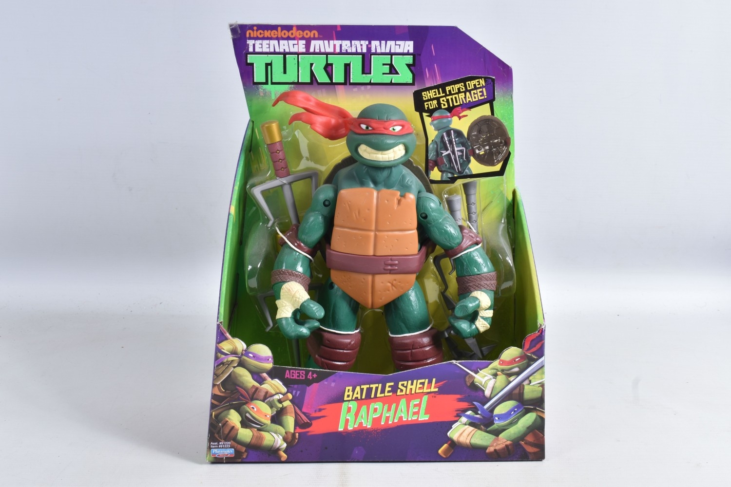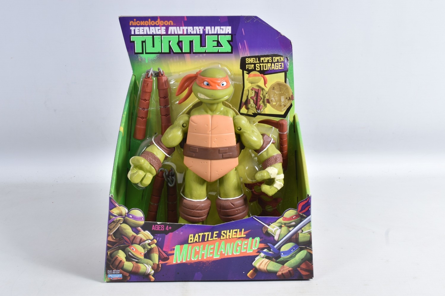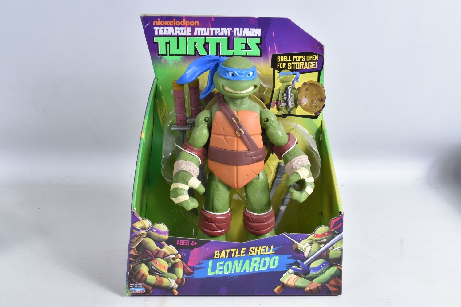 FOUR BOXED PLAYMATES NICKELODEON TEENAGE MUTANT NINJA TURTLE BATTLE SHELL MODELS, to include Leonardo 91221, Raphael 91223, Michelangelo 91224, Donatello in a 91224 box, other than the manufacturing error all appear in a new condtion wirh light dust