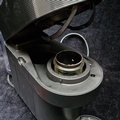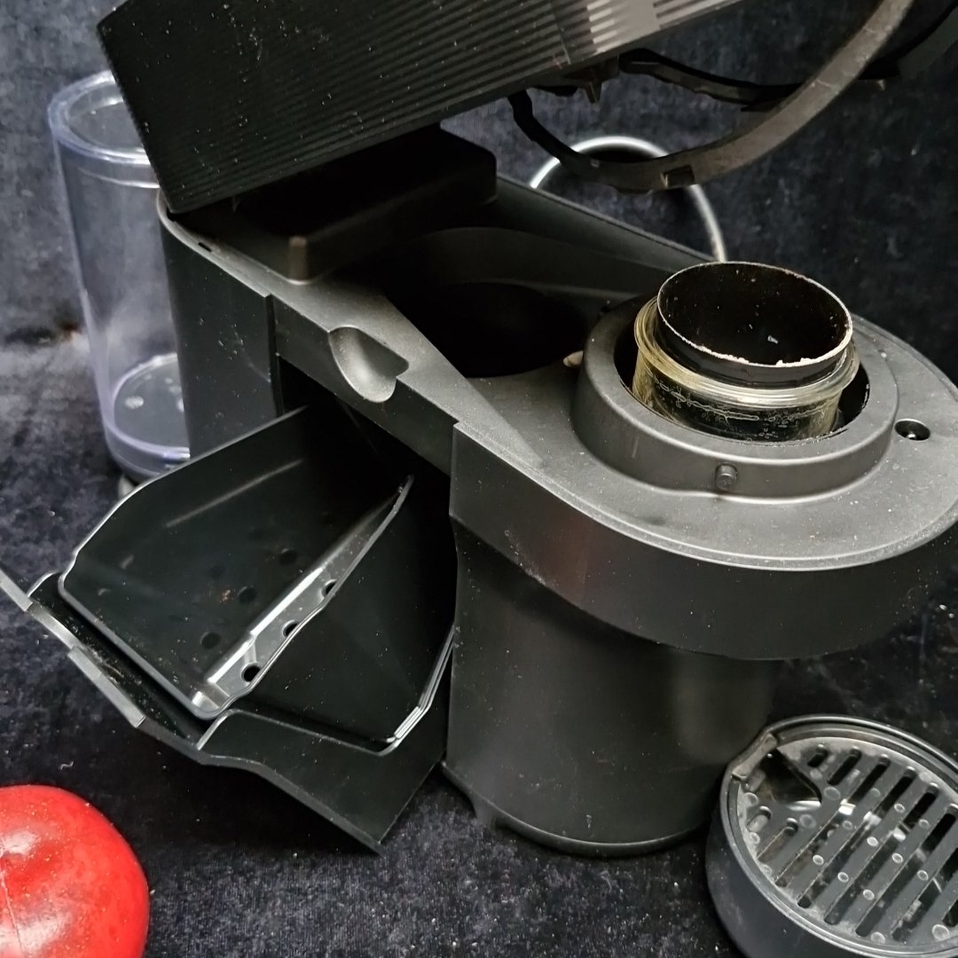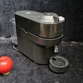 A Nespresso capsule coffee machine, in black with ribbed upper band, hinged head, detachable water reservoir, and removable drip tray and pod drawer.