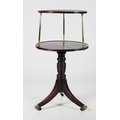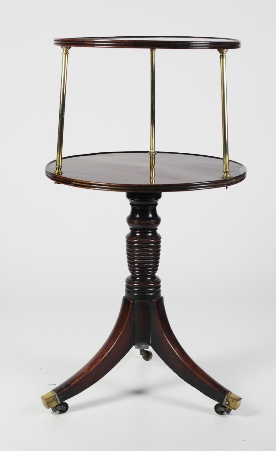 A fine Georgian period mahogany two tier circular Dumbwaiter, with brass uprights on a beehive type turned pillar terminating on tripod base with brass castors, approx. 110cms (43") tall. (1)
