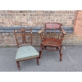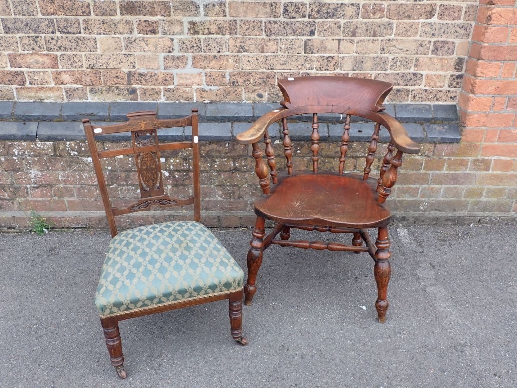 A VICTORIAN ELM AND ASH SMOKER'S BOW OR CAPTAINS CHAIR and an Edwardian nursing chair with inlaid decoration (2)