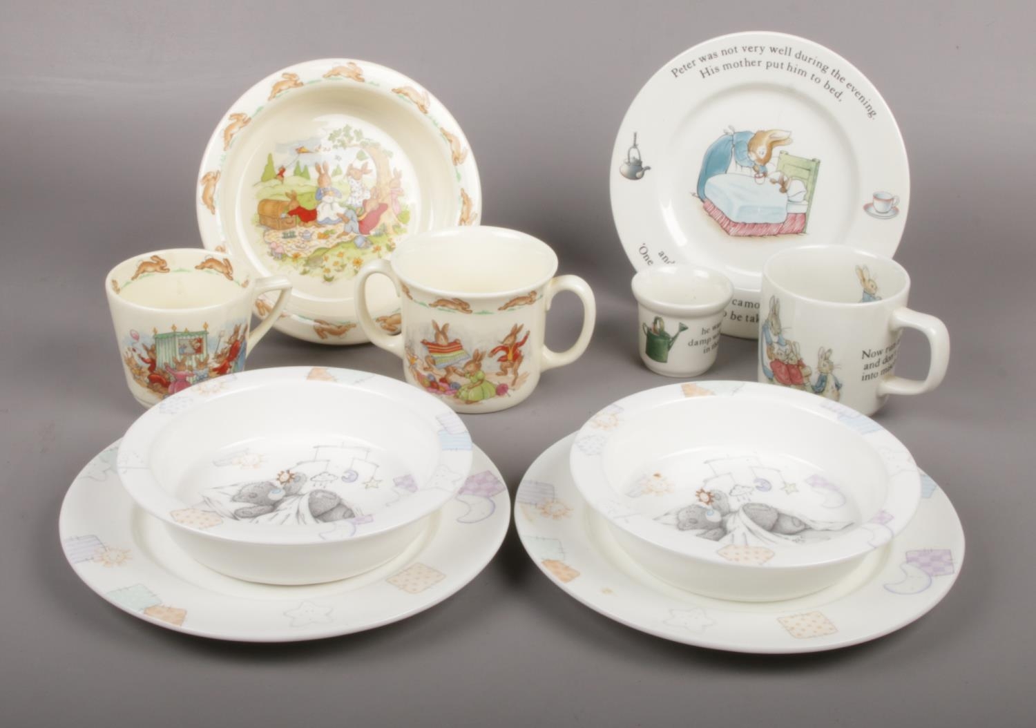 Royal Doulton 'Bunnykins' Three piece child's set, Wedgwood 'Peter Rabbit' plate, cup & egg cup, to include two Me to you child's dish and plates