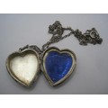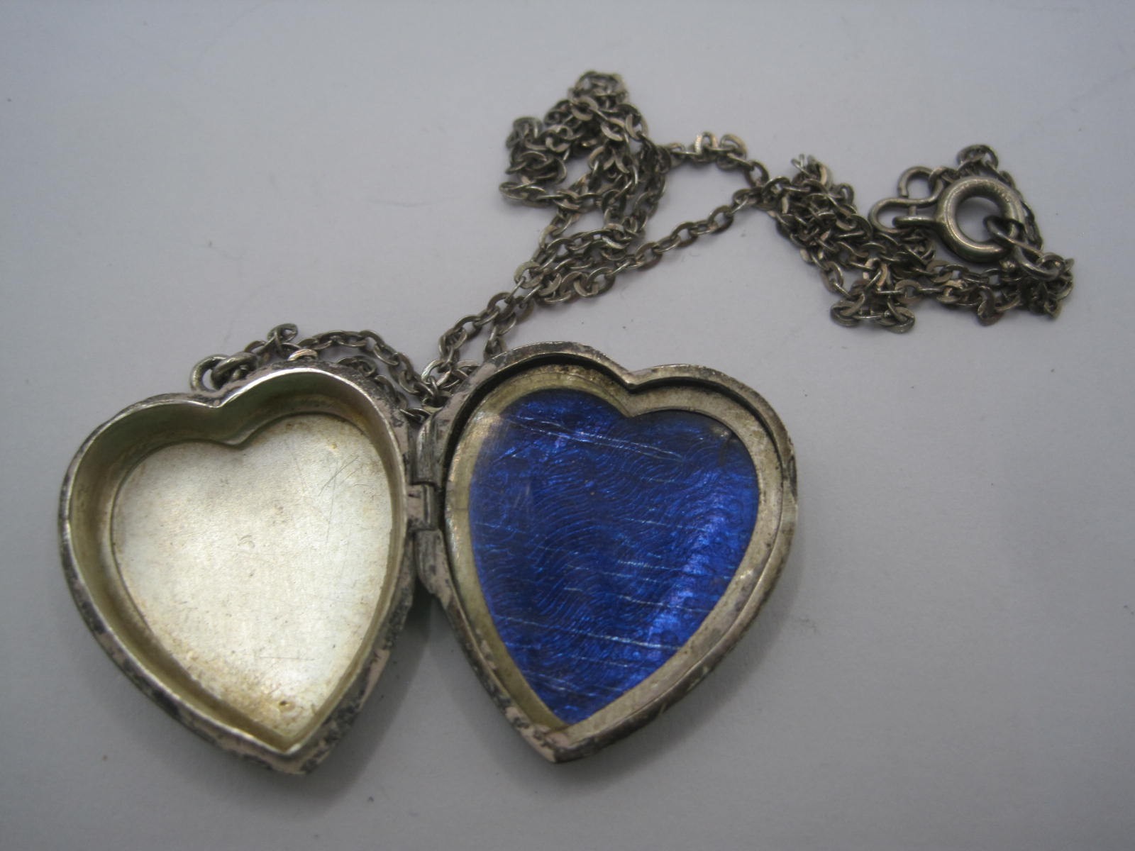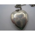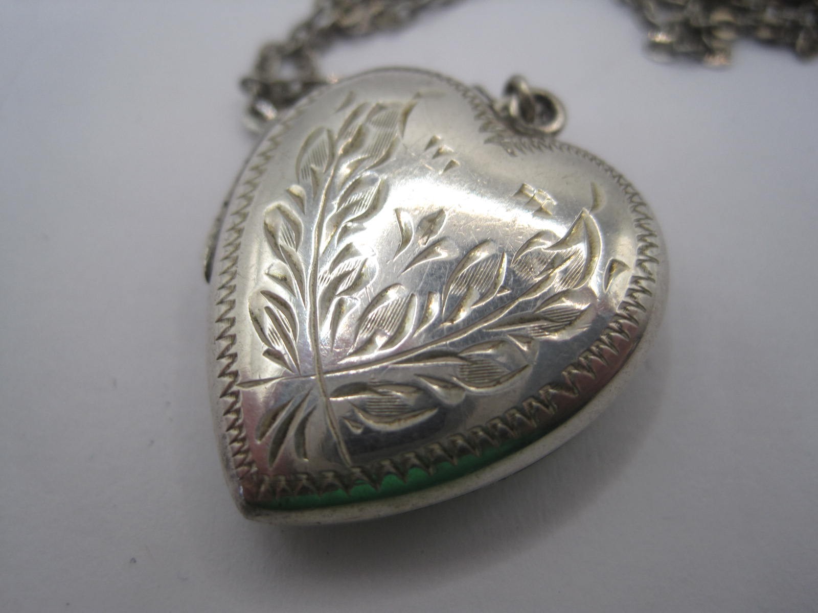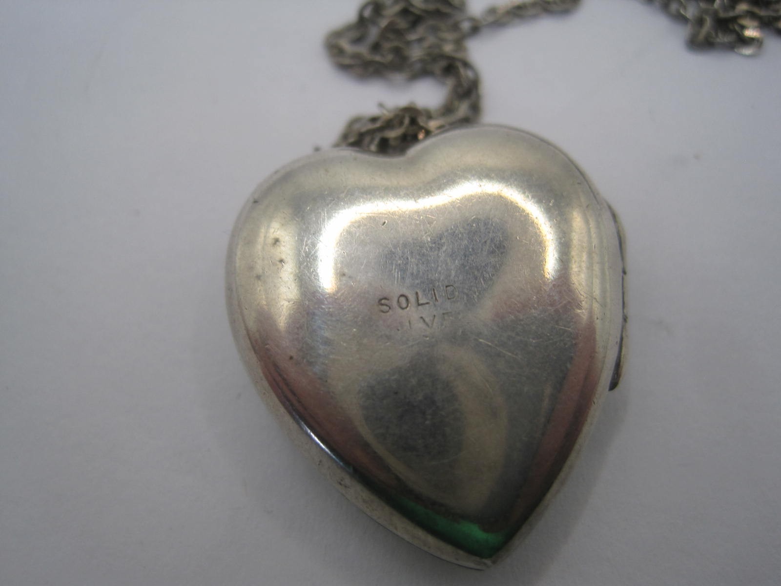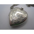 A heart-shaped locket with foliate engraving to one side, stamped solid silver, with trace chain stamped sterling to the clasp, combined gross weight of locket and chain approx. 6.4g