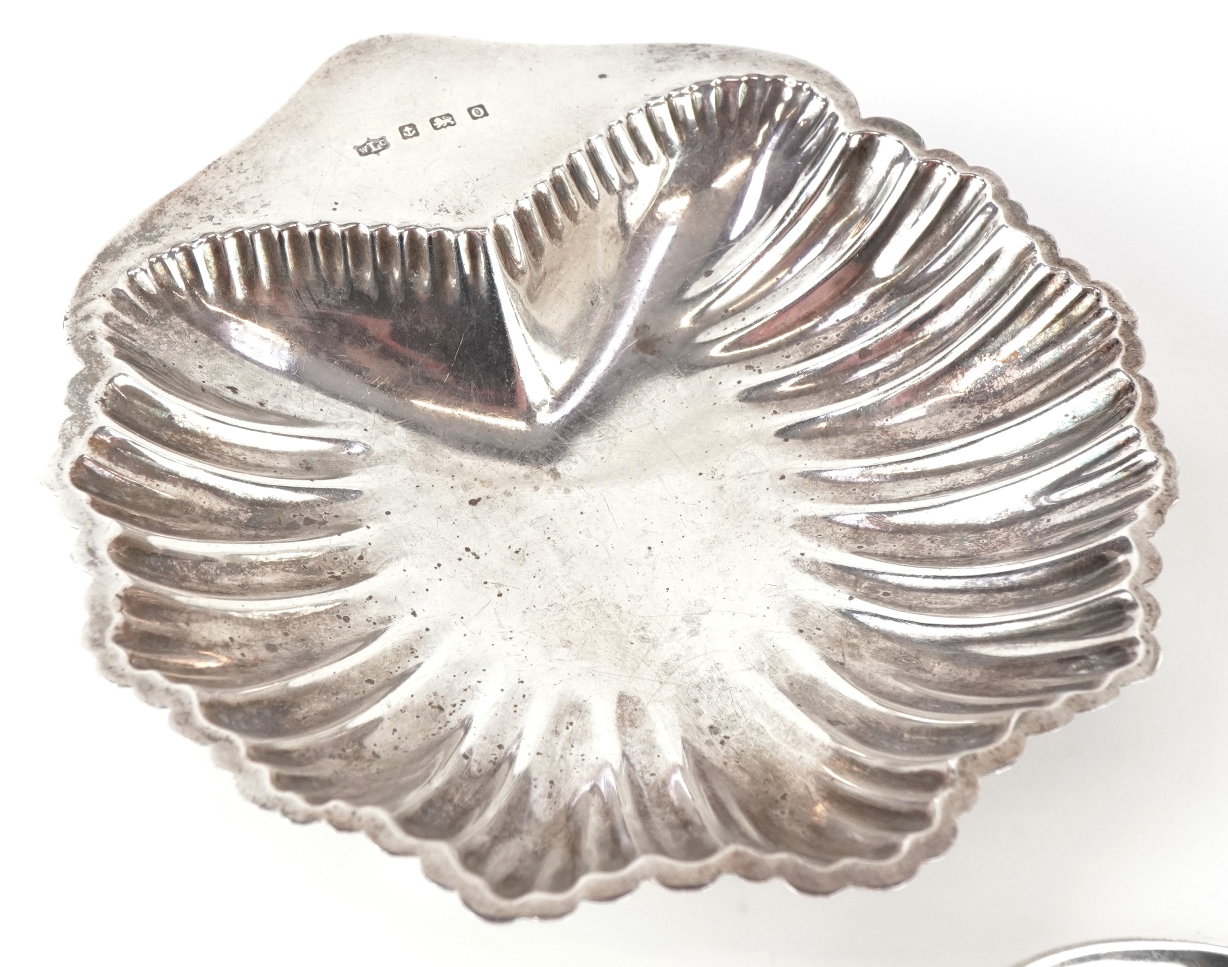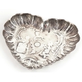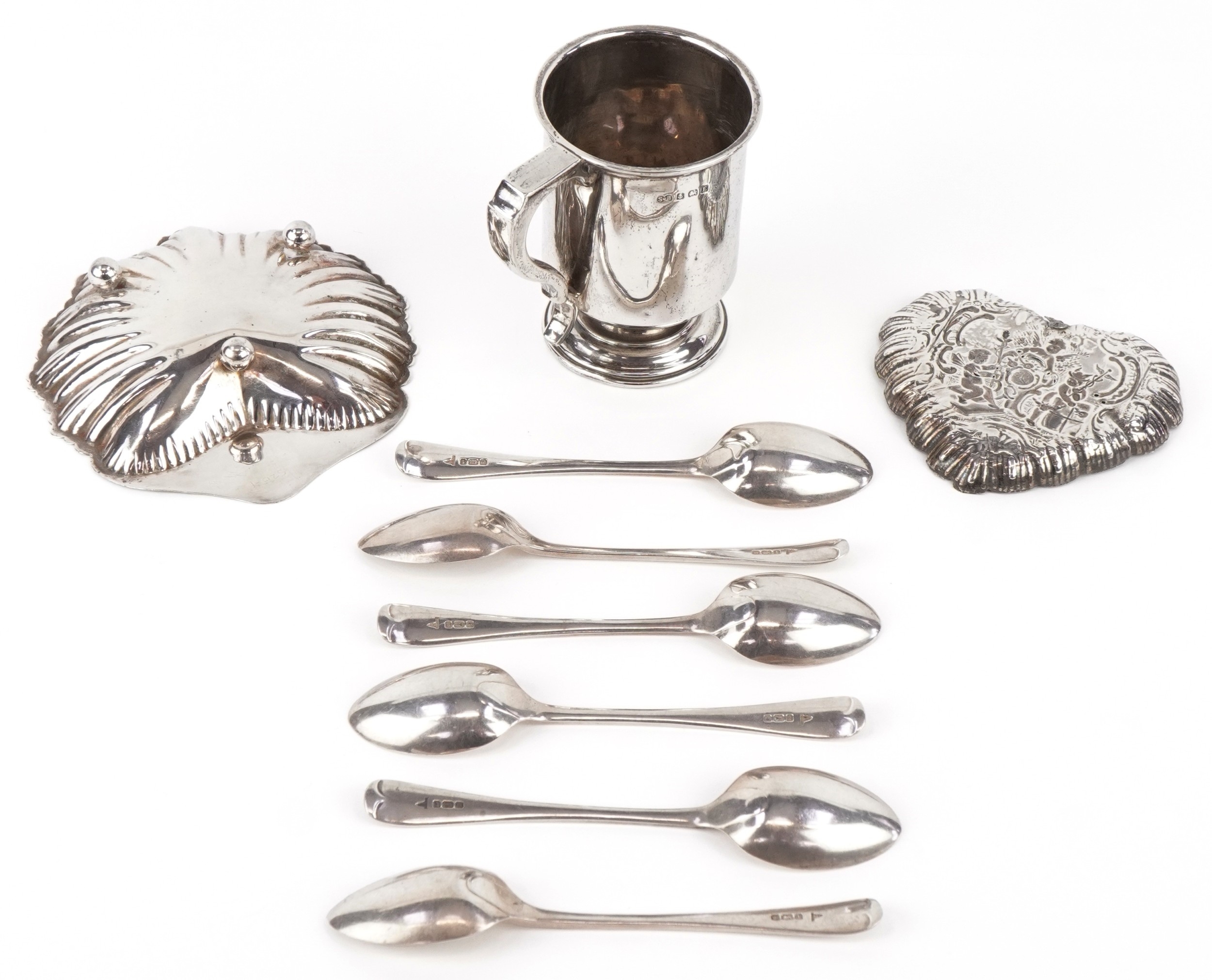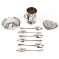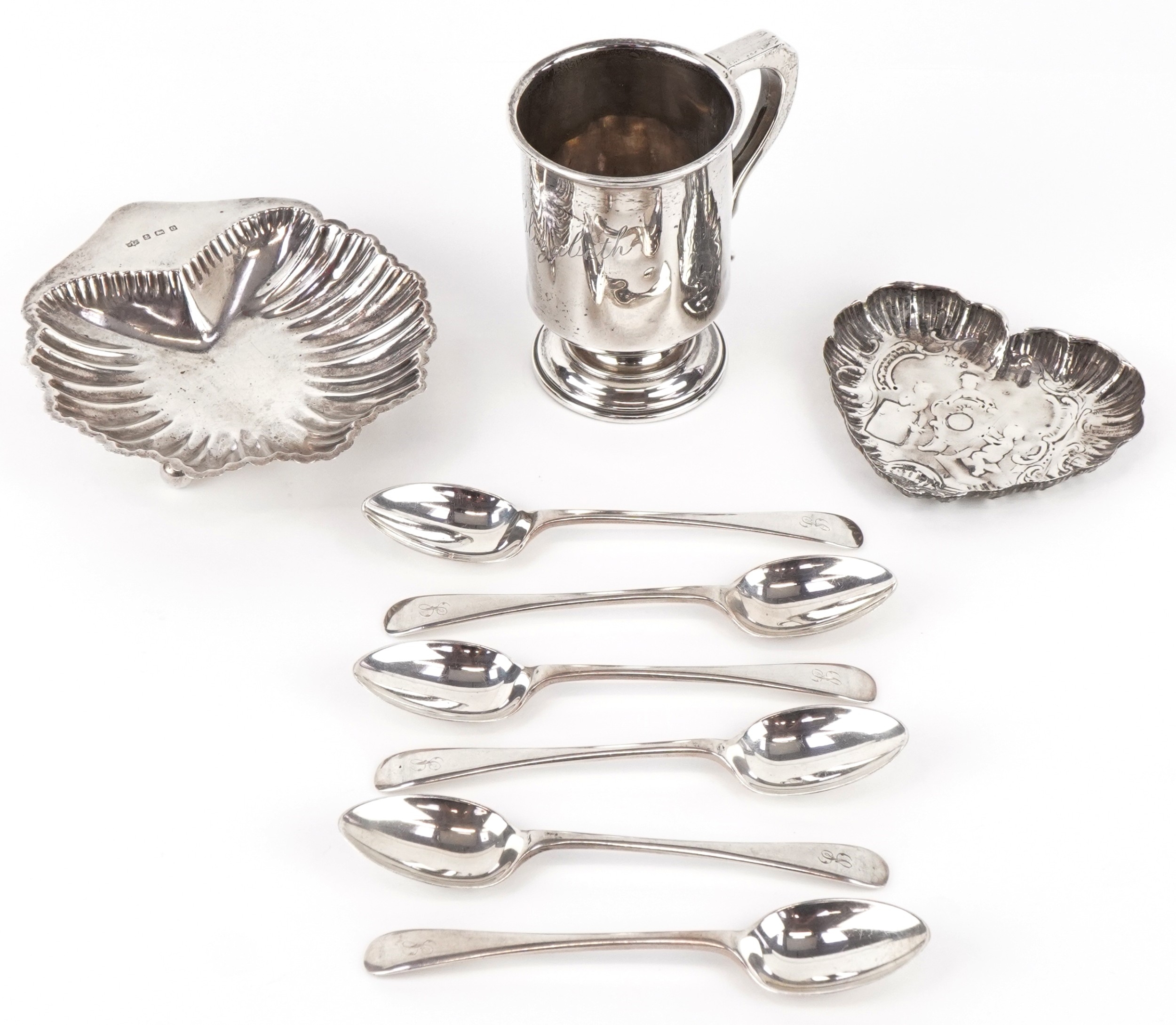 Victorian and later silver comprising a set of six teaspoons, christening tankard, shell shaped dish with ball feet and an embossed love heart dish, the largest 13cm in length, total 314.0g.