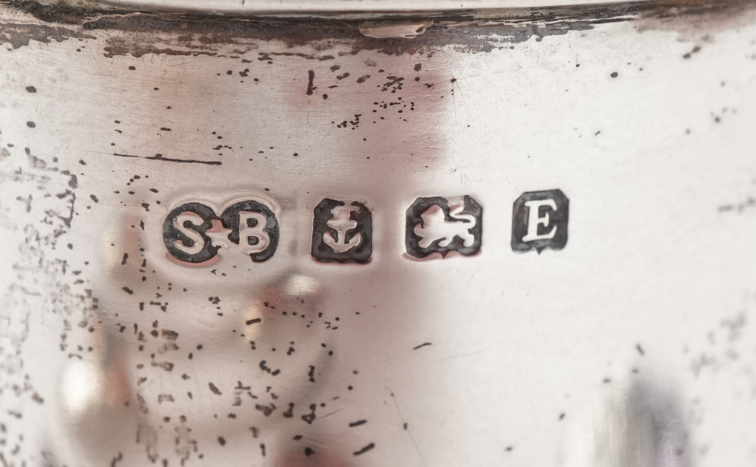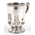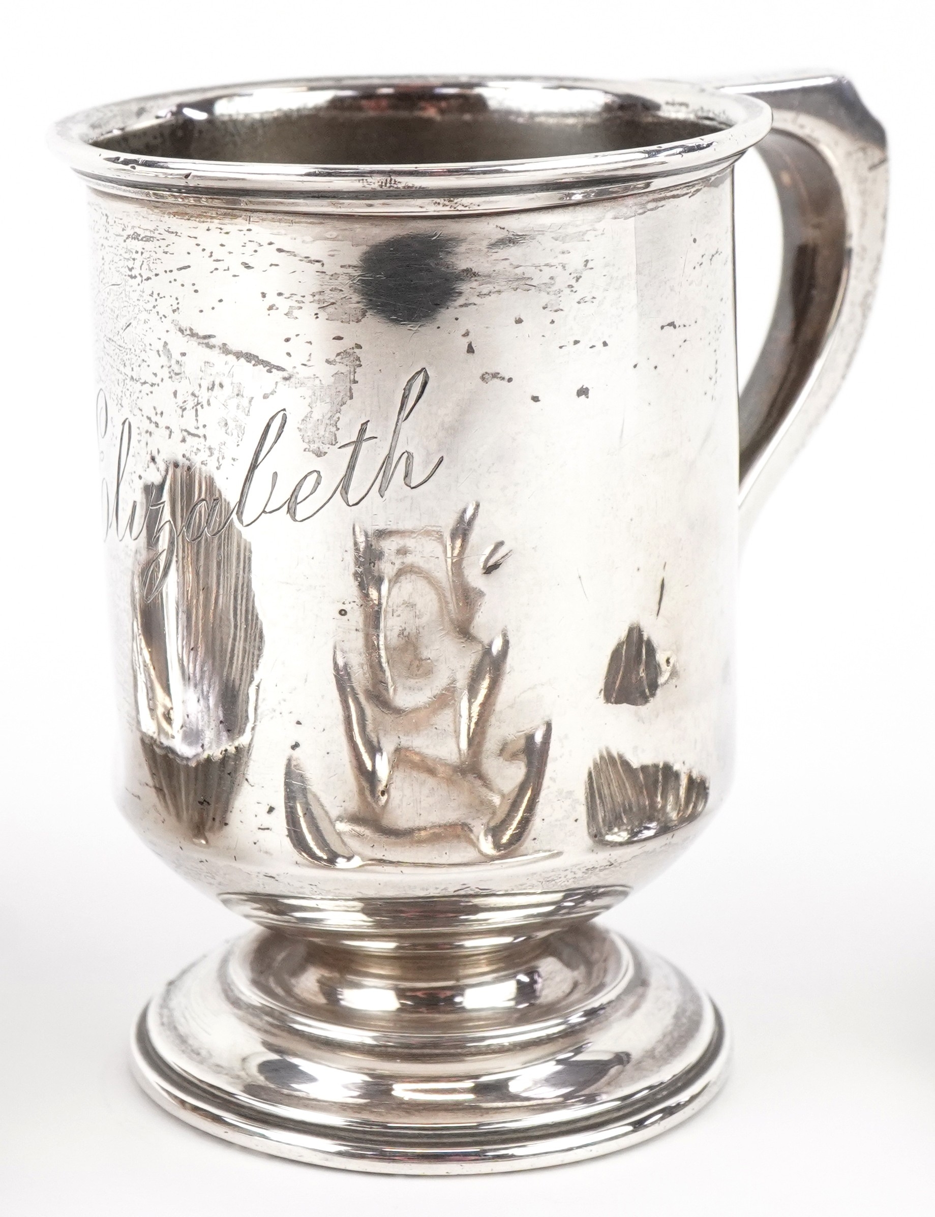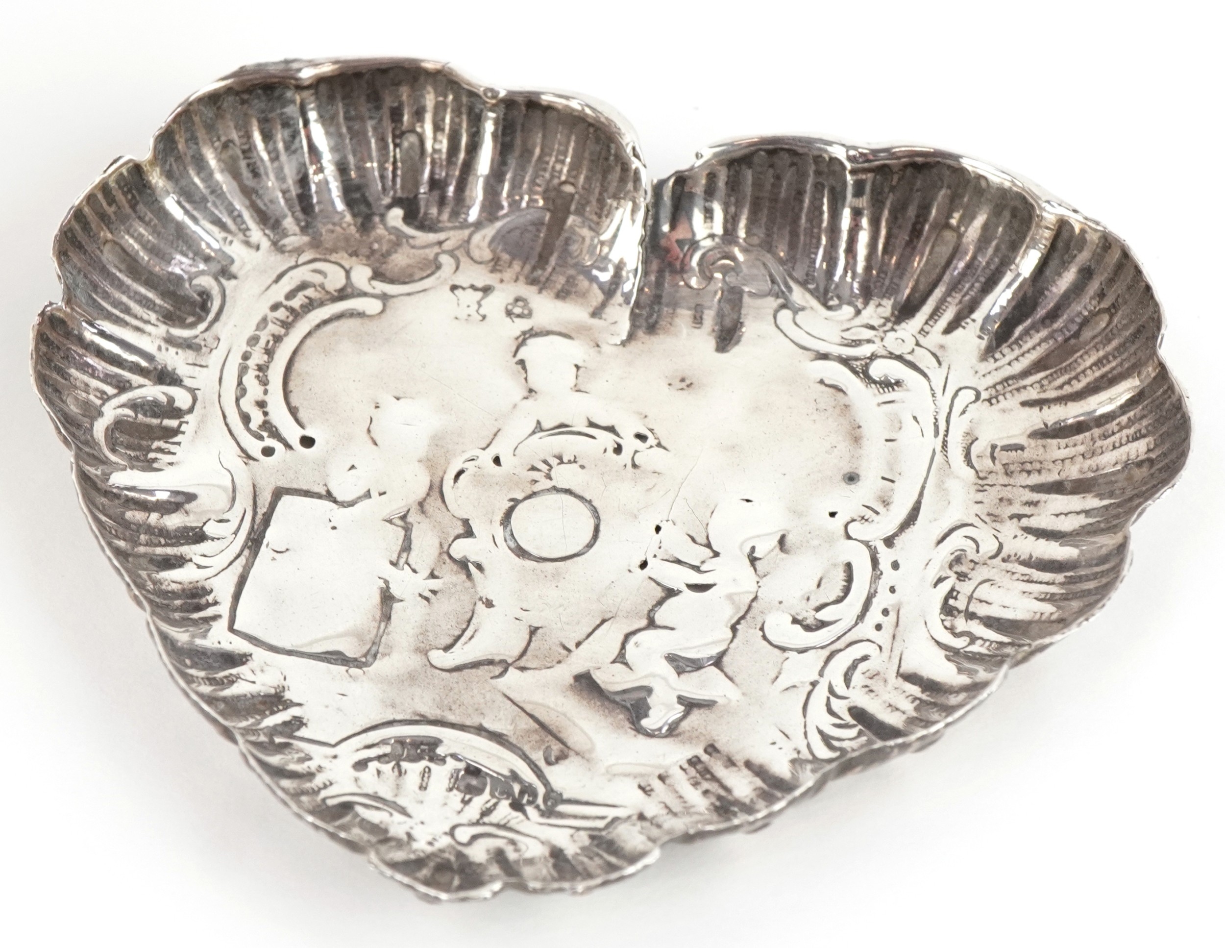 Victorian and later silver comprising a set of six teaspoons, christening tankard, shell shaped dish with ball feet and an embossed love heart dish, the largest 13cm in length, total 314.0g.